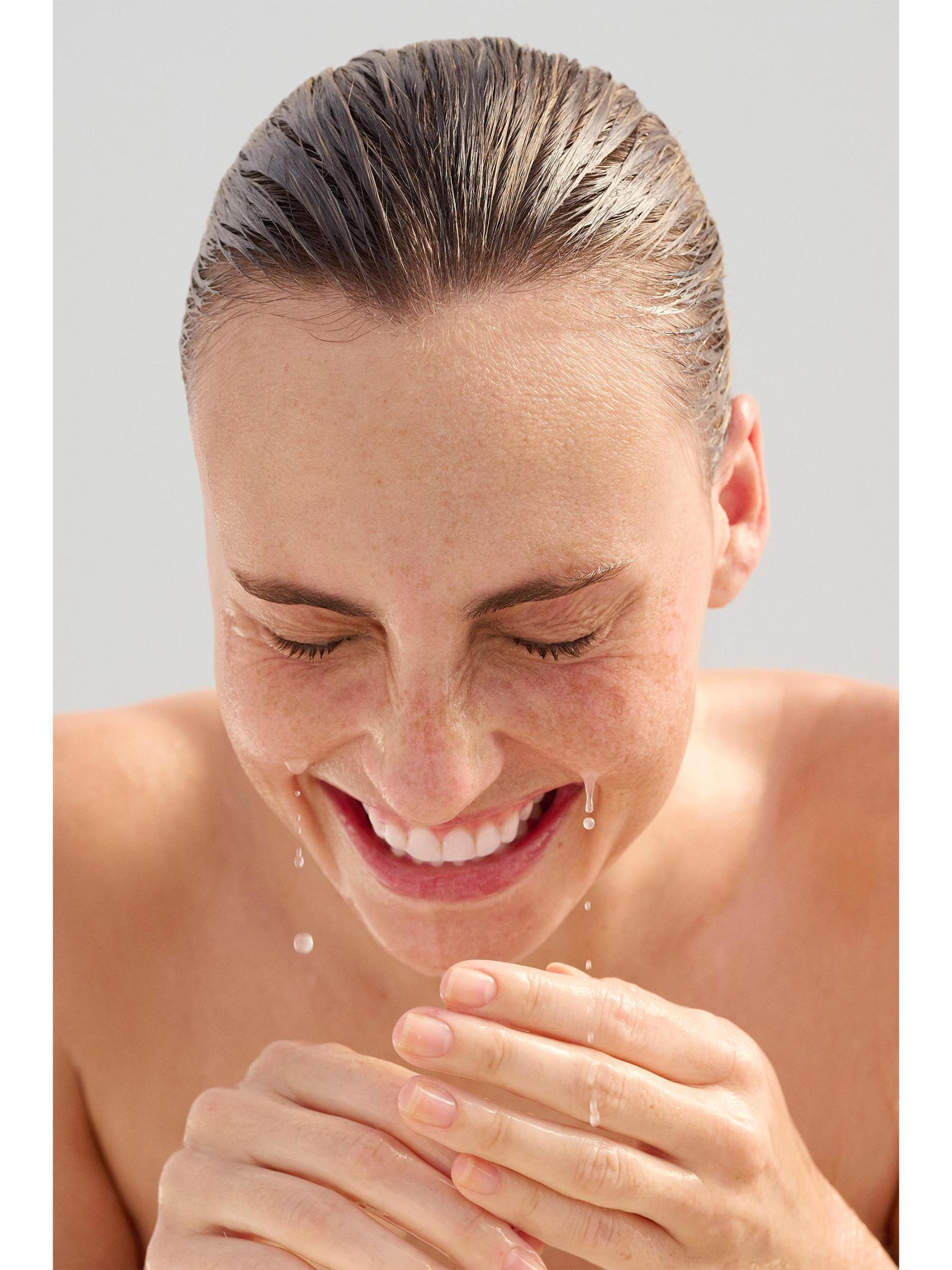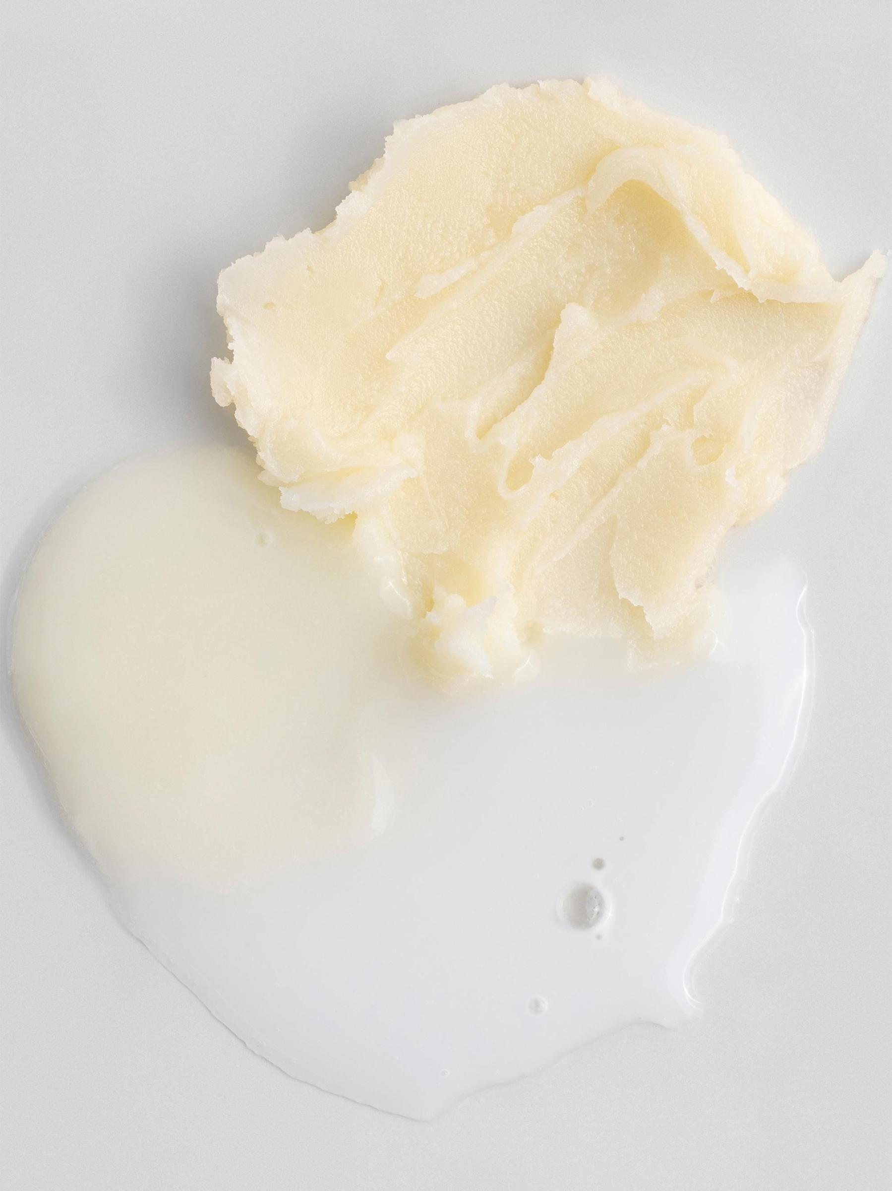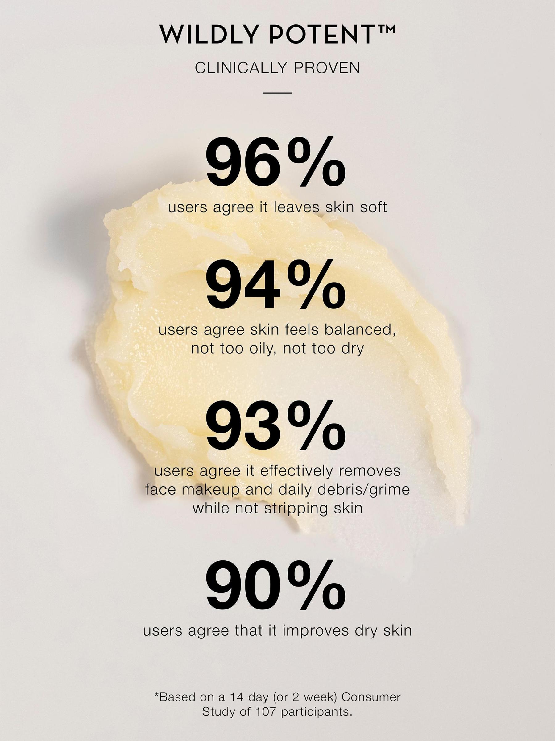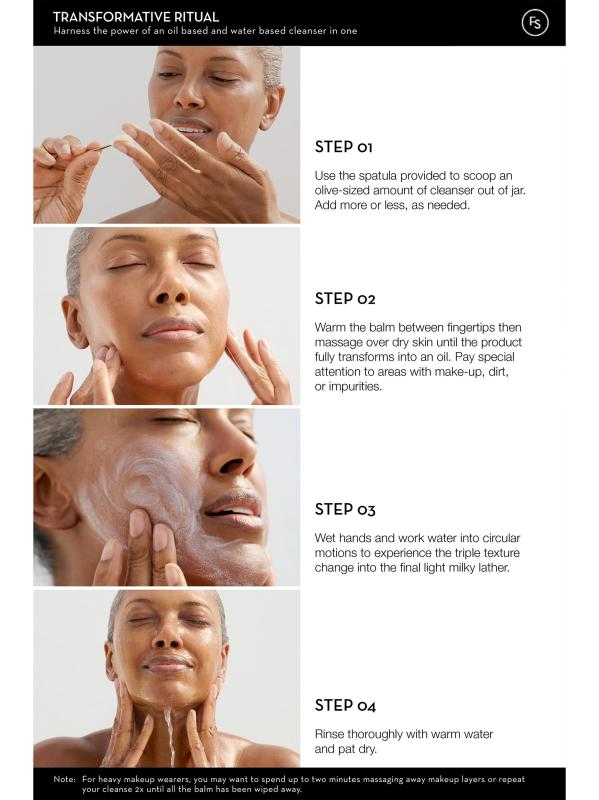 استخدم الملعقة المتوفرة لاستخراج كمية بحجم الزيتون من المنظف من الجرة. أضف أكثر أو أقل حسب الحاجة. قم بتسخين البلسم بين أطراف الأصابع ثم قم بتدليك البشرة الجافة حتى يتحول المنتج بالكامل إلى زيت. انتبه بشكل خاص للمناطق التي بها مكياج أو أوساخ أو شوائب. لإزالة المنتج، اختاري بين طريقتين: الطريقة الأولى، بللي يديك وماء العمل بحركات دائرية لتجربة تغيير الملمس الثلاثي إلى رغوة حليبية خفيفة نهائية. اشطفها جيدًا بالماء الدافئ واتركها حتى تجف. الطريقة الثانية، انقعي منشفة في ماء دافئ وضعيها برفق على البشرة بحركات دائرية لإزالة الشوائب والبلسم الزائد، ثم جففيها.