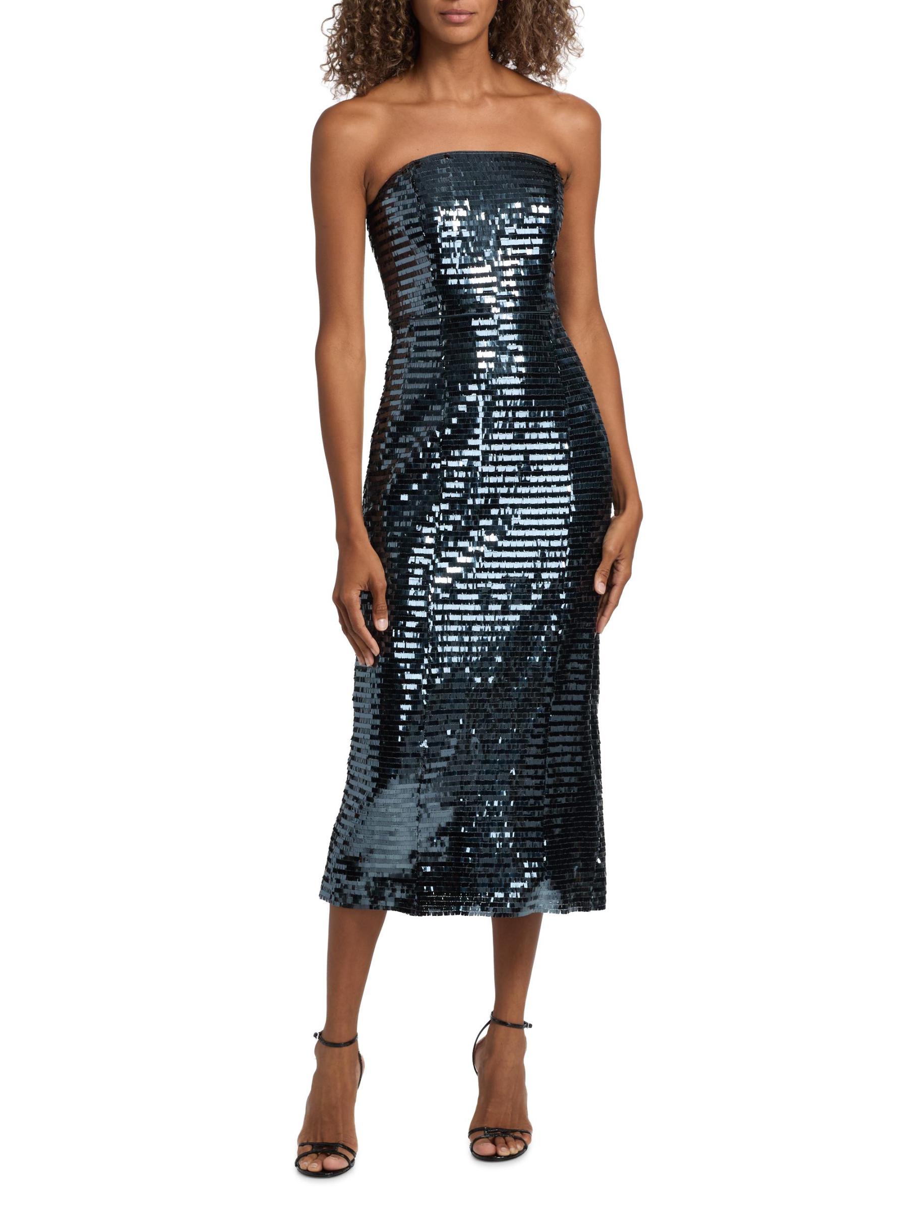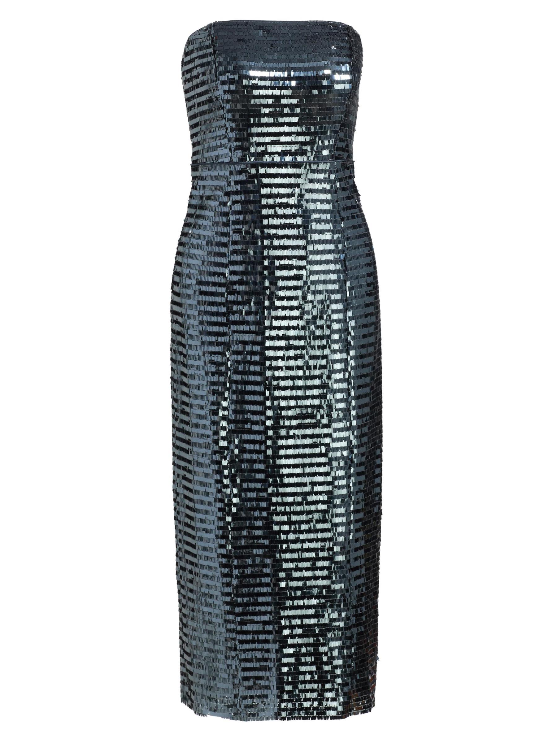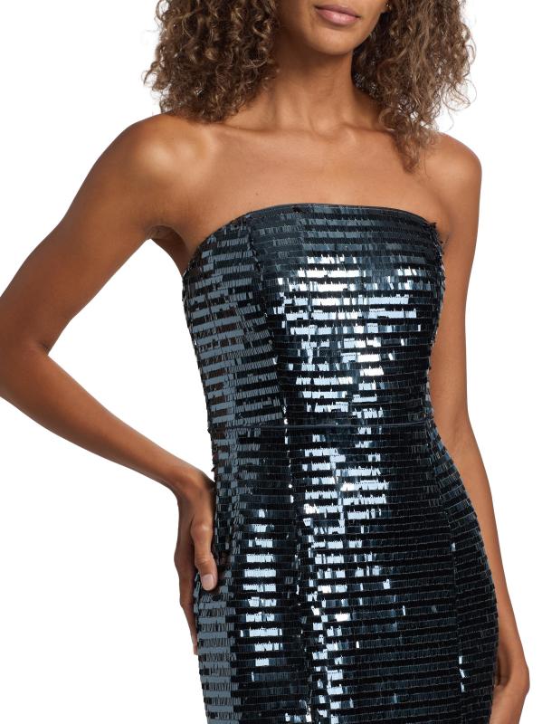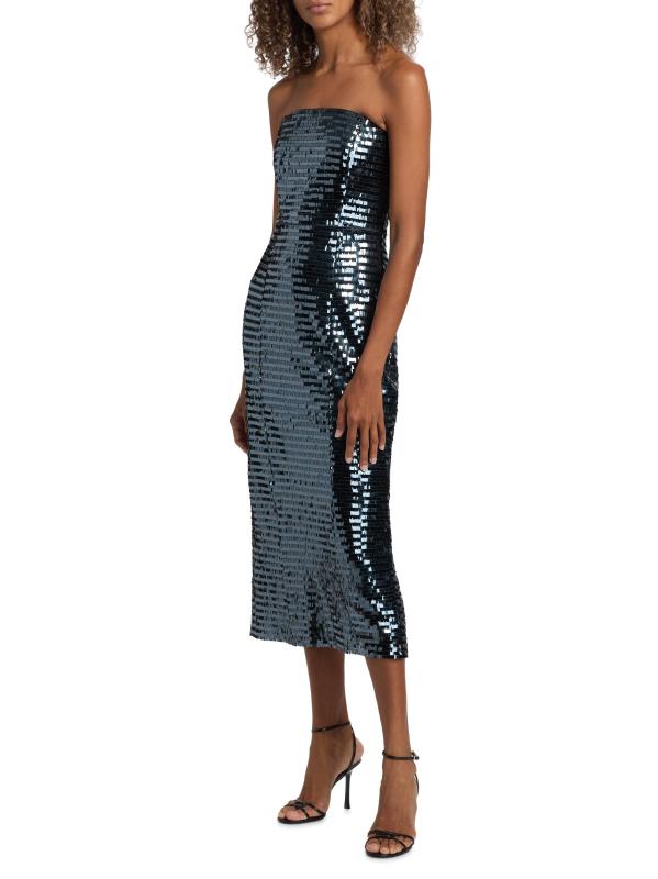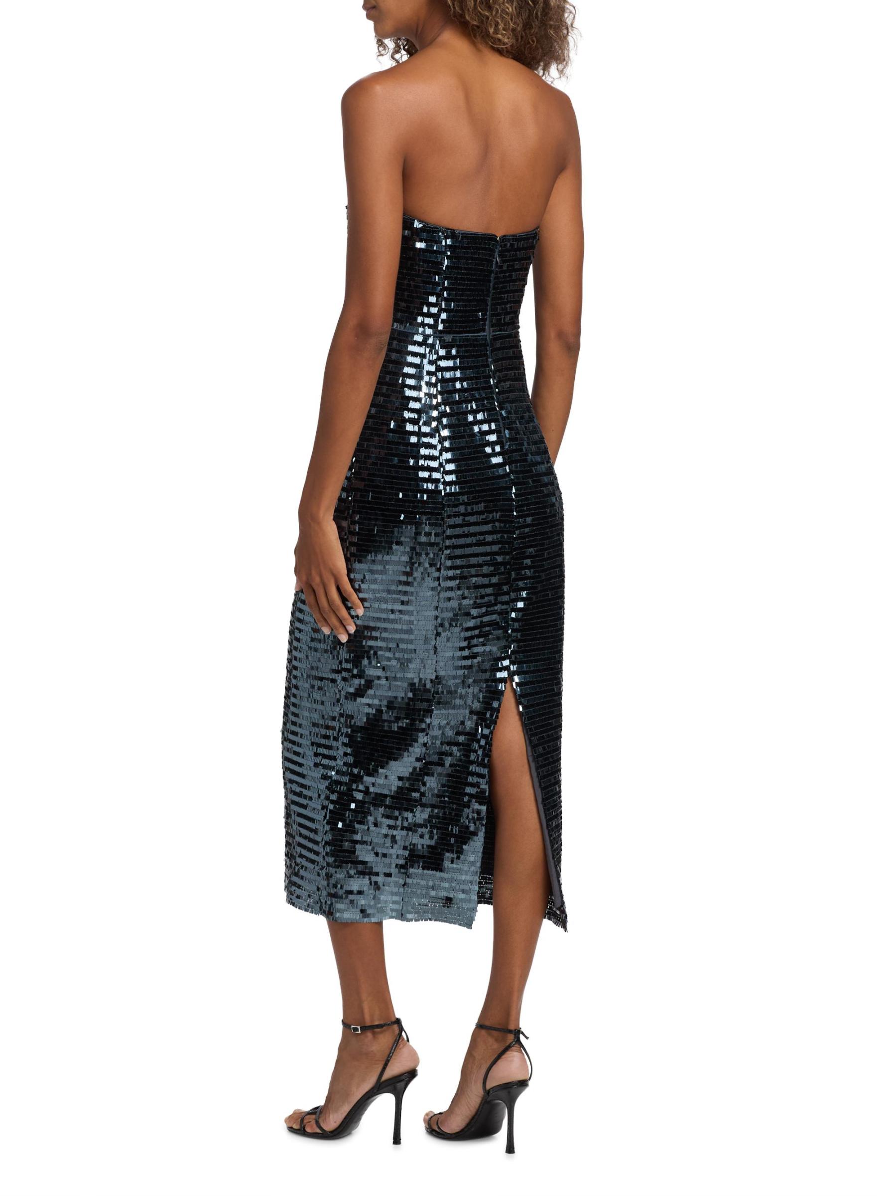 فستان Circe متوسط الطول بدون حمالات من Cami NYC مزين بالترتر المستطيل ويتميز بطمي في الخلف.