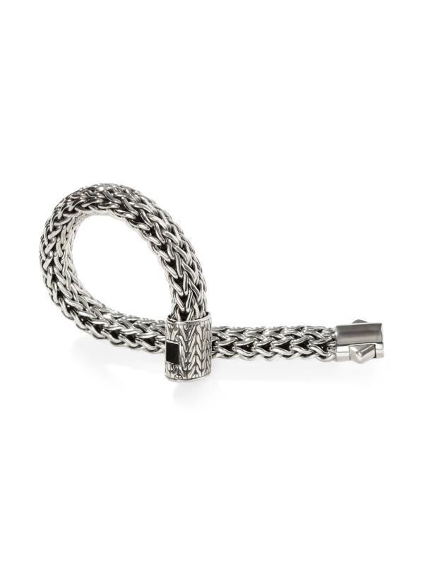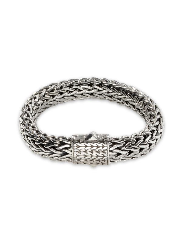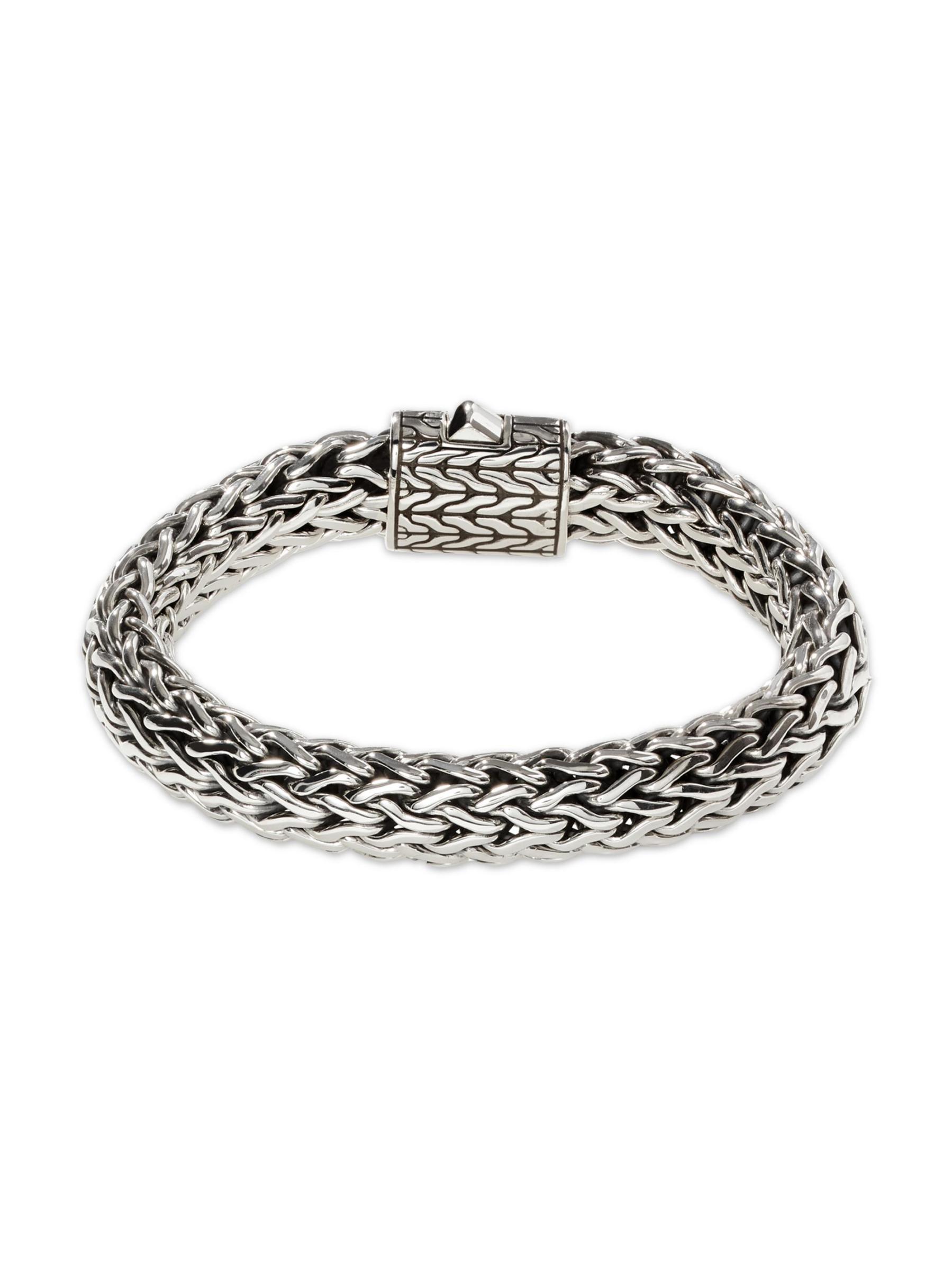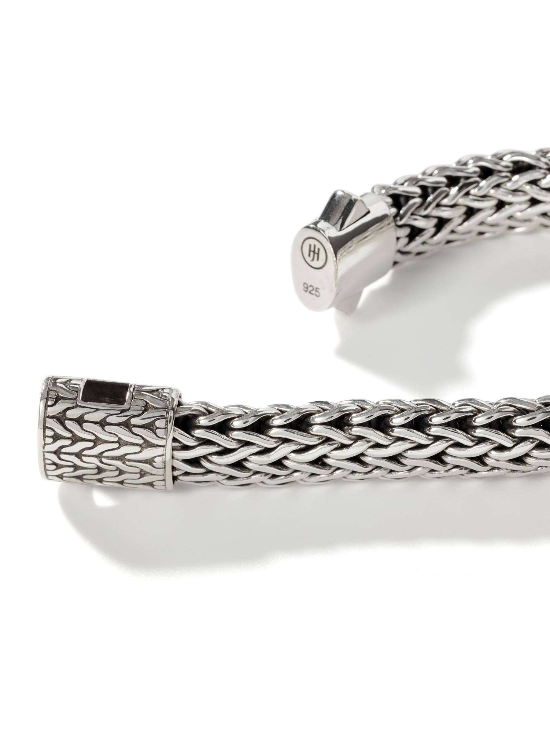 من مجموعة السلسلة الكلاسيكية. سوار جون هاردي المميز على شكل سلسلة، منسوج بشكل معقد من الفضة الإسترلينية، يُغلق بمشبك أسطواني بتصميم محفور متناسق.