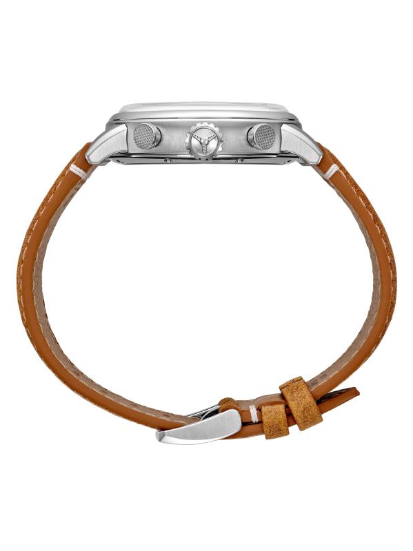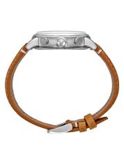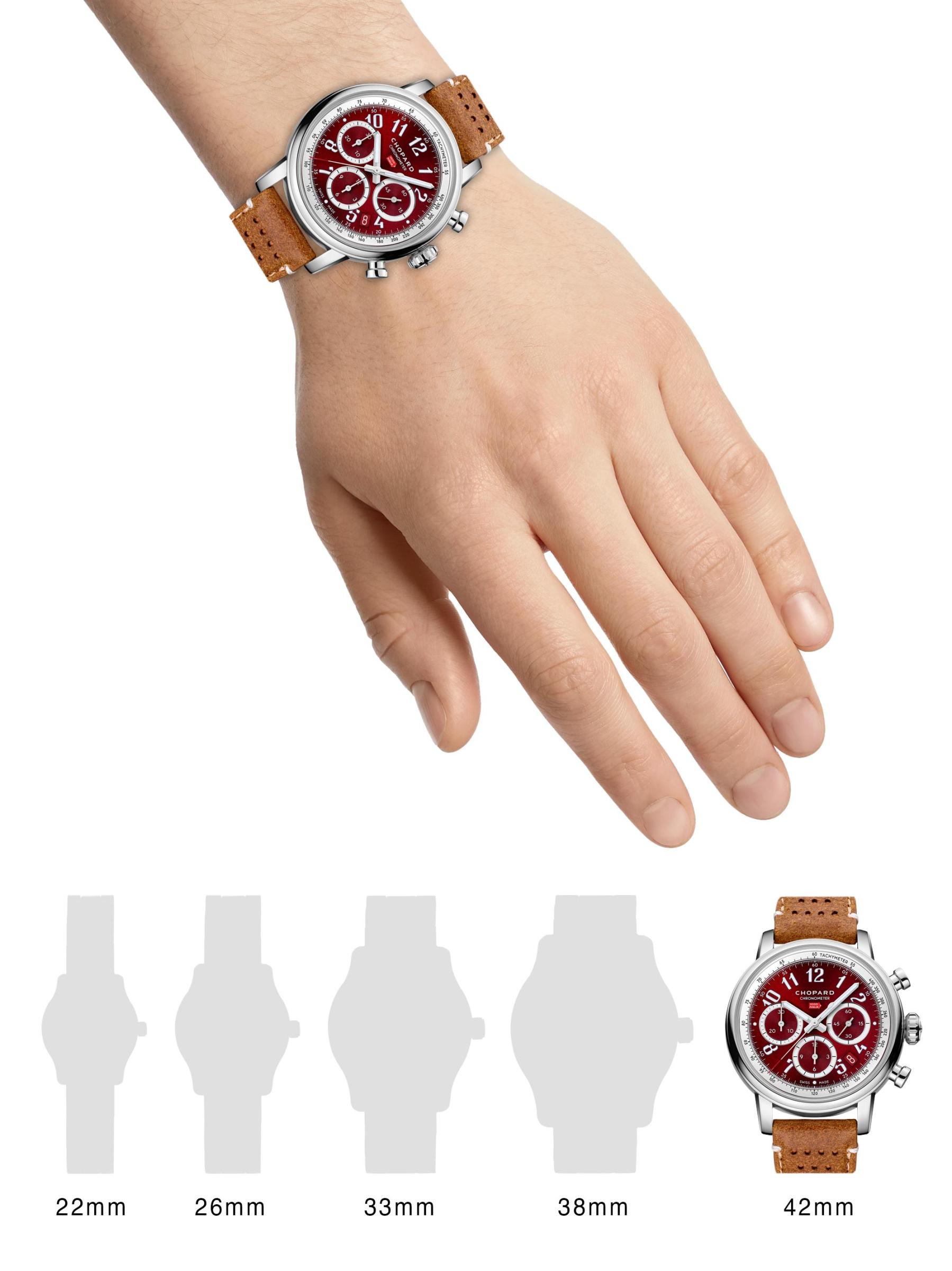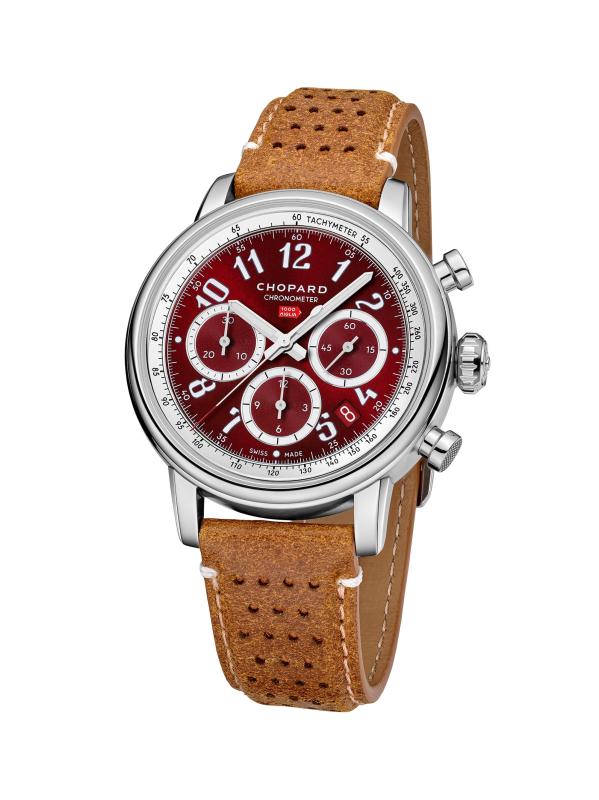 من مجموعة السباقات الكلاسيكية. تتميز ساعة Chopard المصنوعة من الفولاذ المقاوم للصدأ بقرص أحمر مع ثلاثة أقراص فرعية ونافذة لعرض التاريخ. تم تزيين هذه الساعة بحزام جلدي بني.