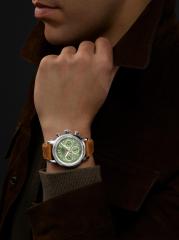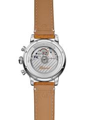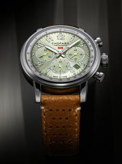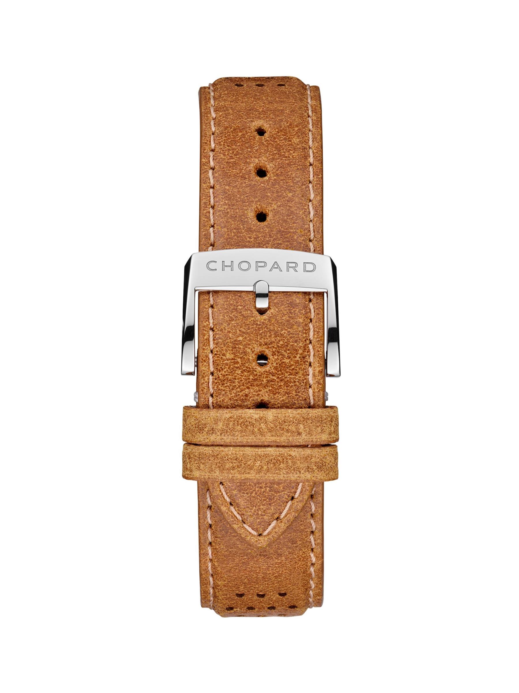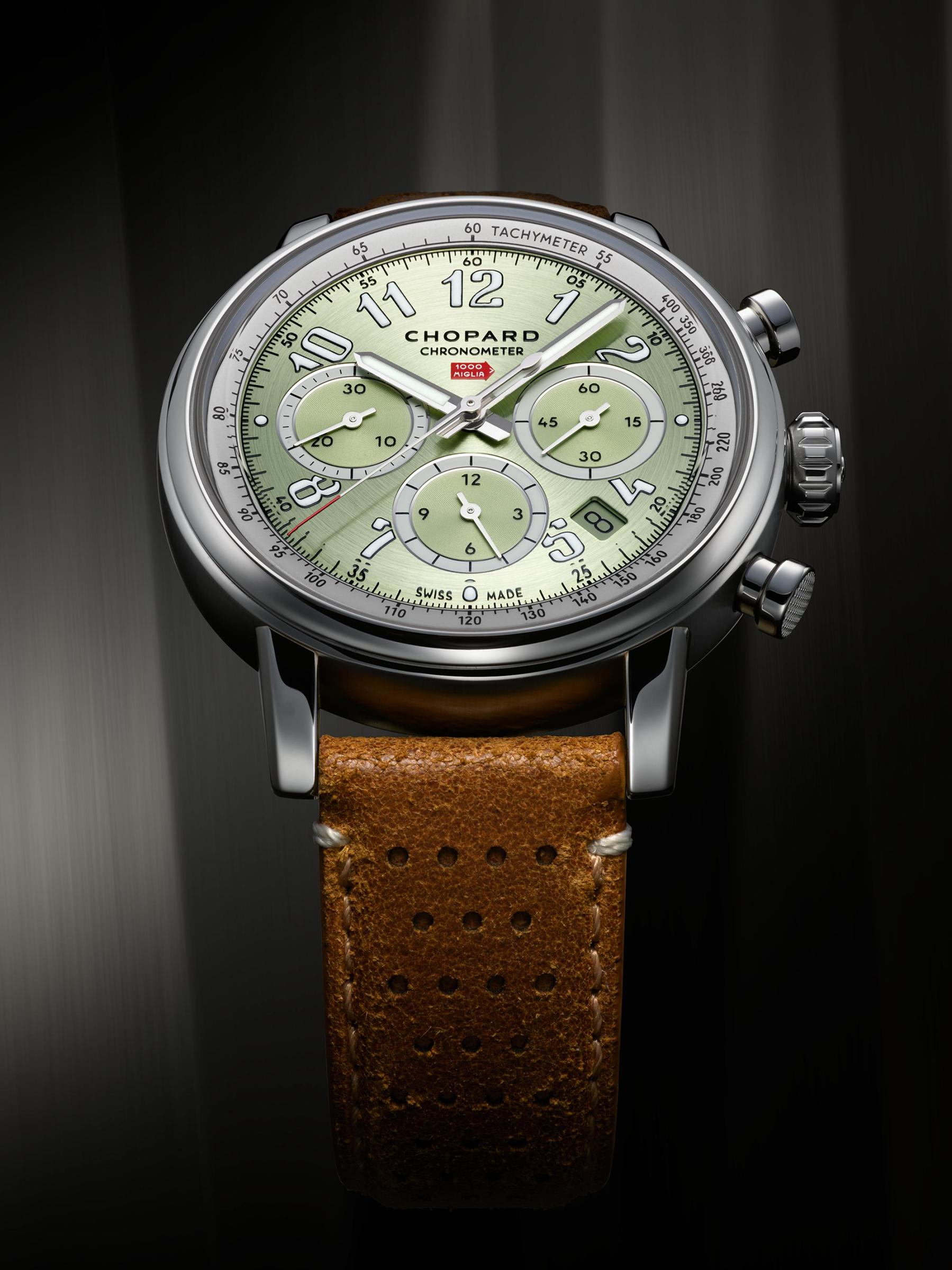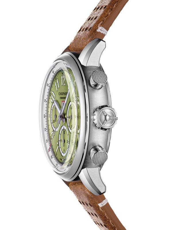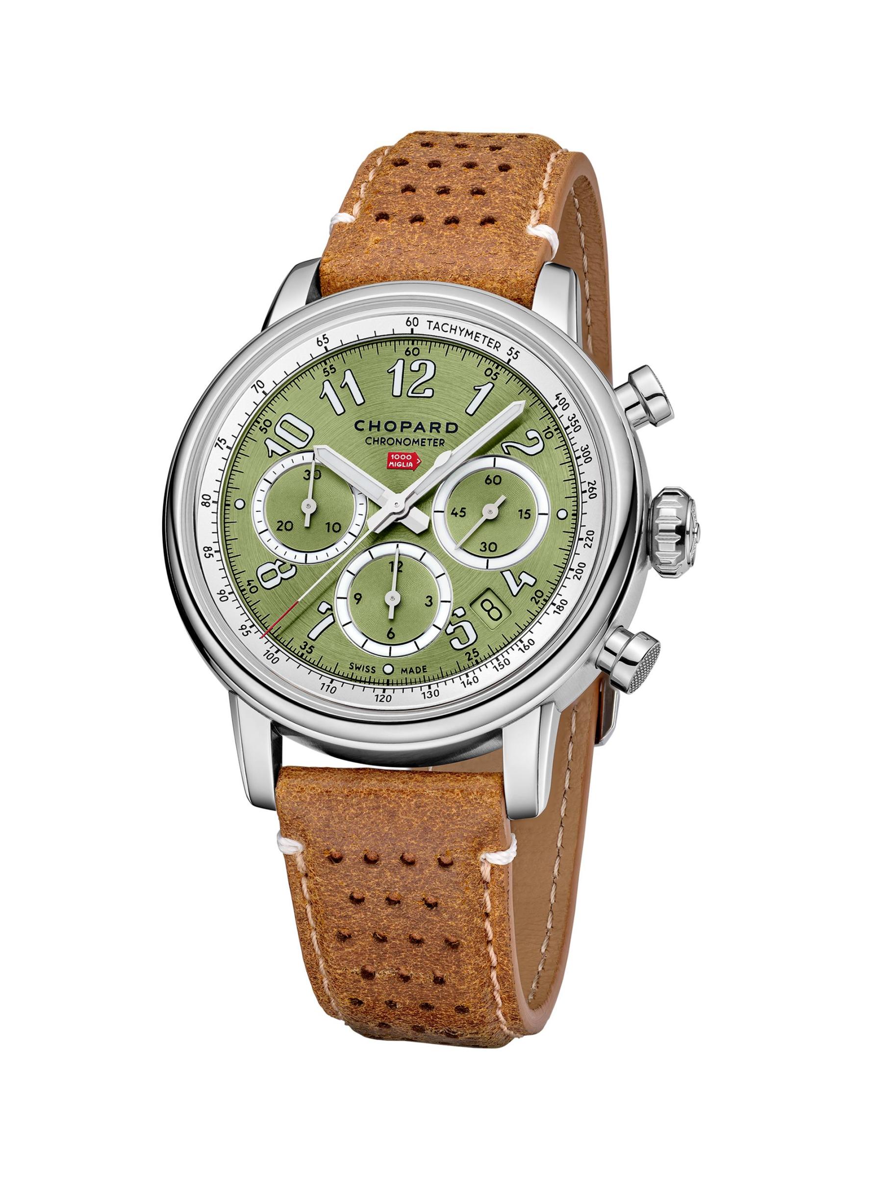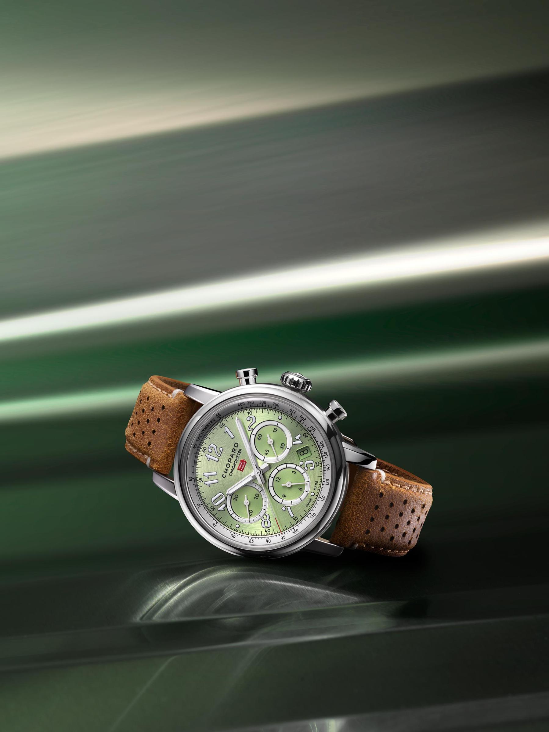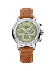 من مجموعة السباقات الكلاسيكية. تتميز ساعة Chopard المصنوعة من الفولاذ المقاوم للصدأ بقرص أخضر مع ثلاثة أقراص فرعية ونافذة لعرض التاريخ. تم تزيين هذه الساعة بحزام جلدي بني.