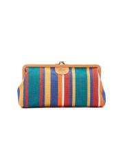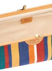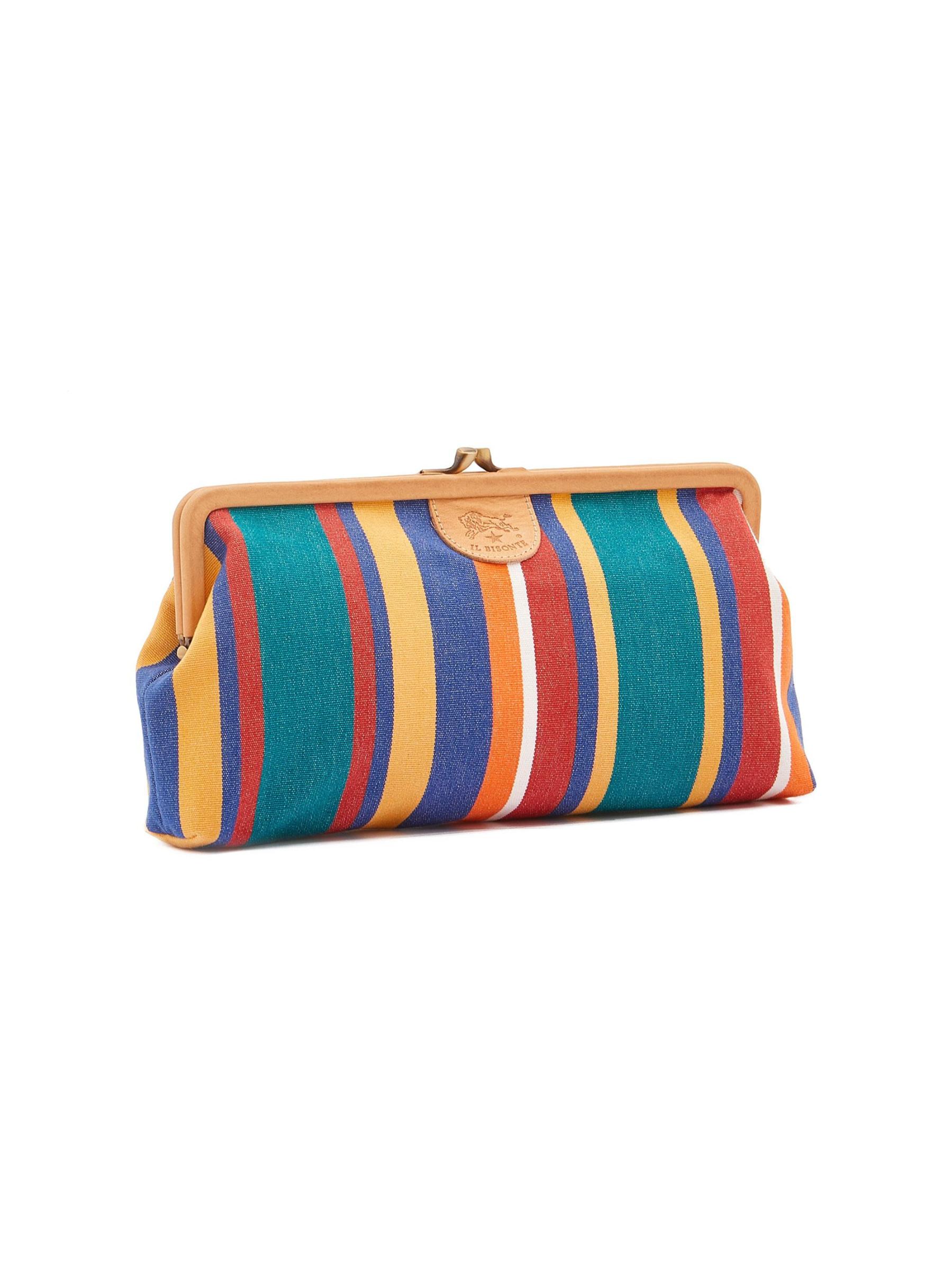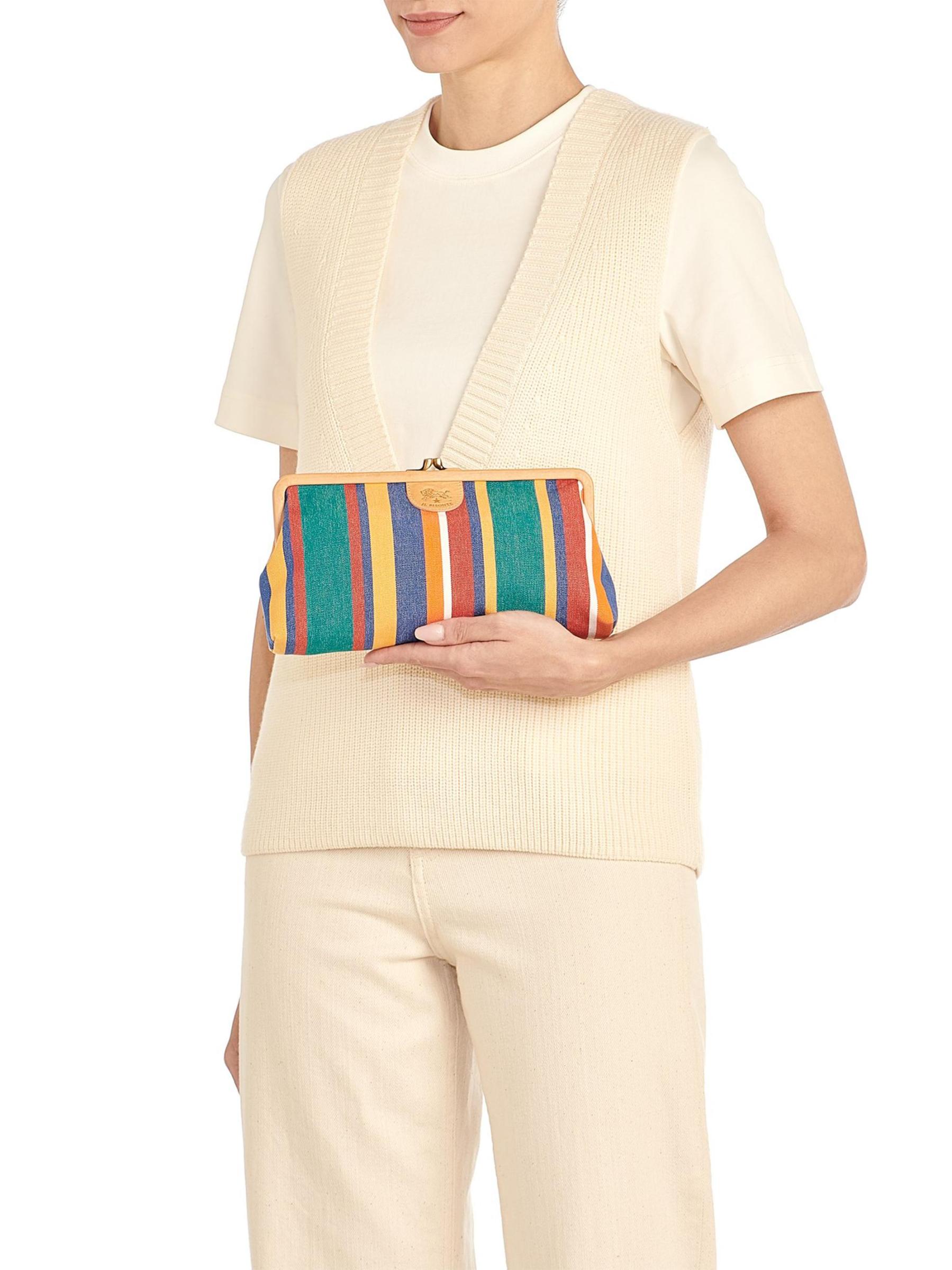 من مجموعة مانويلا. تتميّز حقيبة اليد المصنوعة من القماش المقلّم من II Bisonte بتصميم كلاسيكي مزوّد بقفل على شكل قبلة مزوّد بقفل كشكش مستوحى من الطراز القديم، وزخرفة جلدية مدبوغة باللون النباتي، وجيب داخلي مفتوح.