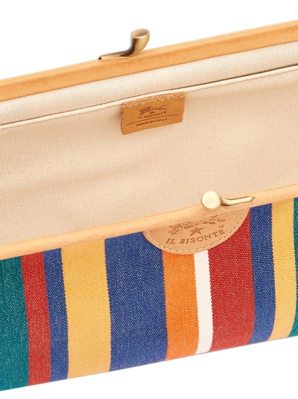 من مجموعة مانويلا. تتميّز حقيبة اليد المصنوعة من القماش المقلّم من II Bisonte بتصميم كلاسيكي مزوّد بقفل على شكل قبلة مزوّد بقفل كشكش مستوحى من الطراز القديم، وزخرفة جلدية مدبوغة باللون النباتي، وجيب داخلي مفتوح.مصنوع من جلد مدبوغ بشكل مسؤول إغلاق بقفل قبلة جيب داخلي مفتوح قطع ذهبية بطاقة الأصالة متضمنة تتضمن حقيبة الغبار قطن بنسبة 100% الزخرفة: جلد صُنع في إيطاليا