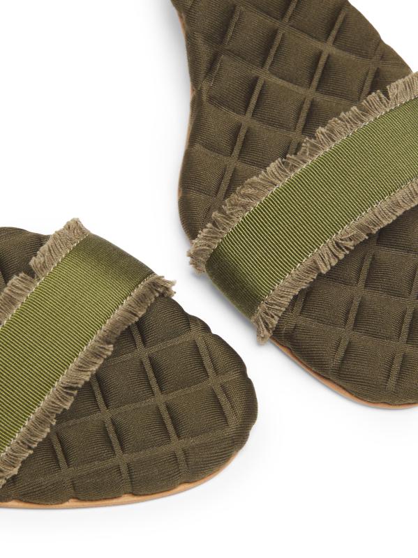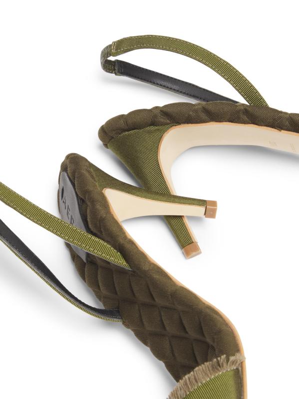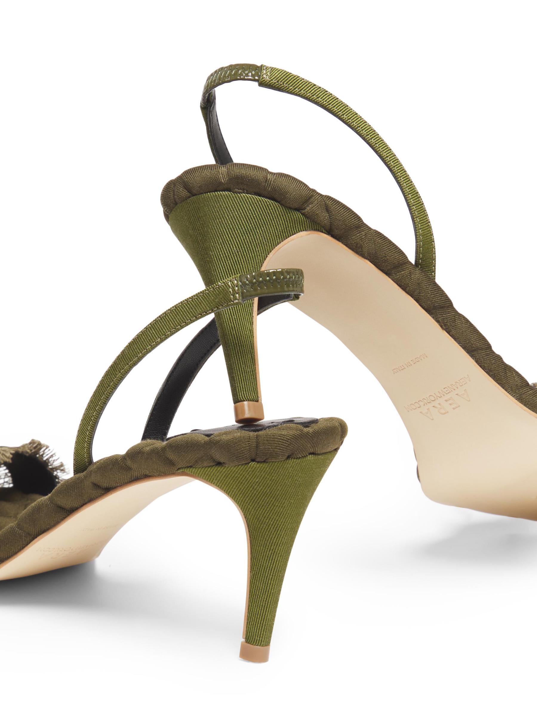 صُنع هذا الصندل من Aera يدويًا من قبل حرفيين في فينيتو بإيطاليا من مواد نباتية، ويتميز بتصميم سلينغ باك وبطانة مبطنة مميزة. تم الانتهاء من هذا التصميم بأحزمة من الحرير المحفور وكعب ستيليتو أنيق.