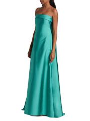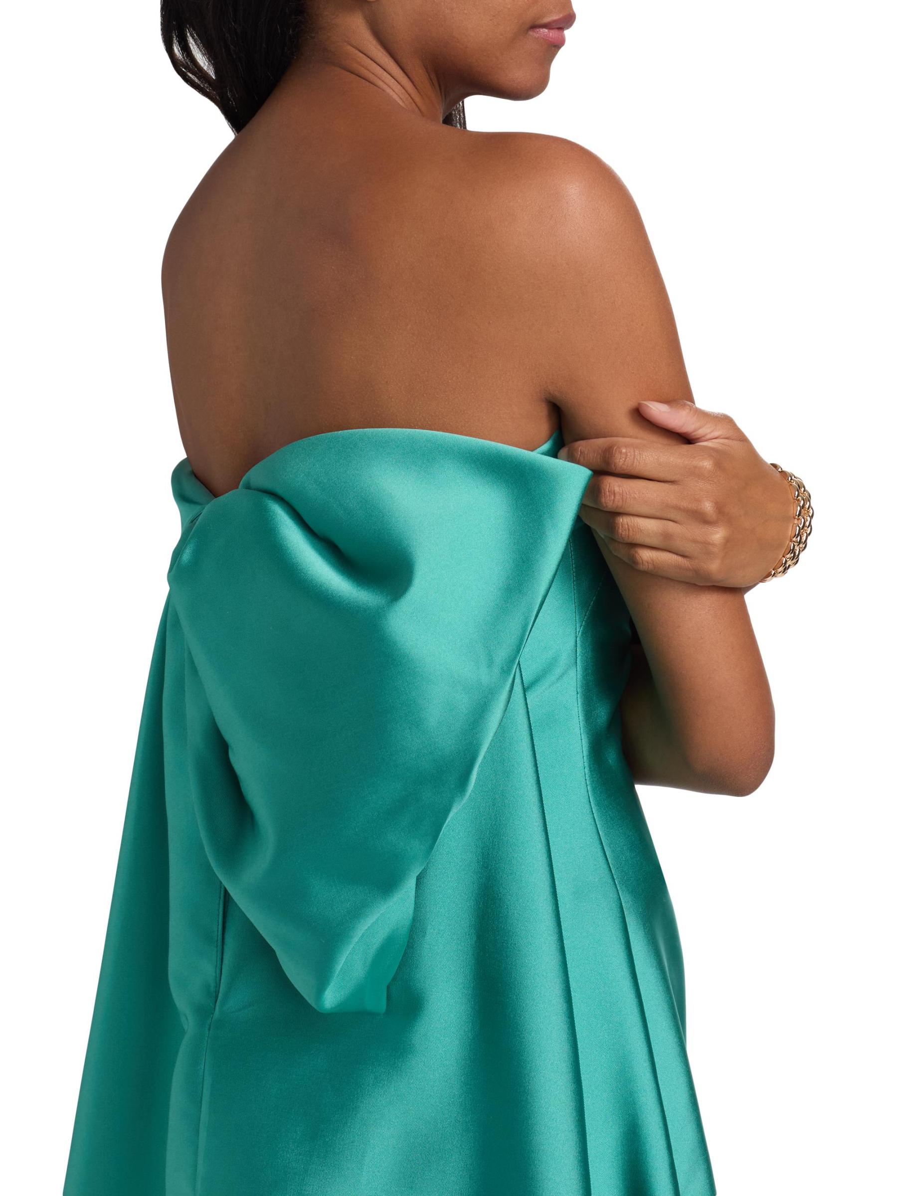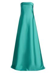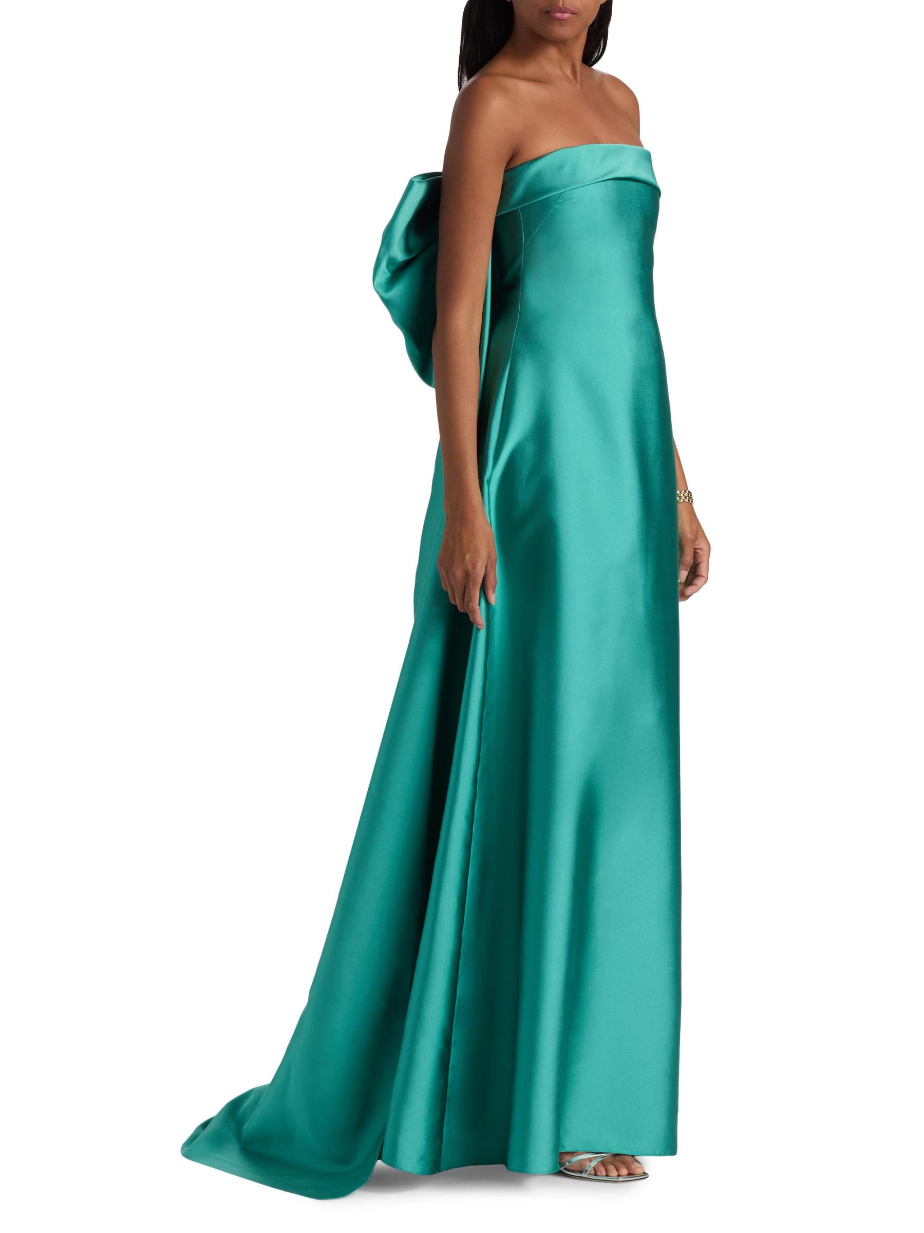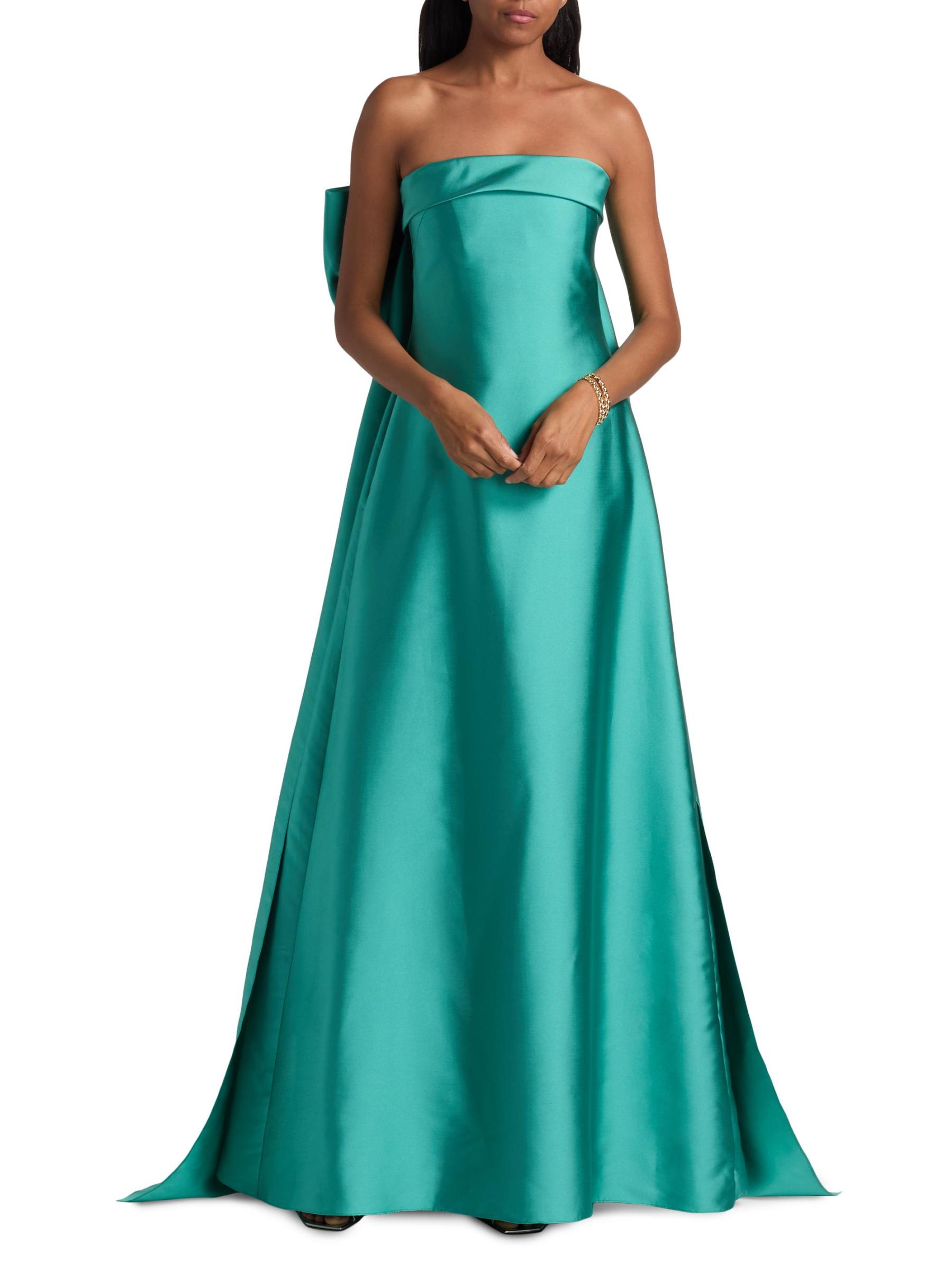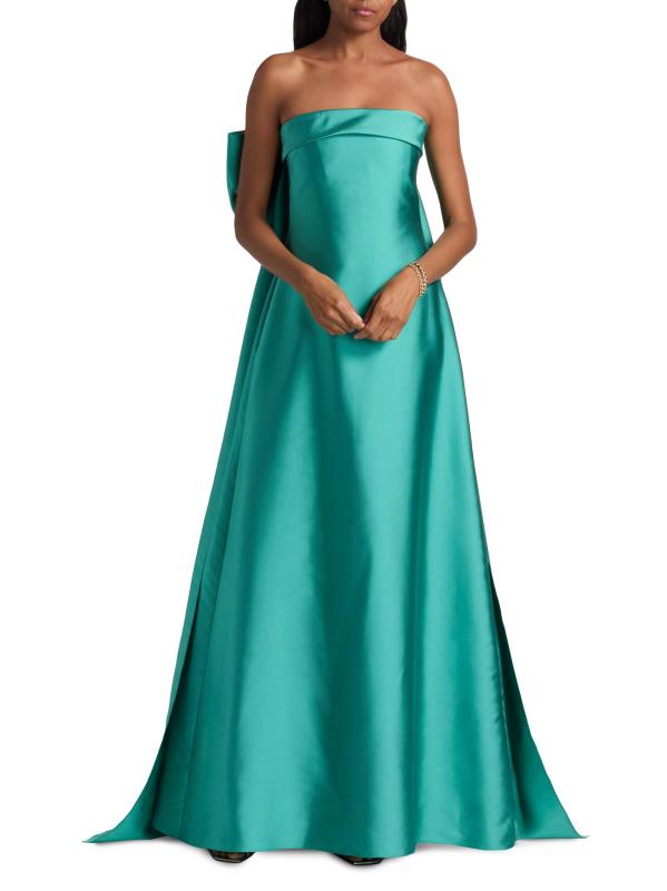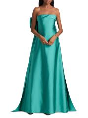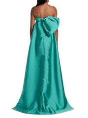 يتميز فستان كلوديا بتصميم على شكل حرف A بدون حمالات من Atelier Prabal Gurung، والمصنوع من الساتان اللامع، بتقويرة مستقيمة قابلة للطي مع تفاصيل منحوتة كبيرة الحجم على شكل نصف فيونكة في الخلف.