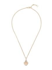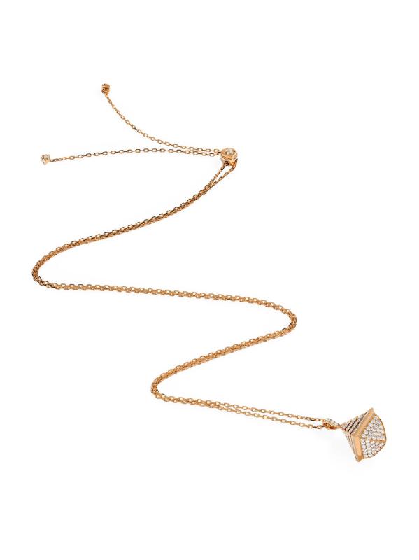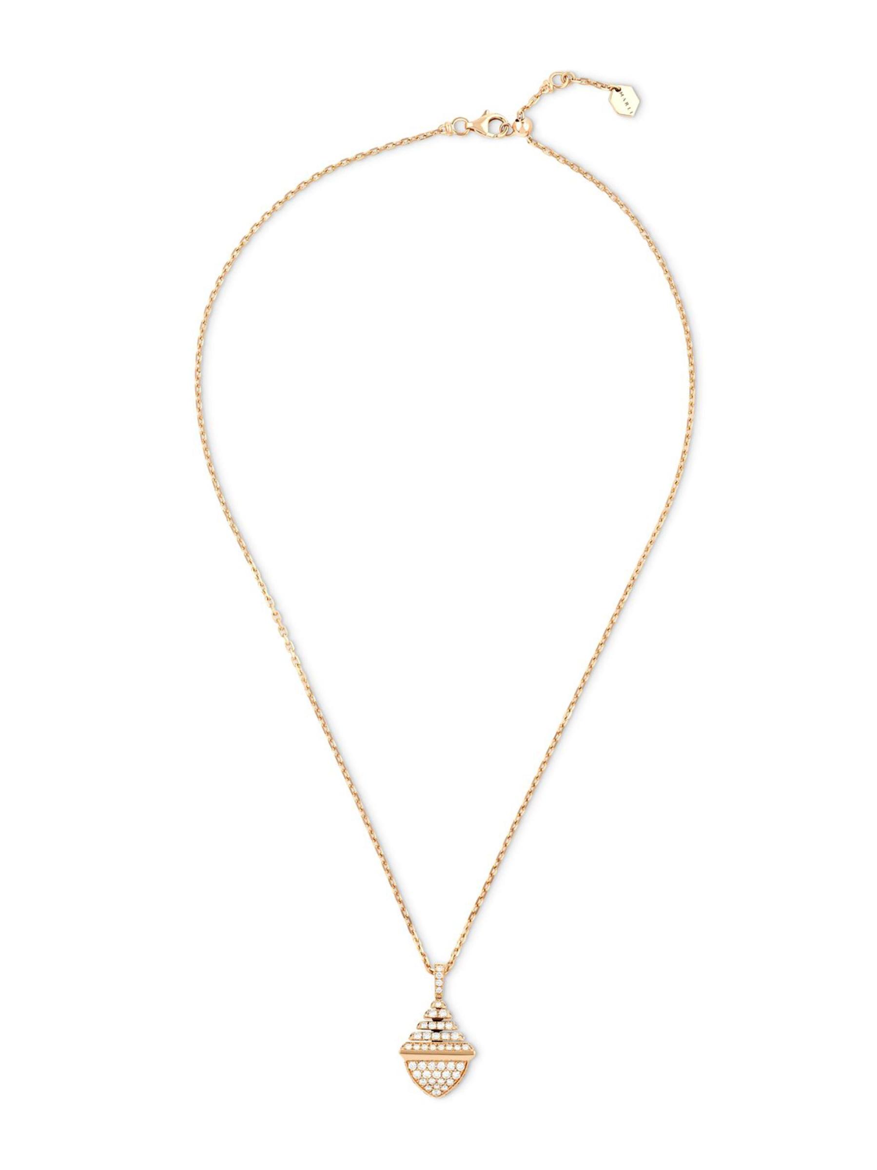 من مجموعة كليو من مارلي. قلادة MARLI مصنوعة يدويًا من الذهب الوردي عيار 18 قيراطًا، وتتميز بقلادة على شكل هرم مرصعة بالألماس اللامع. هذه القطعة الجريئة هي من مجموعة المجوهرات المميزة للعلامة المستوحاة من قوة وقوة كليوباترا.