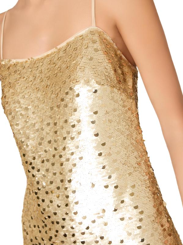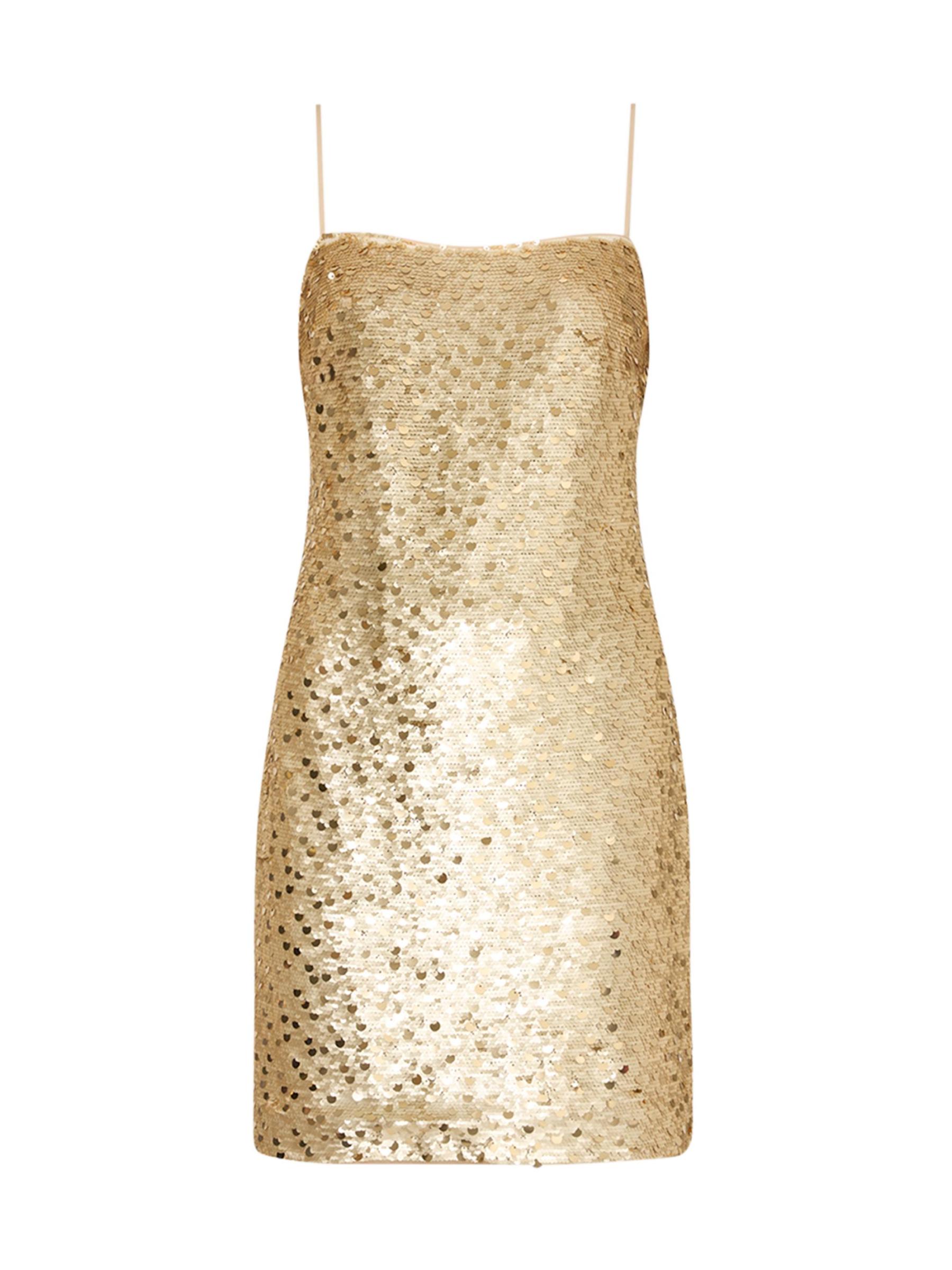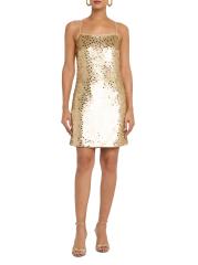 يتلألأ هذا الفستان القصير من Milly Colette بالترتر الذهبي المنقط، وهو مصمم بشكل أنيق مع تقويرة مربعة نظيفة.