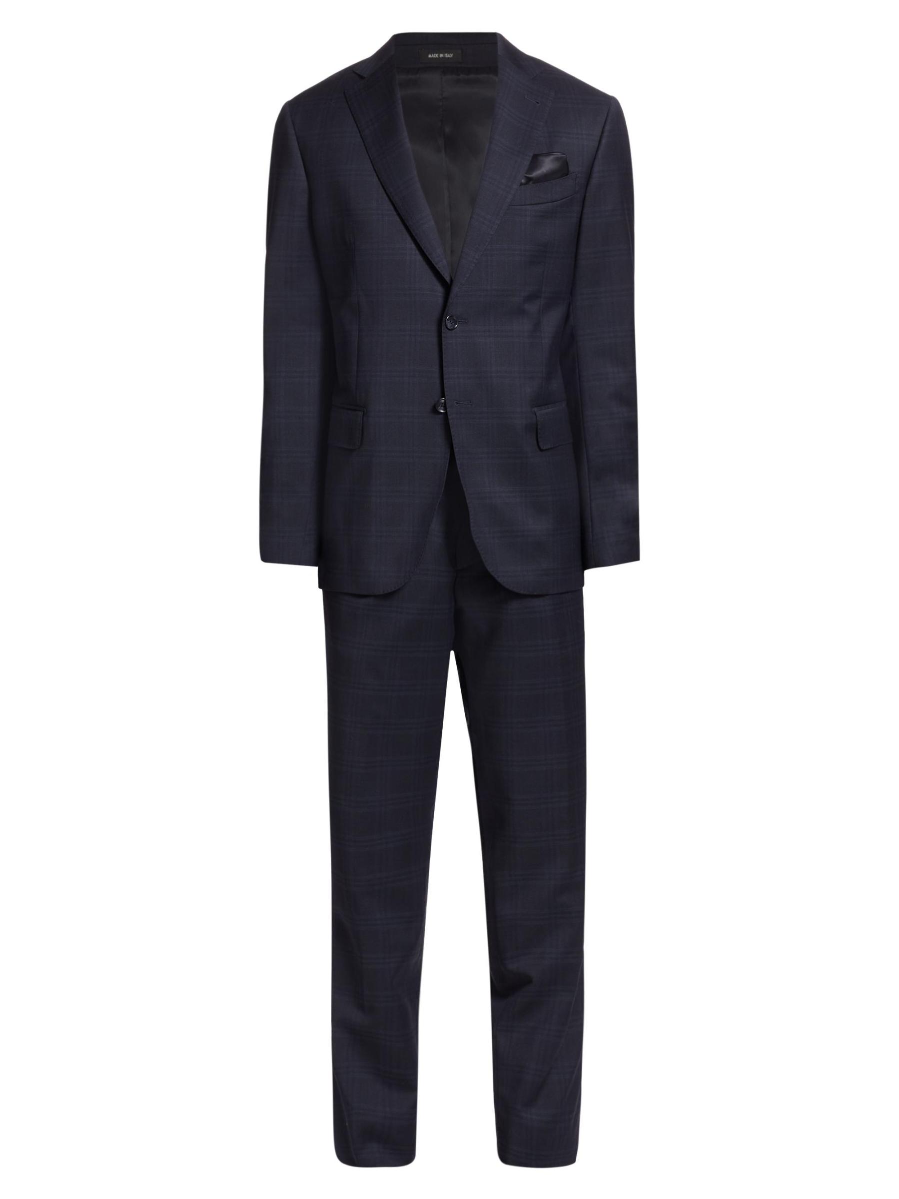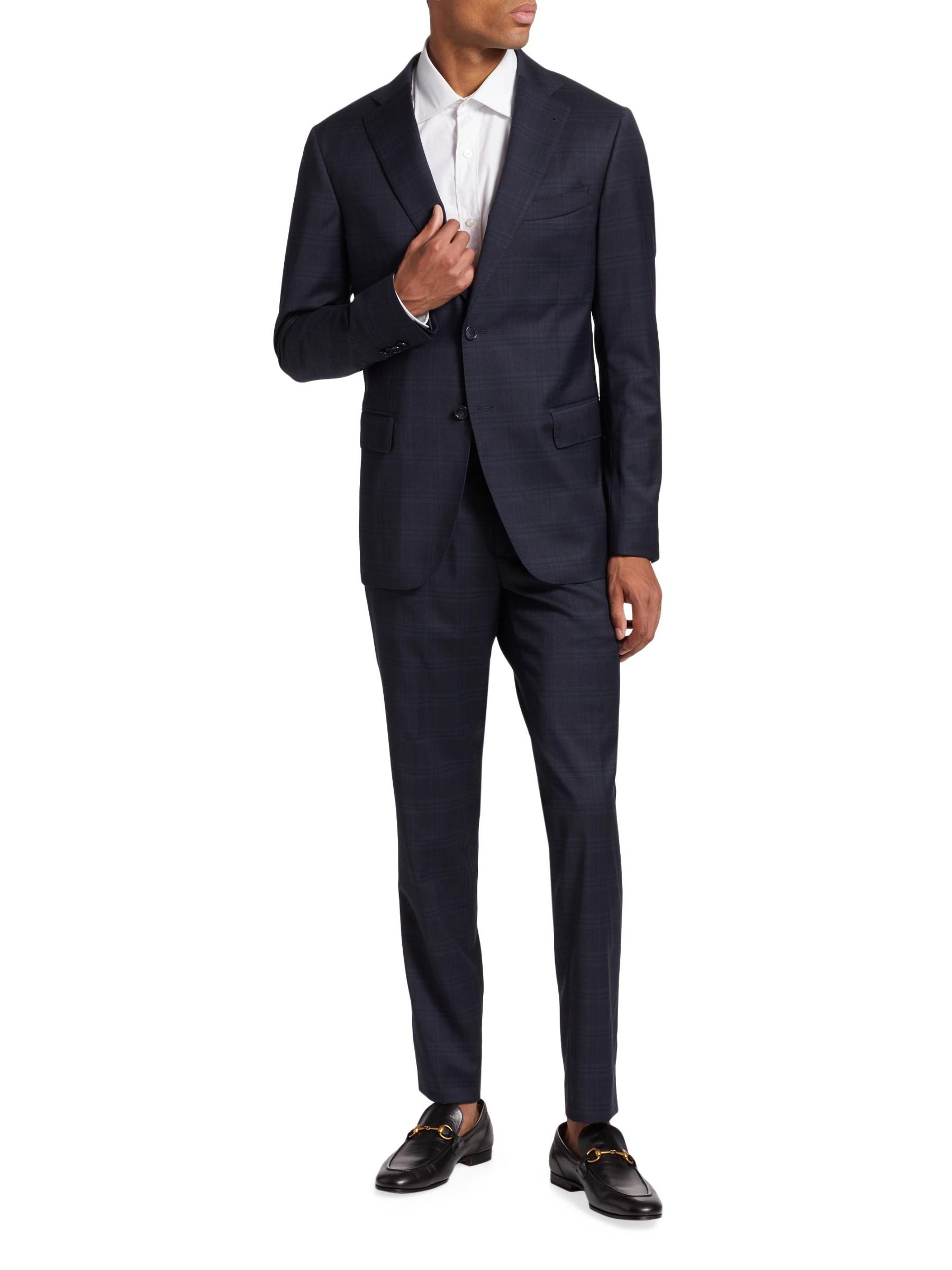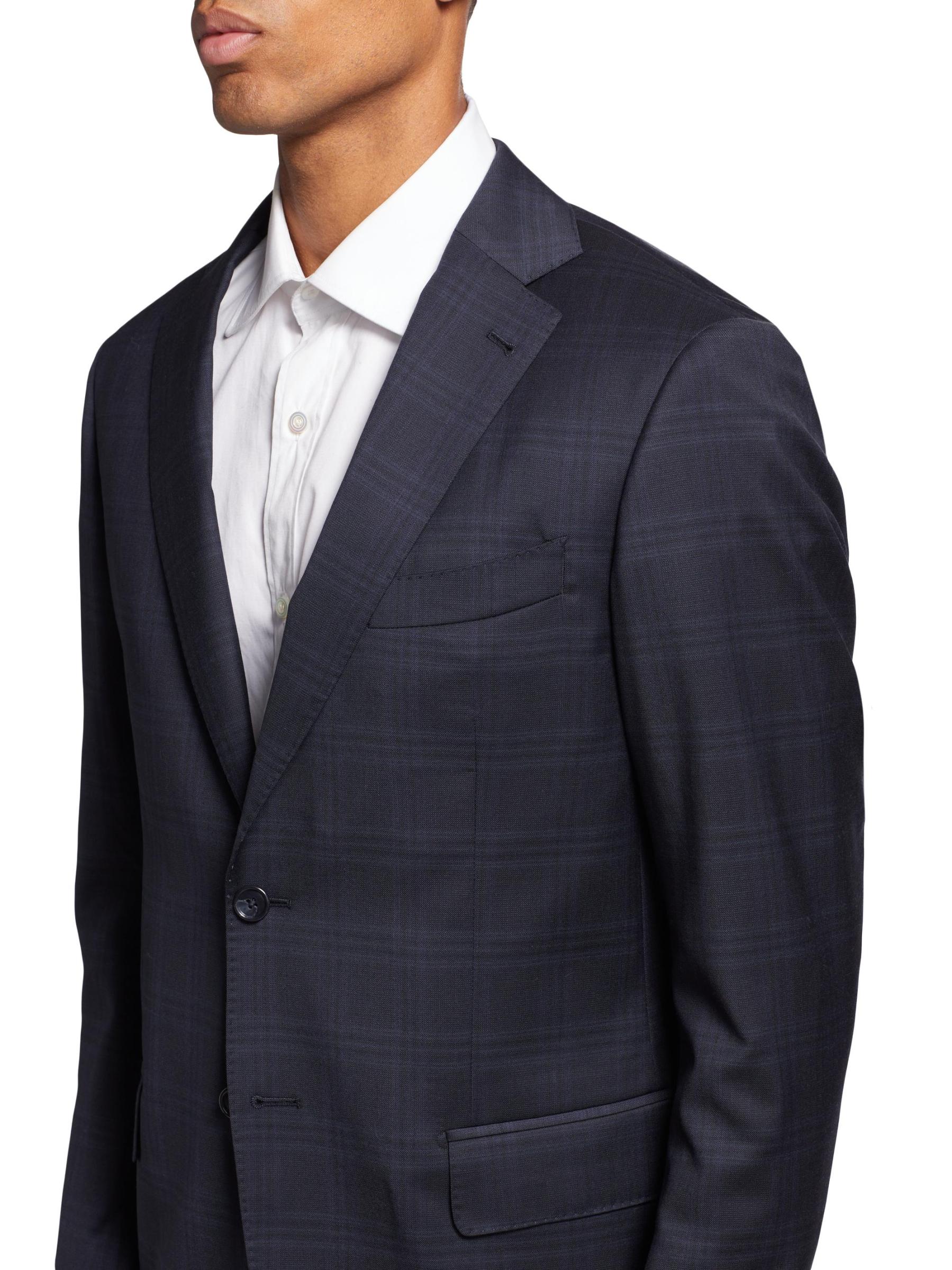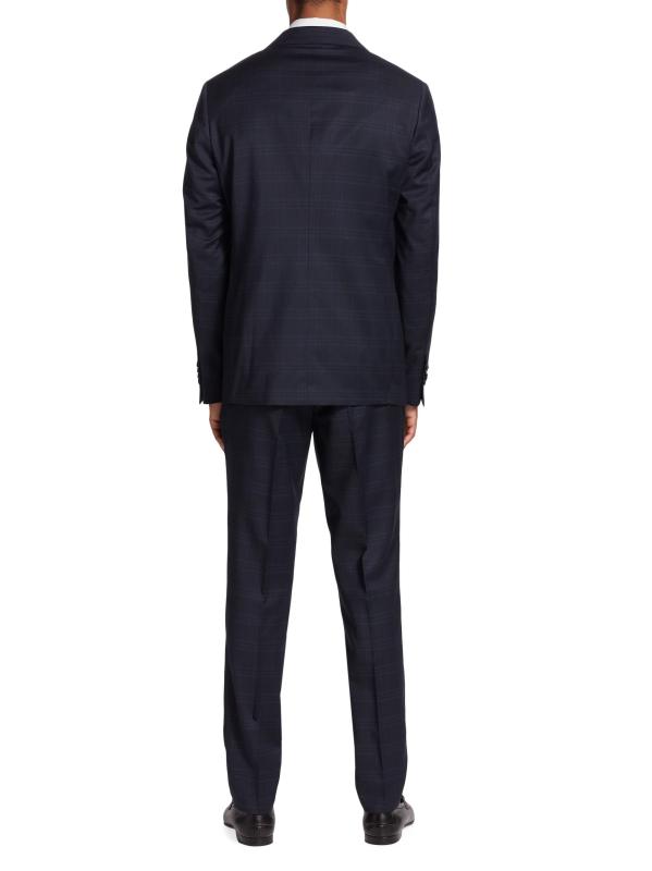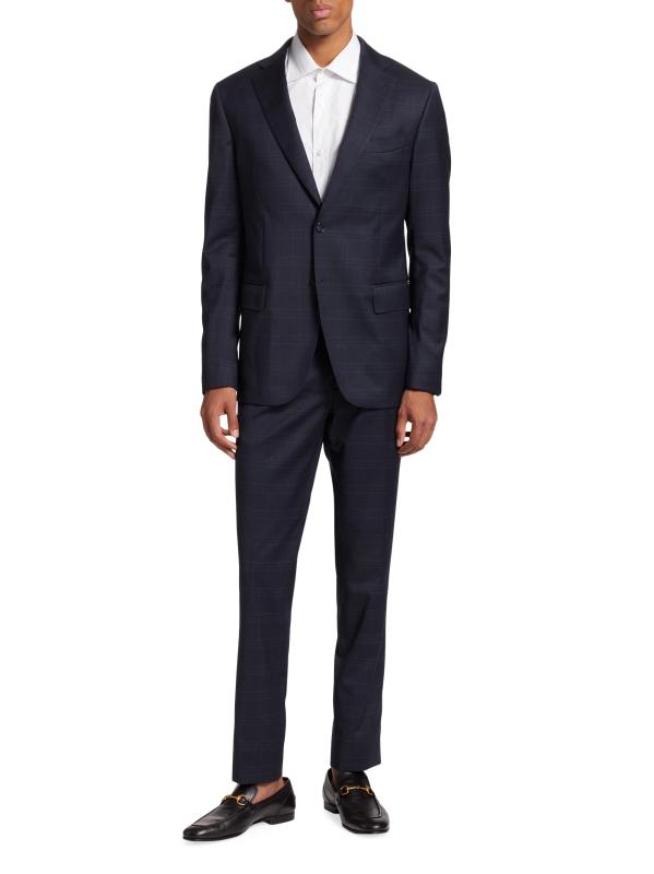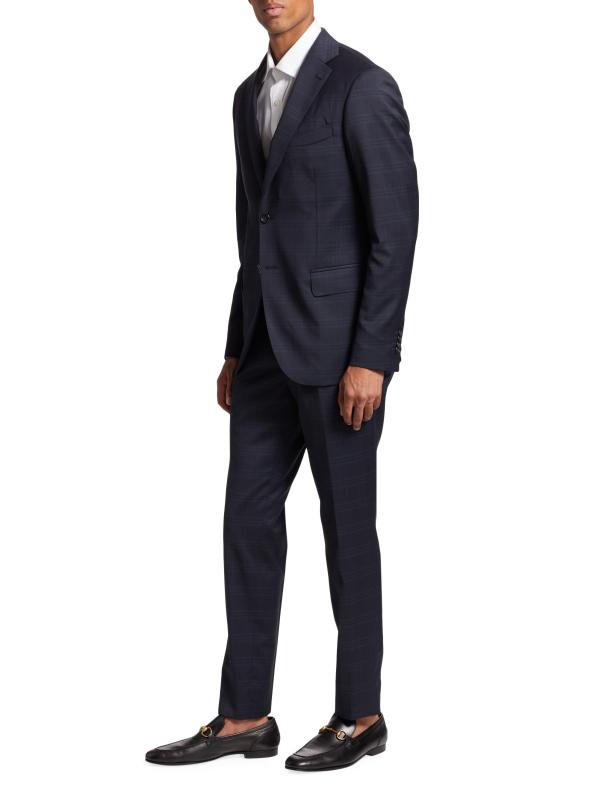 تتميز هذه البدلة المكونة من قطعتين من مجموعة ساكس فيفث أفينيو، المصنوعة من الصوف بزخارف منقوشة، بمقاس بسيط ونحيف.