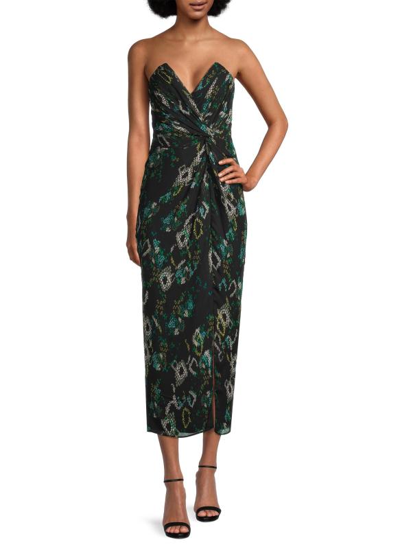 يتميز فستان Katie May بدون حمالات بطبعة نابضة بالحياة مستوحاة من جلد الثعبان بلمسة كشكشة في الأمام.