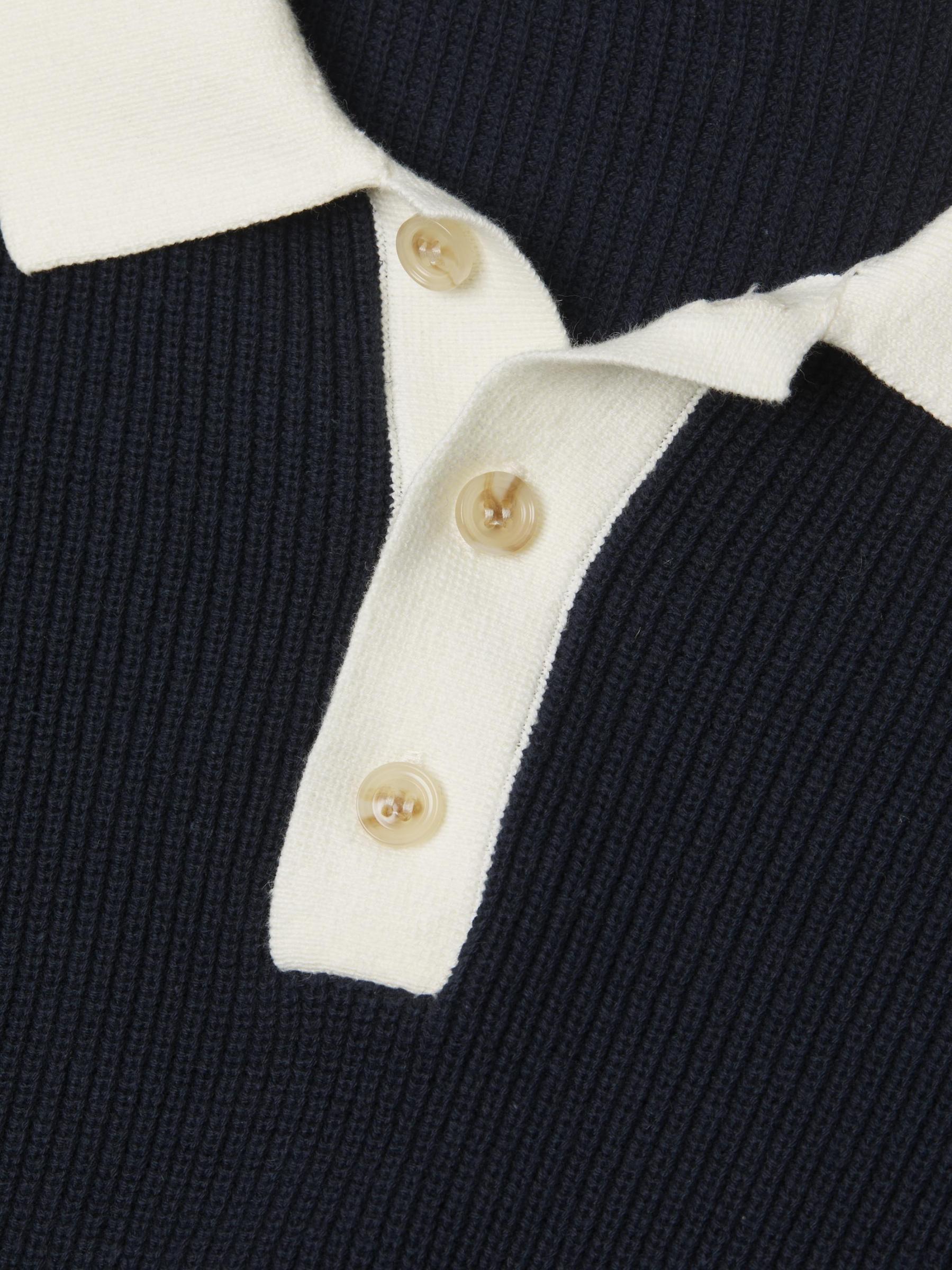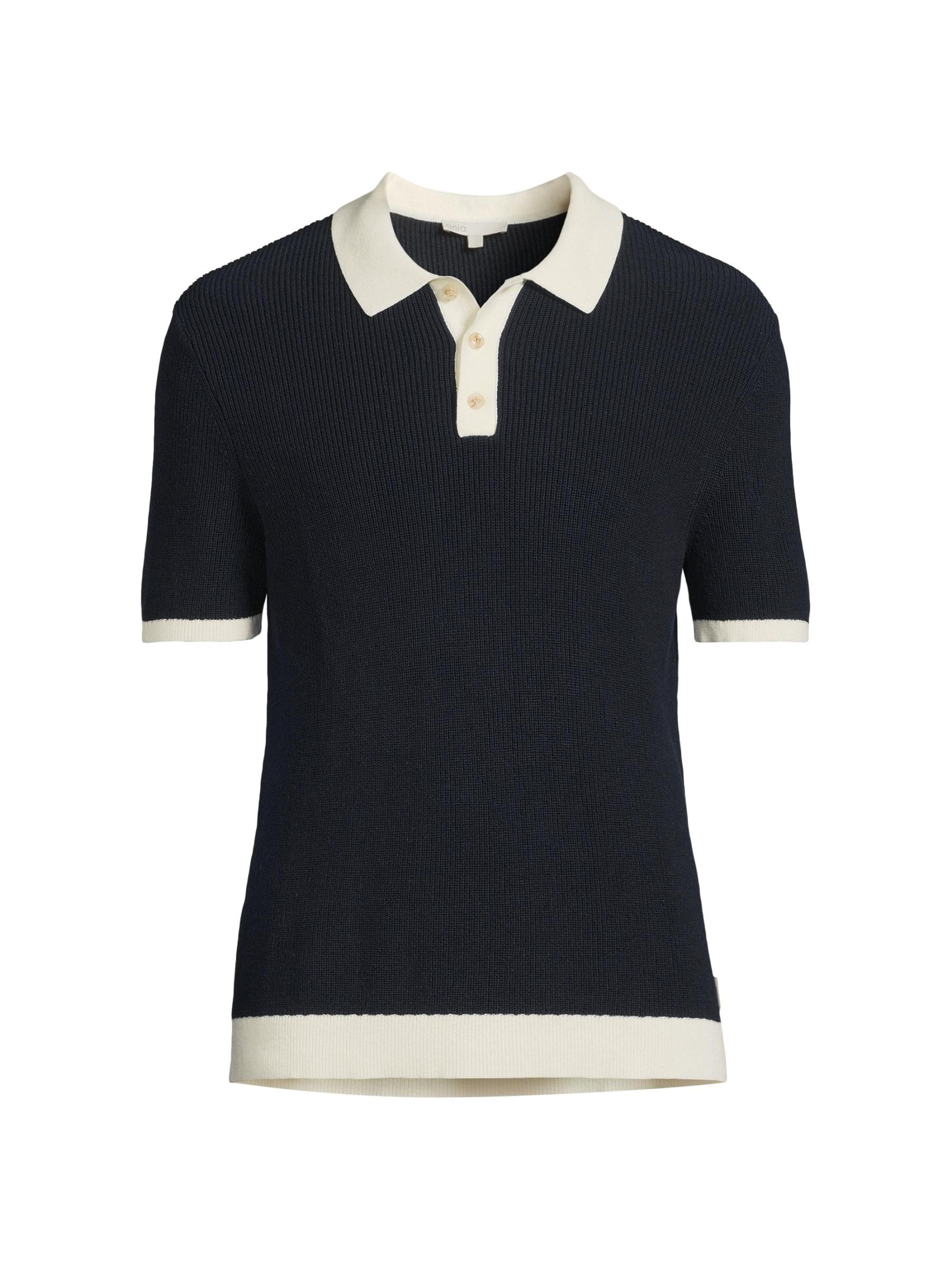 تم تصميم قميص بولو المحبوك هذا من أونيا، المصنوع من القطن والكتان، بزخرفة متباينة وياقة واسعة وفتحة بثلاثة أزرار.