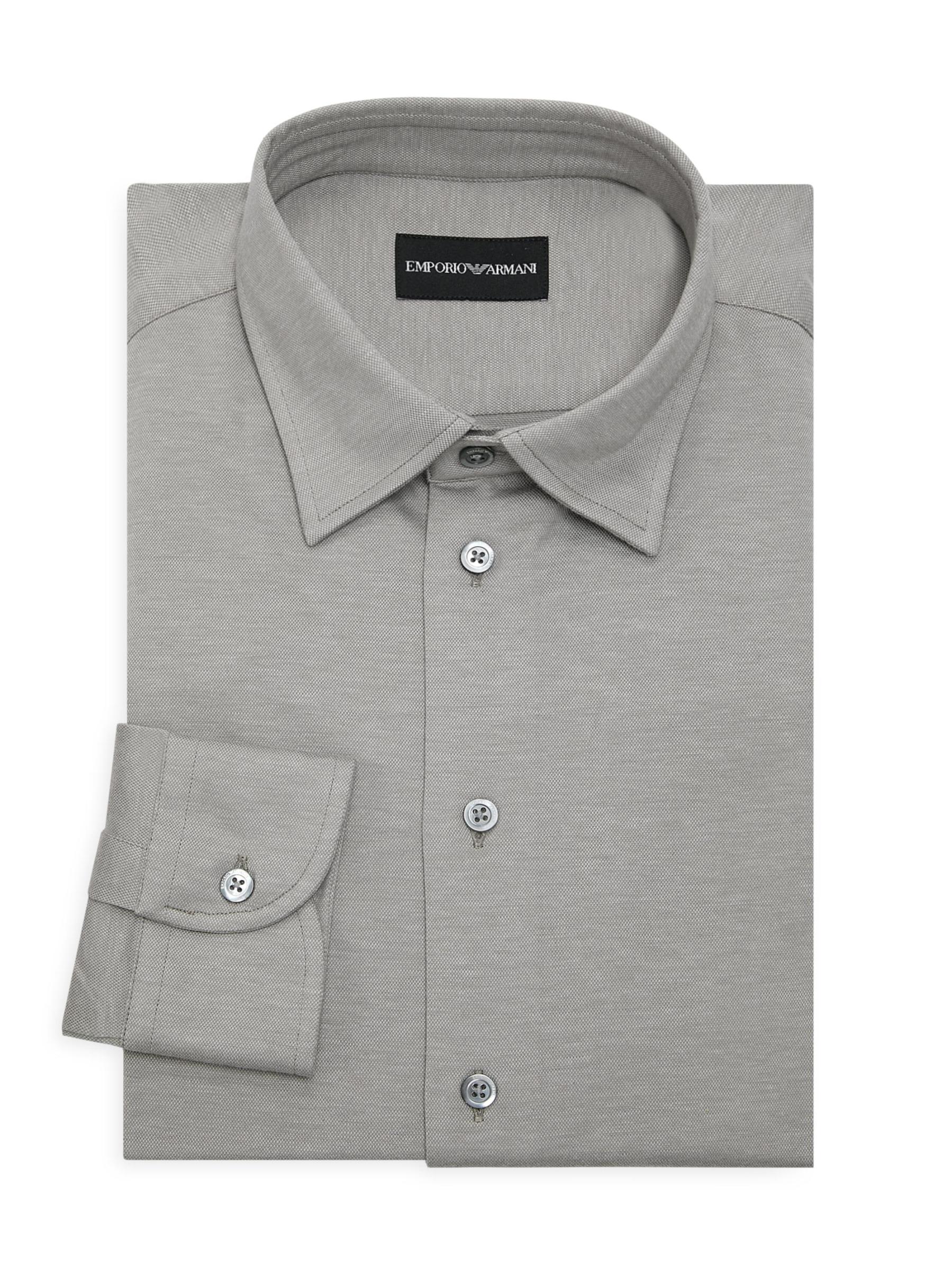 صُمم هذا القميص الرياضي من إمبوريو أرماني المصنوع من القطن البيكيه بياقة واسعة وأكمام طويلة وأساور أسطوانية بأزرار وإغلاق أنيق بأزرار أمامية.