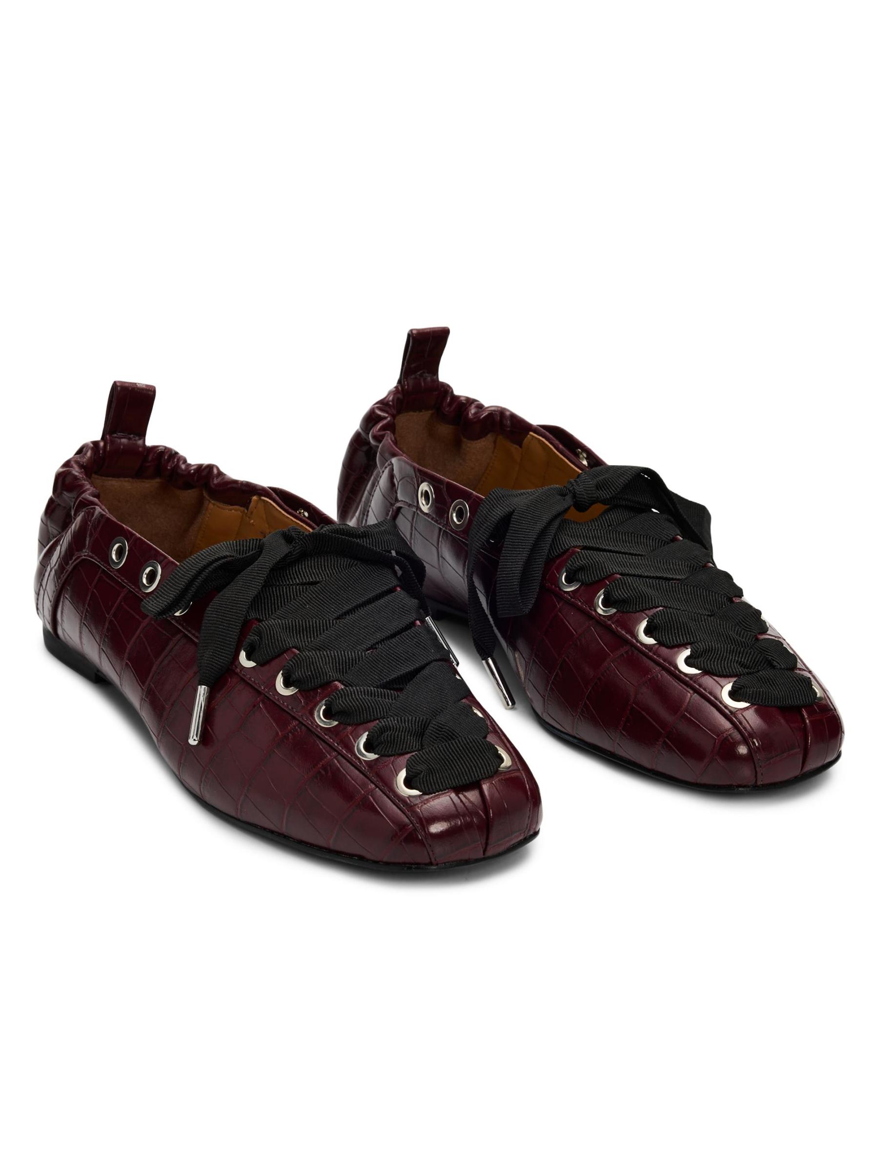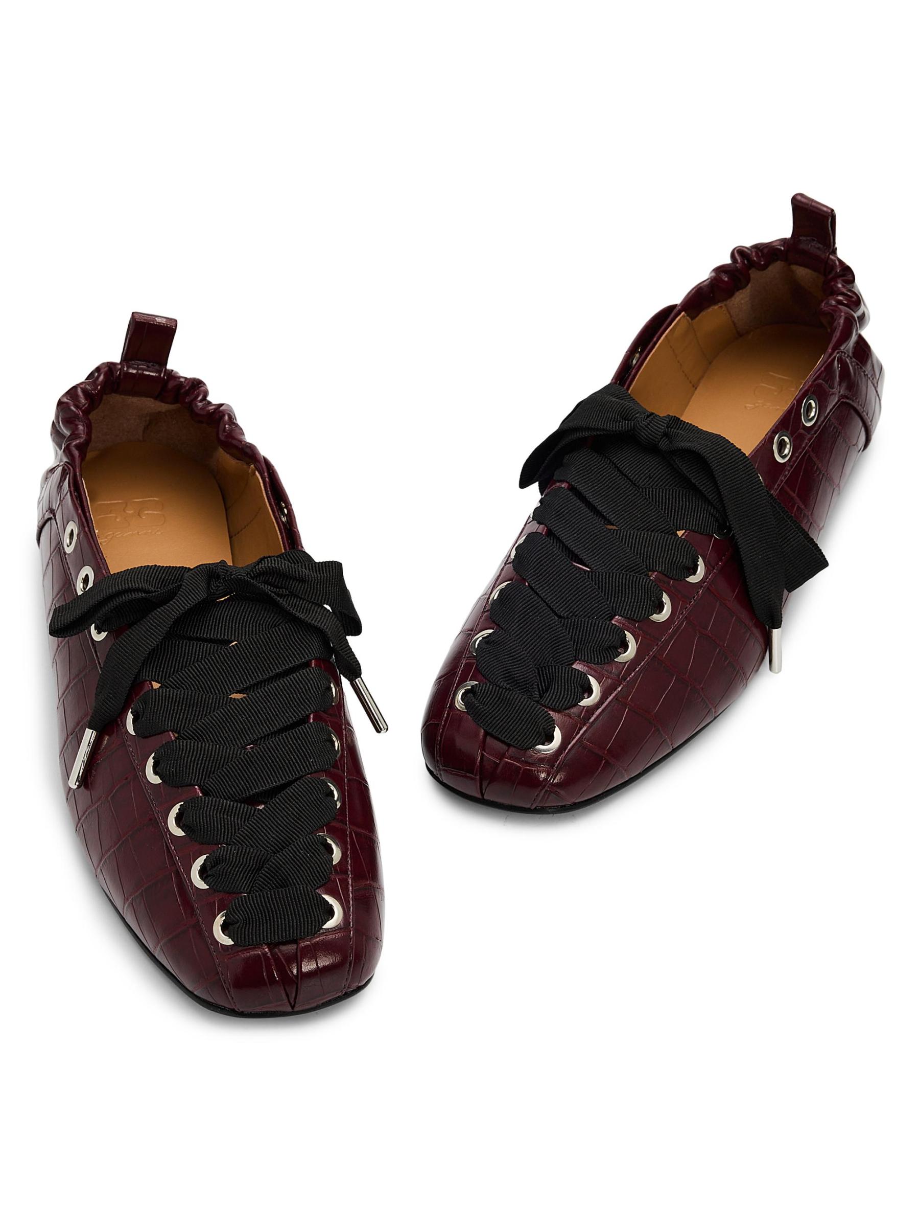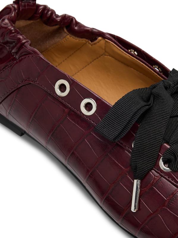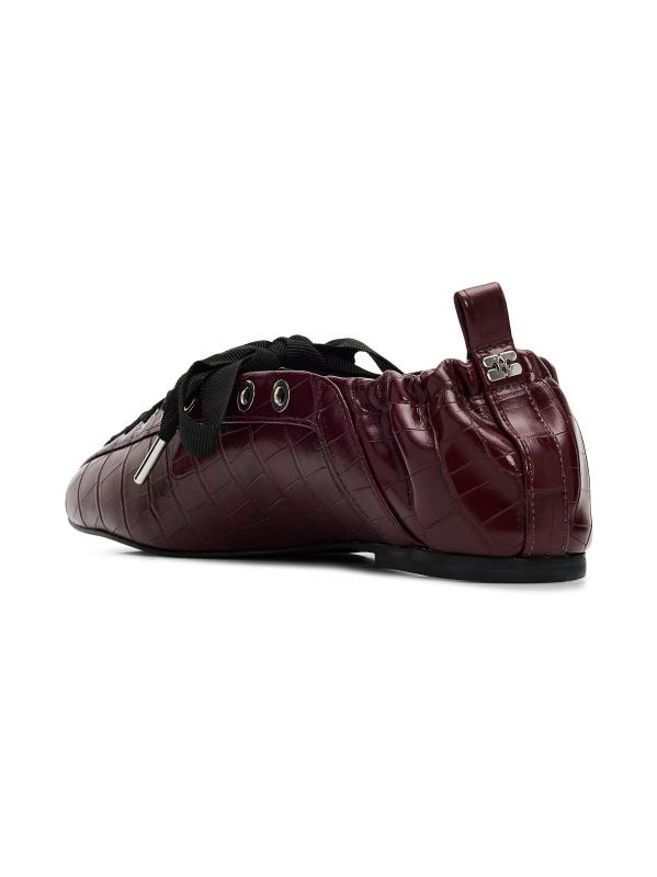 تتميّز أحذية الباليرينا هذه من Ganni، المصنوعة من قماش Pélinova® المنقوش بالتماسيح، بتصميم عصري من الدانتيل، وثقوب معدنية، وعروة سحب مريحة.