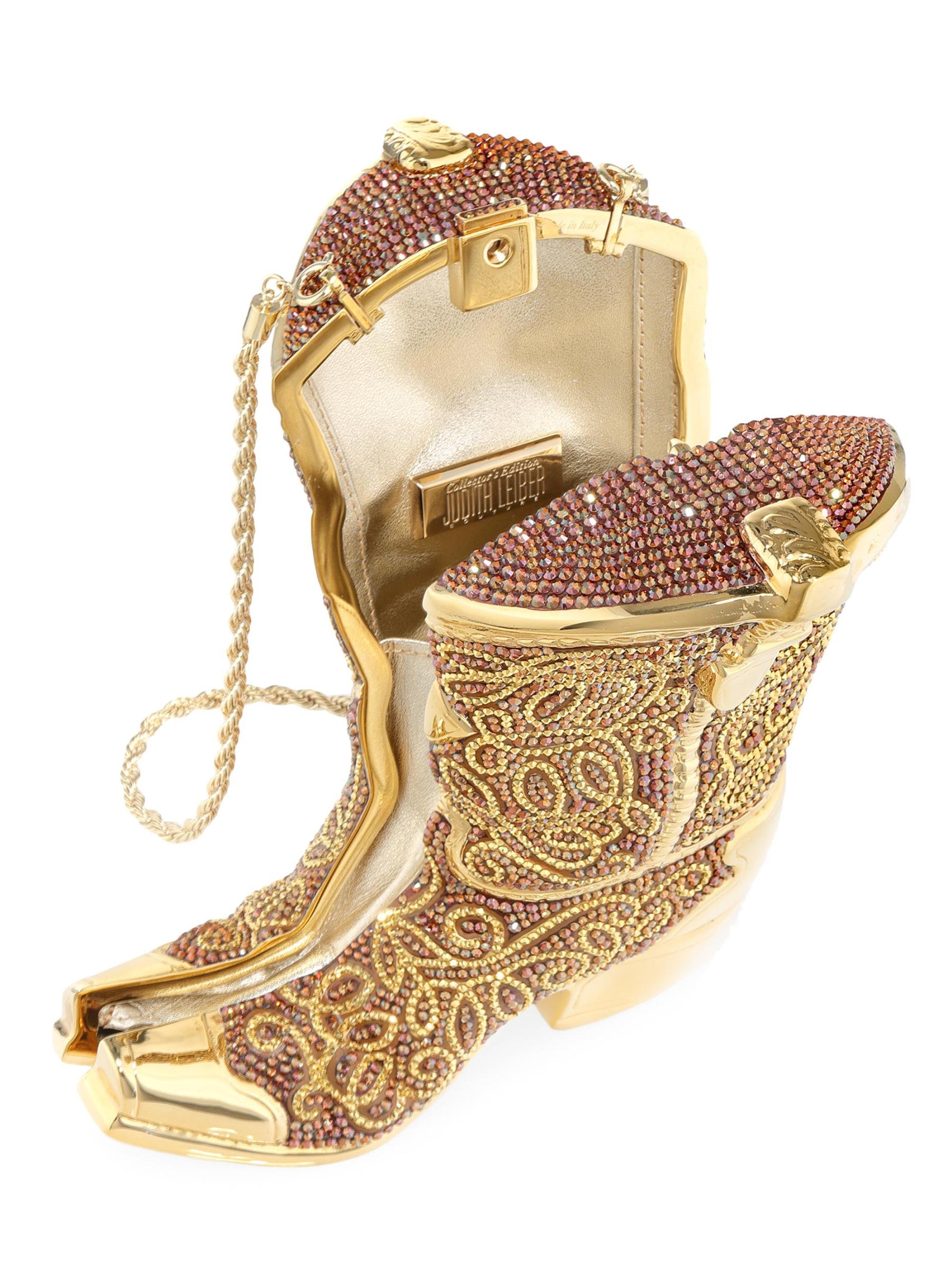 تتميّز حقيبة جوديث ليبر كوتور المستوحاة من التصميم الفريد لأحذية رعاة البقر بتزيينات كريستالية جريئة وحزام كتف على شكل سلسلة قابلة للإزالة.