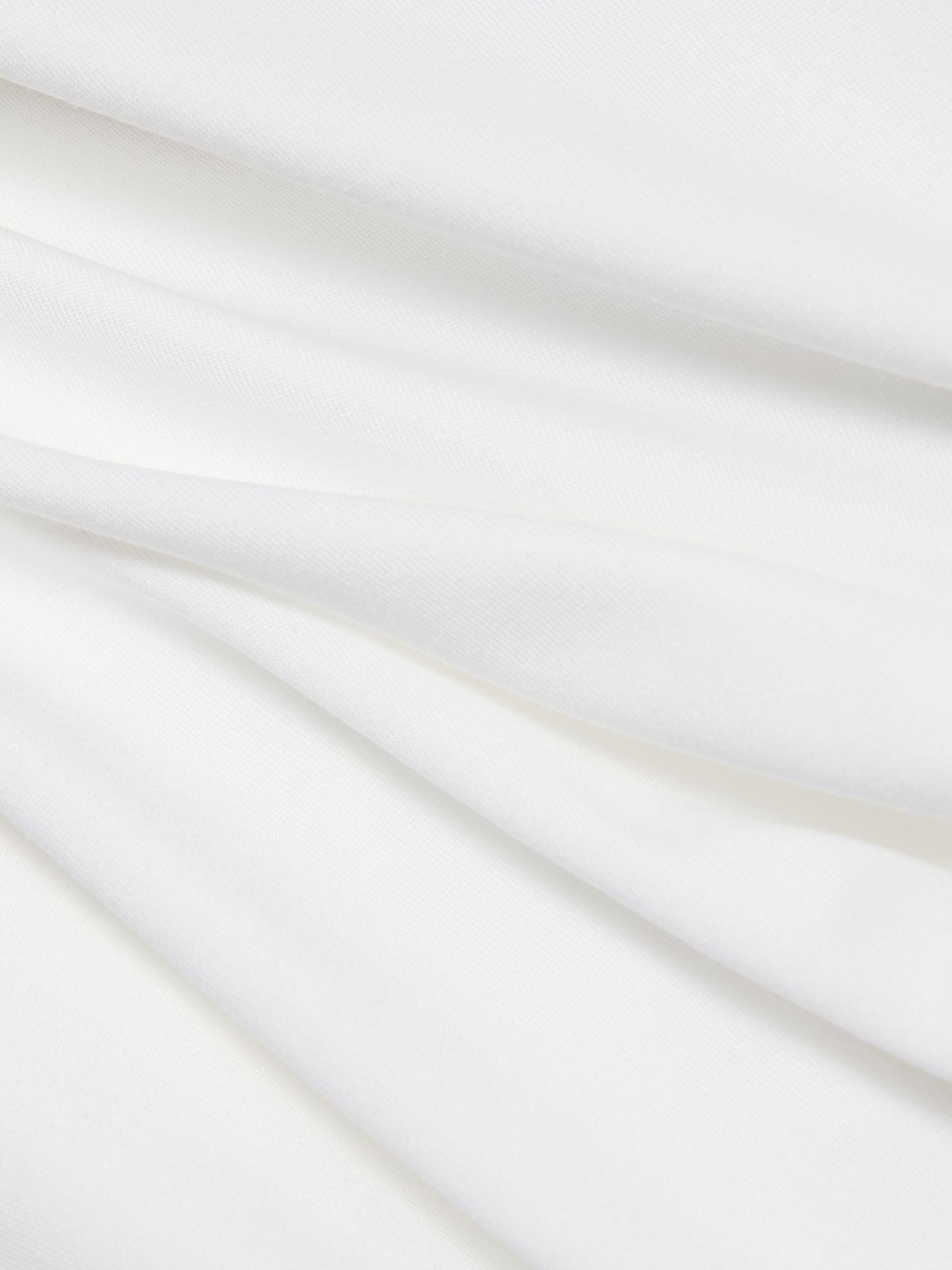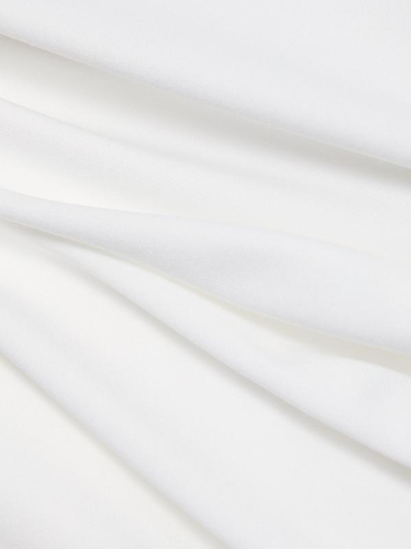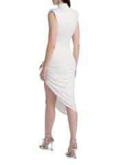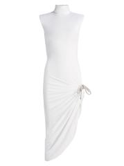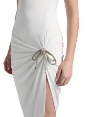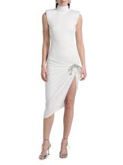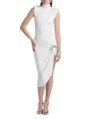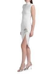 يتميز هذا الفستان المتوسط من Area، المصنوع من الجيرسيه المرن اللامع، بتصميم منسدل غير متماثل ومزين بعقدة فيونكة مزينة بالكريستال على الجانب. تُعزّز الياقة المدورة المجمّعة الأسلوب بلا أكمام.