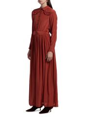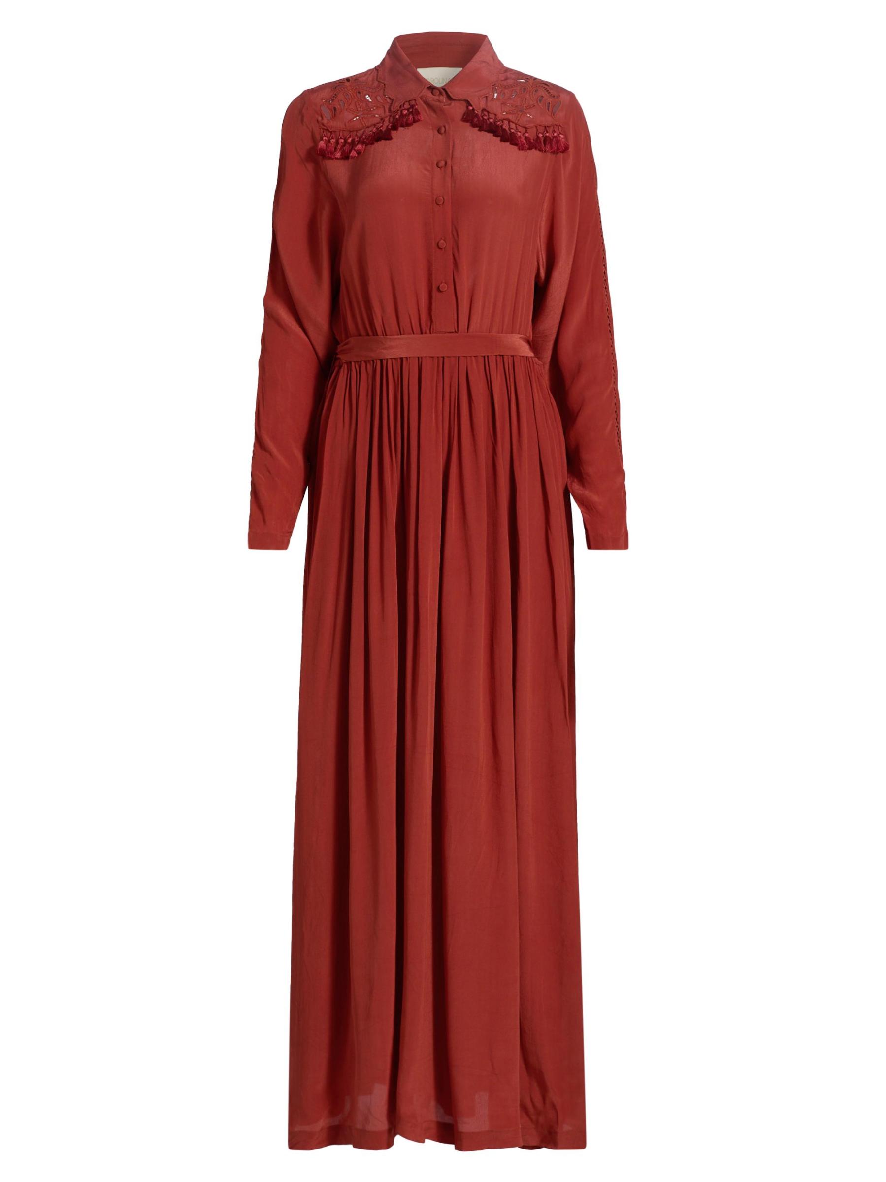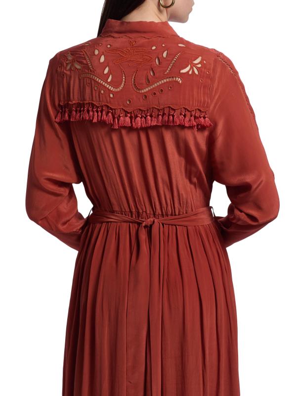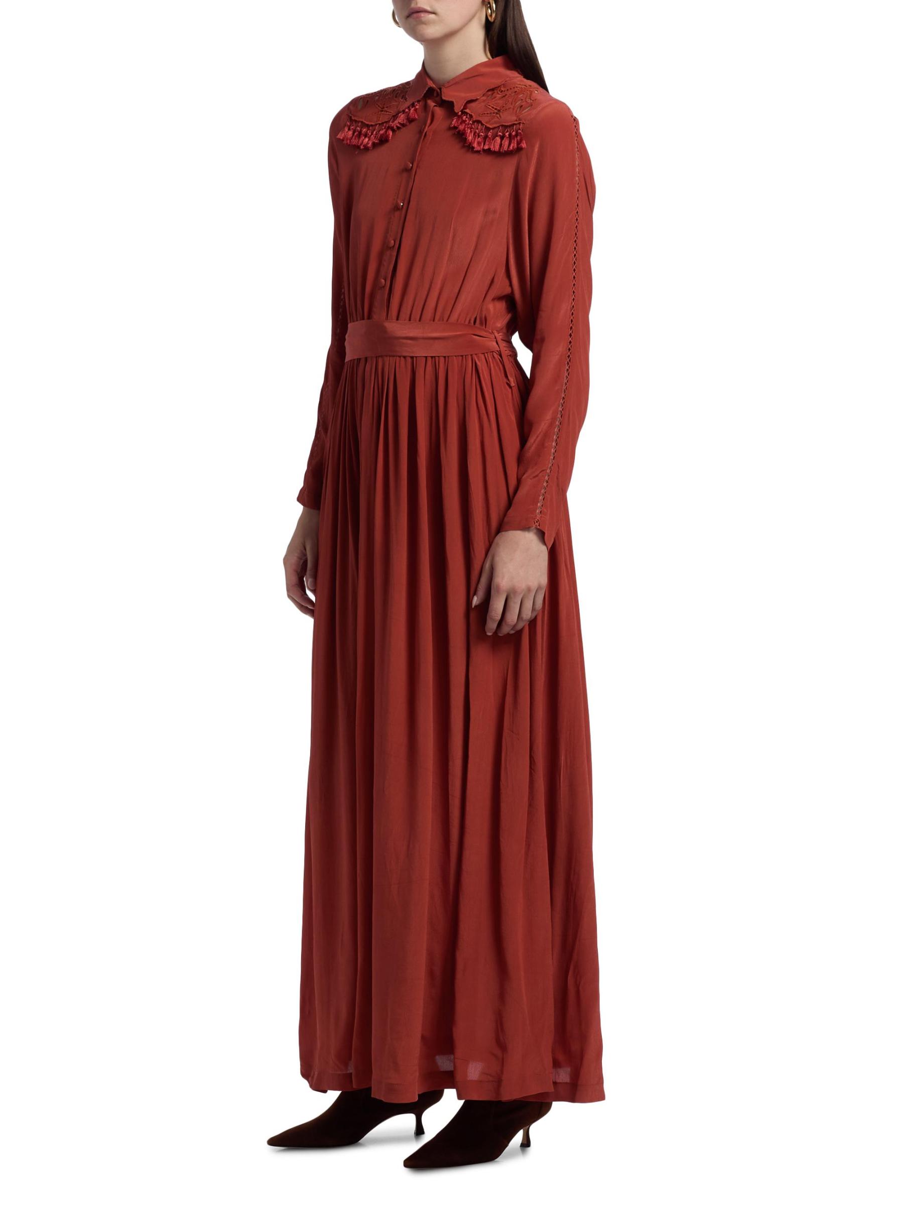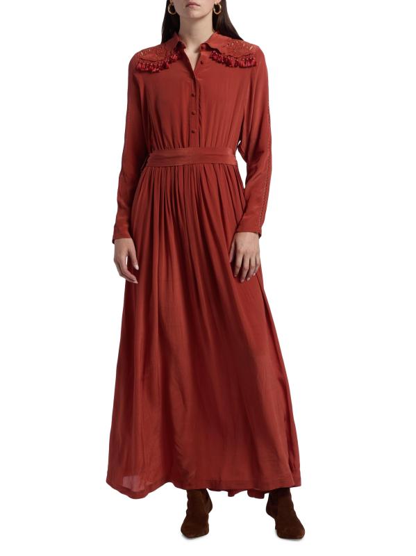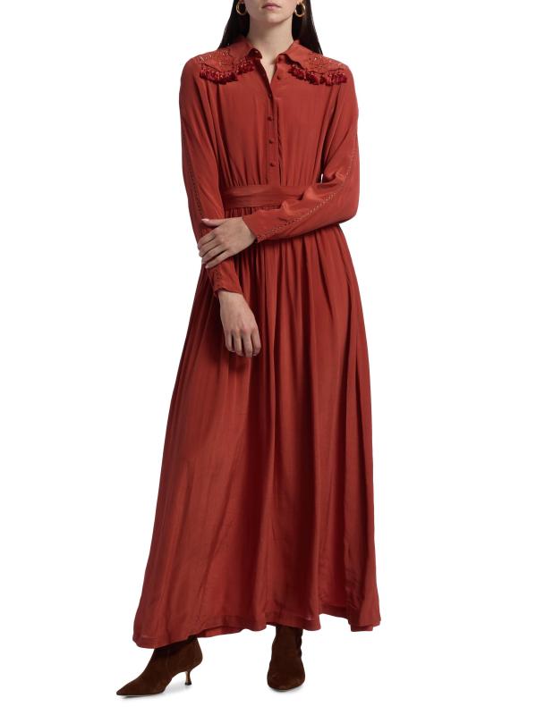 فستان Cumbre maxi من Carolina K مصنوع من قماش خفيف الوزن ومصمم بياقة واسعة وتقليم بشراشيب وتطريز في الخلف وربطة على الخصر.طوق سبريد أكمام طويلة إغلاق بأزرار أمامية فيسكوز 100% تنظيف جاف مستوردة