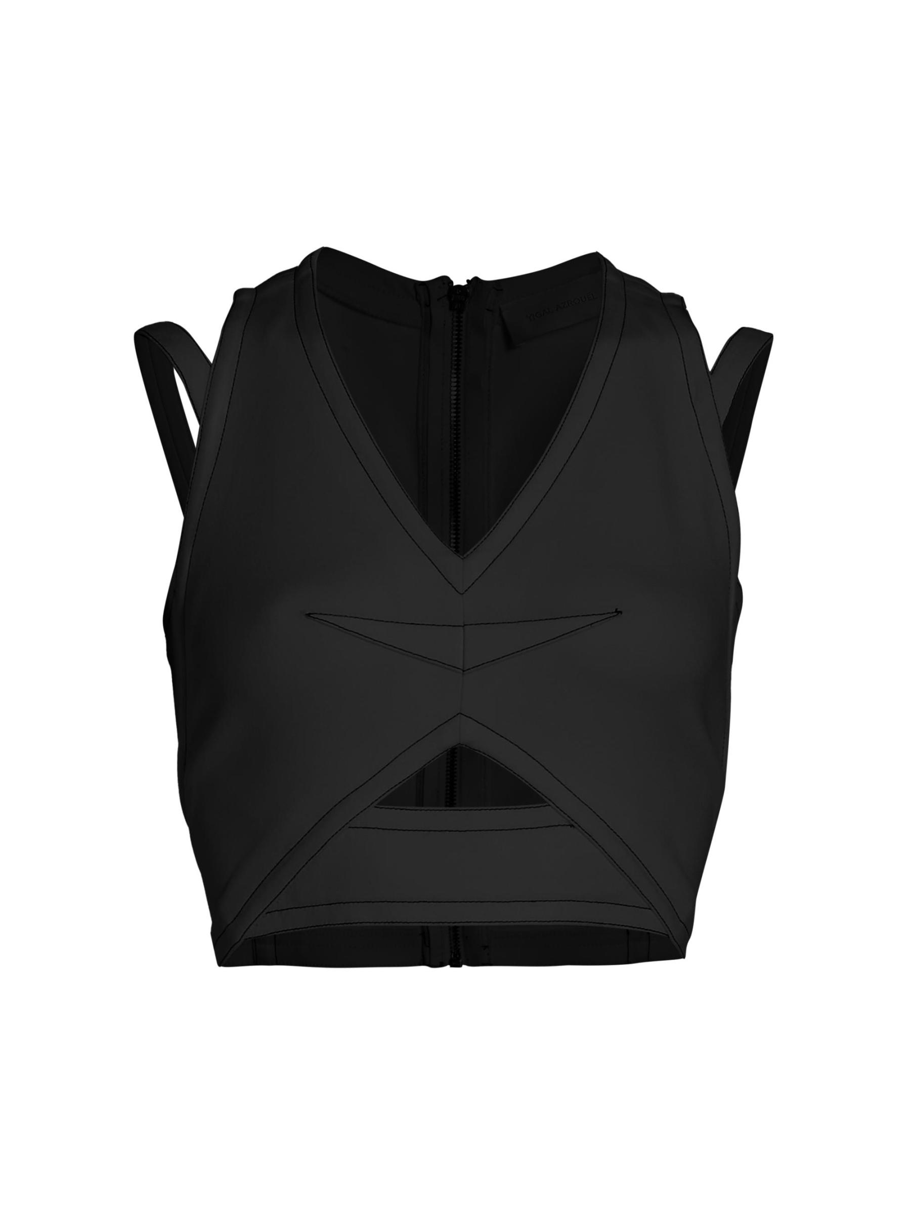 تتميّز هذه البلوزة القصيرة بفتحات هندسية ورقبة على شكل حرف V، وهي مزوّدة بسحّاب خلفي مكشوف.