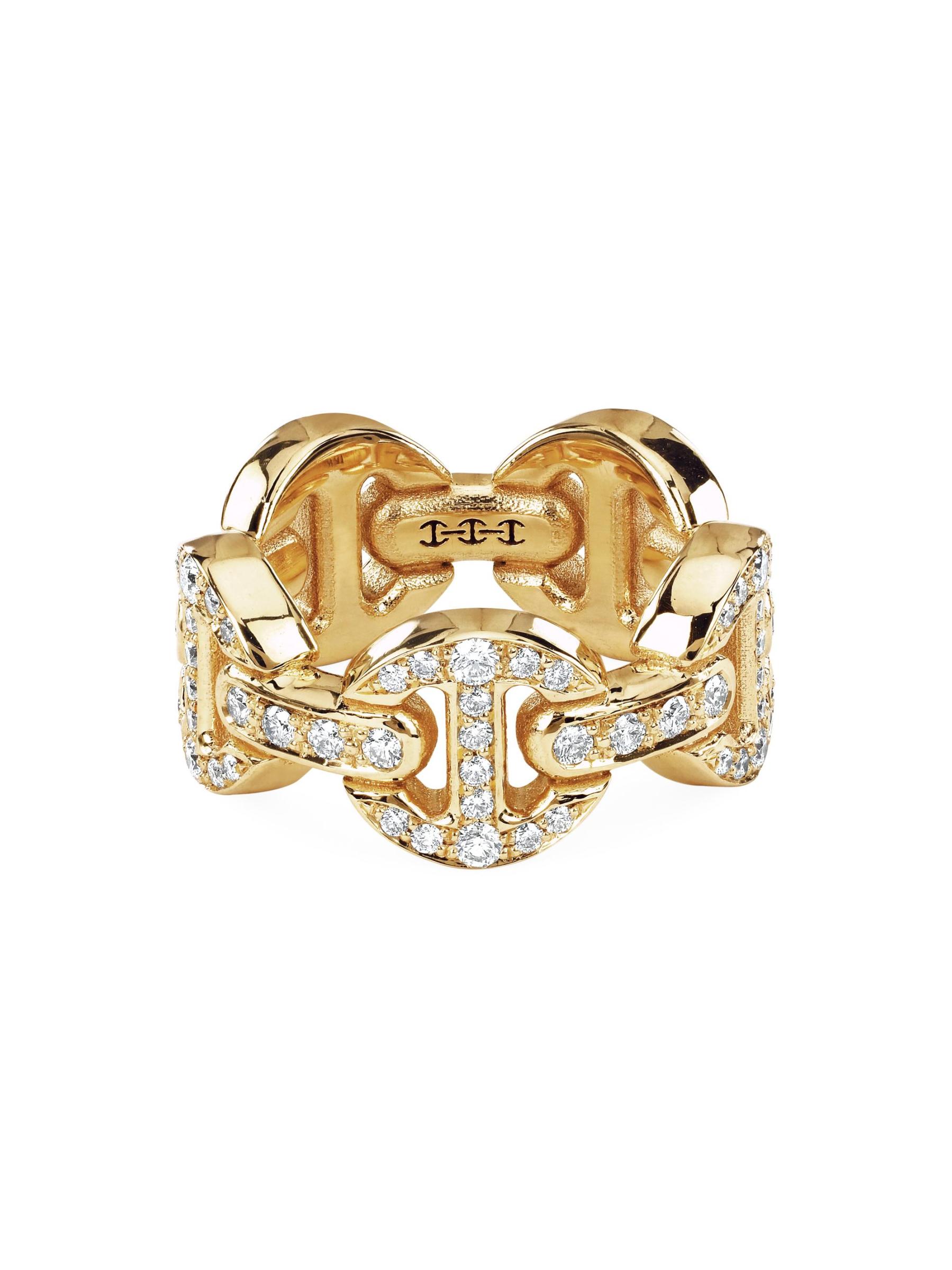 نسخة فاخرة كاملة من الخاتم الكلاسيكي ثلاثي الوصلات، تتميز بالتصميم المميز بخمس حلقات من الذهب اللامع.ألماس أبيض، 1.0 tcw لون الماس: G وضوح الماس: VS1 ذهب أصفر عيار 18 قيراط صُنع في الولايات المتحدة الأمريكية