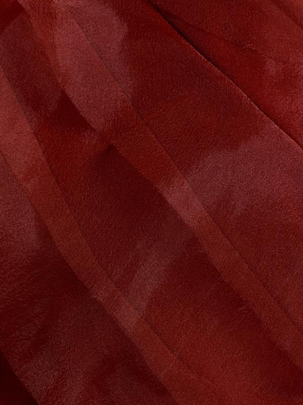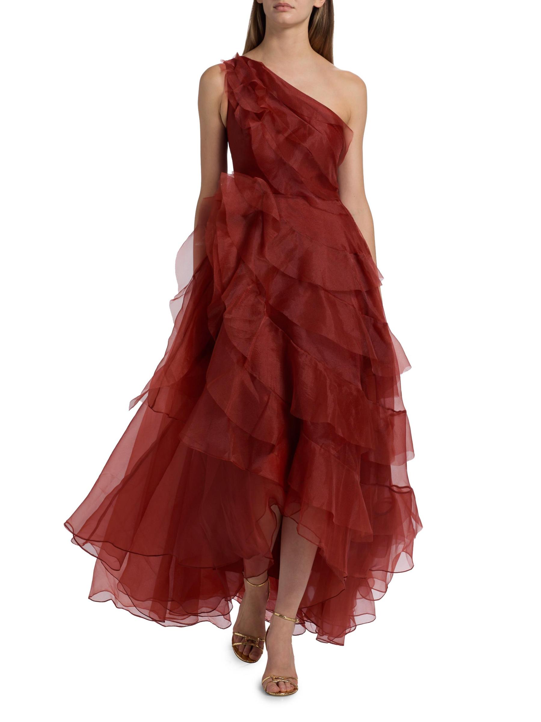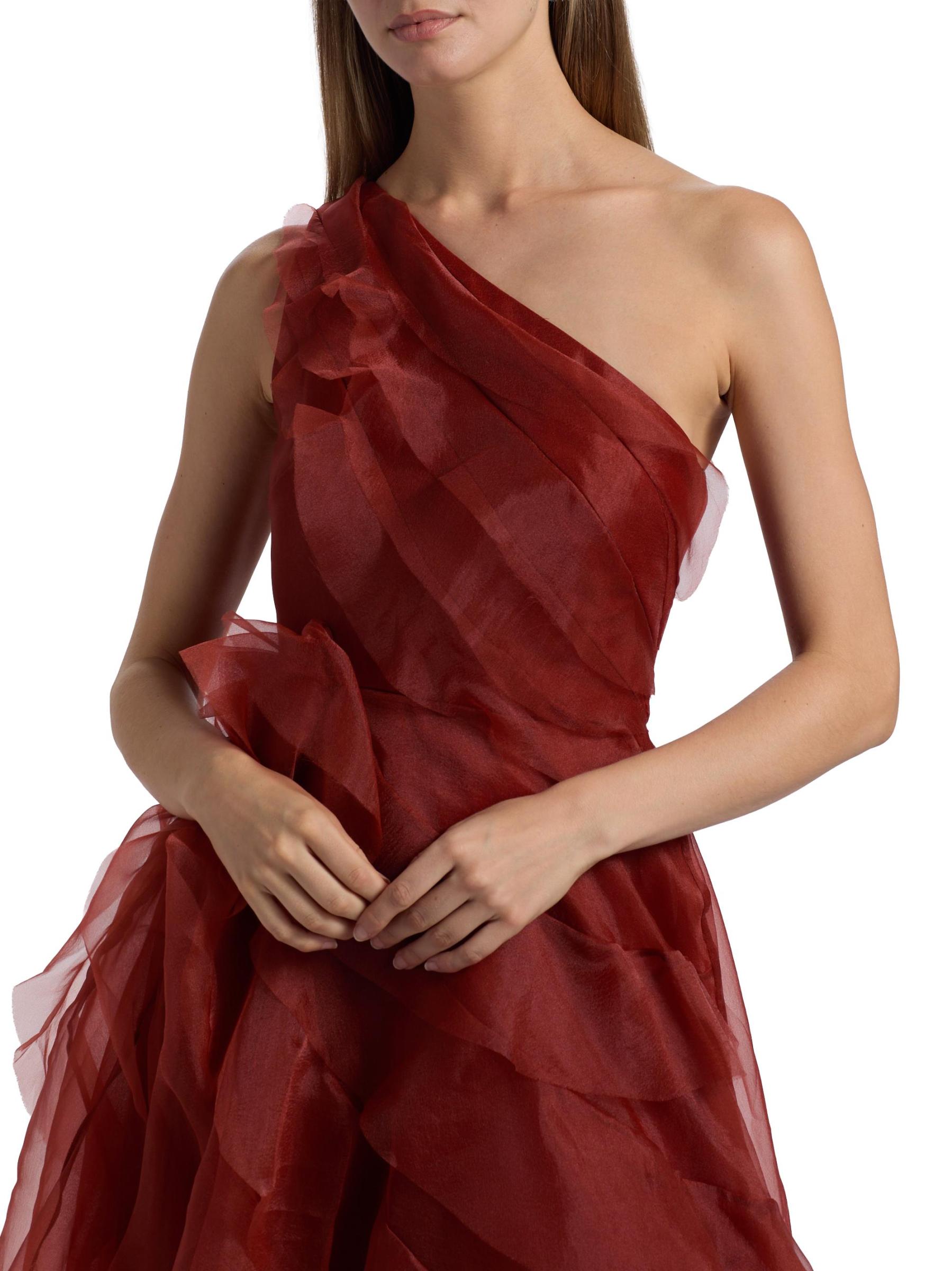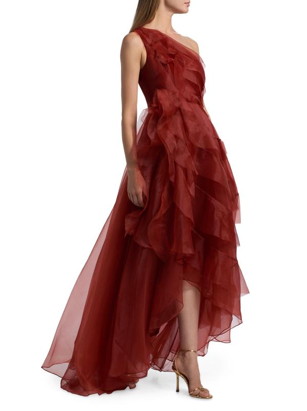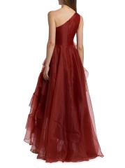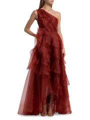 يتميز فستان Daniela من Theia بصدّار برقبة بكتف واحد مزين بكشكشة متدرجة تتدرج في تنورة كاملة. تضفي الحافة العالية والمنخفضة مزيدًا من المرح على هذا التصميم ذو الشكل الهرمي.
