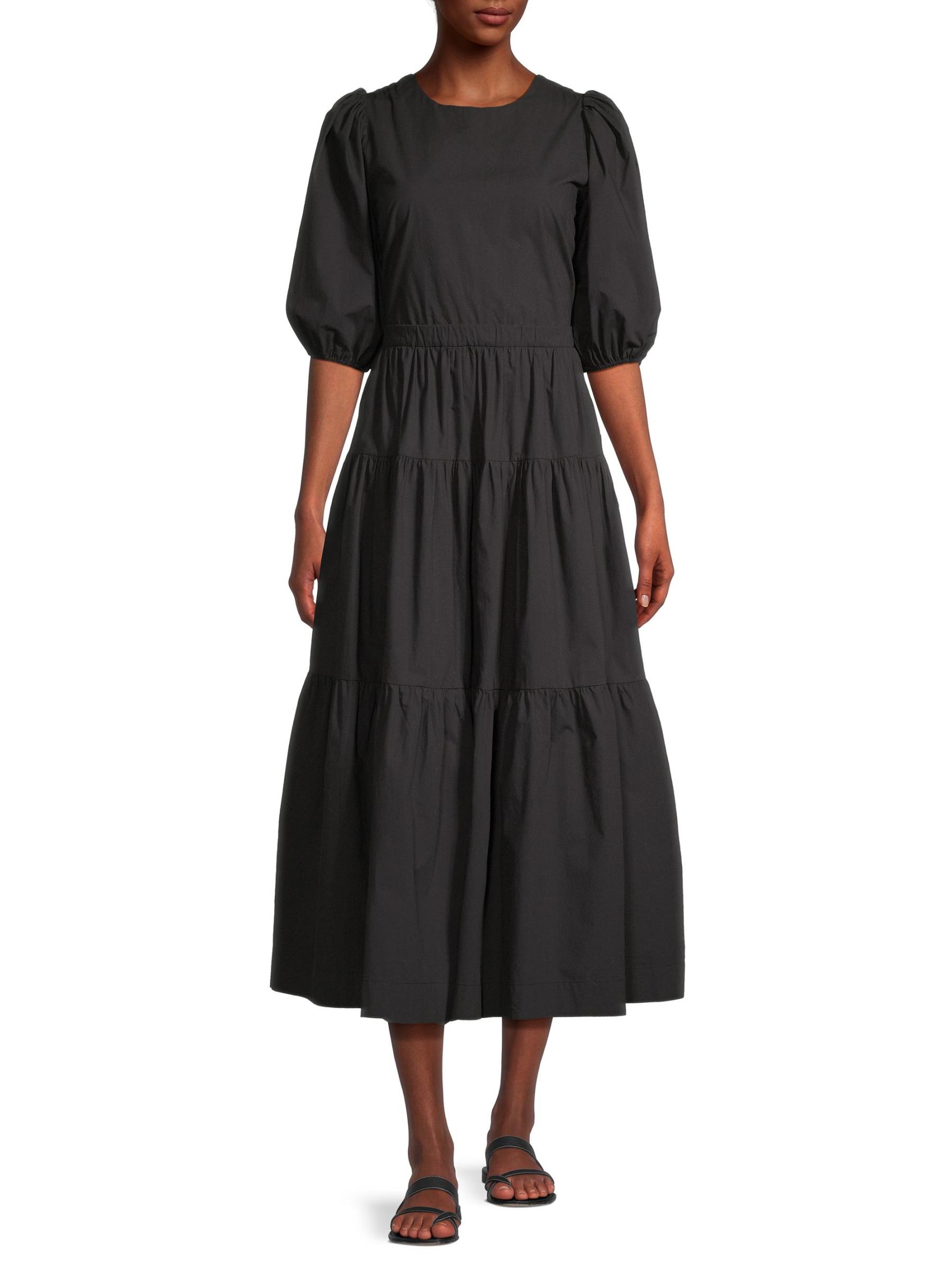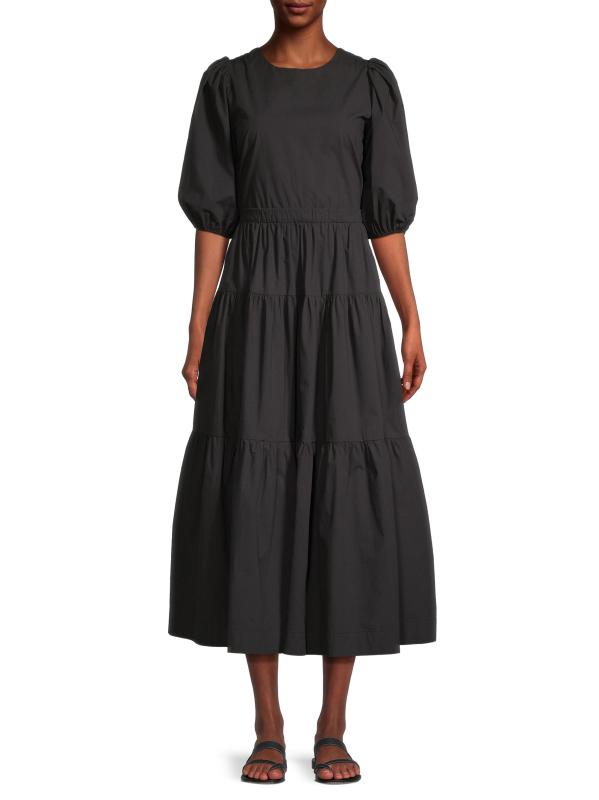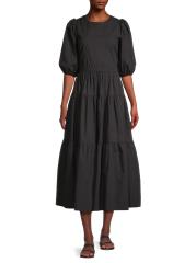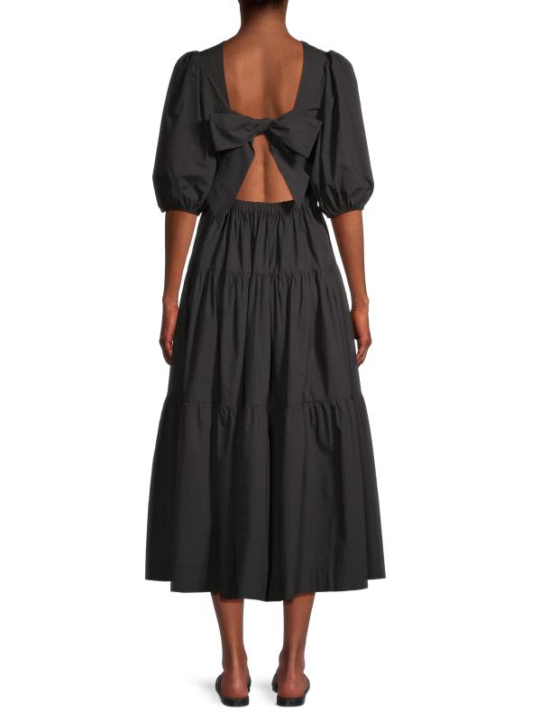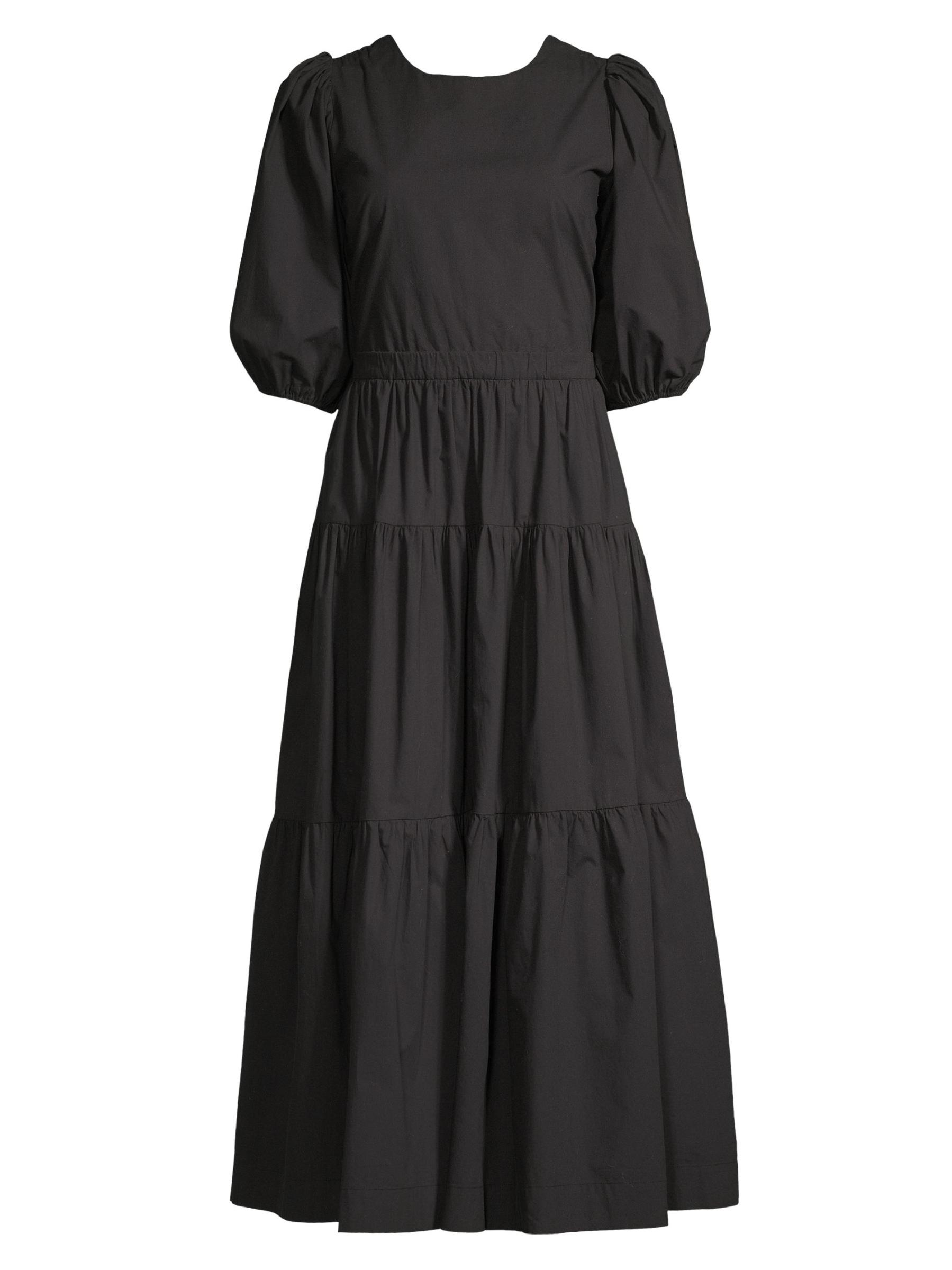 فستان Daphne من Birds of Paradis مصنوع من قماش البوبلين القطني ويتميز بتنورة واسعة متدرجة. يُكمل المظهر بأكمام منفوخة بطول الكوع وظهر فيونكة.