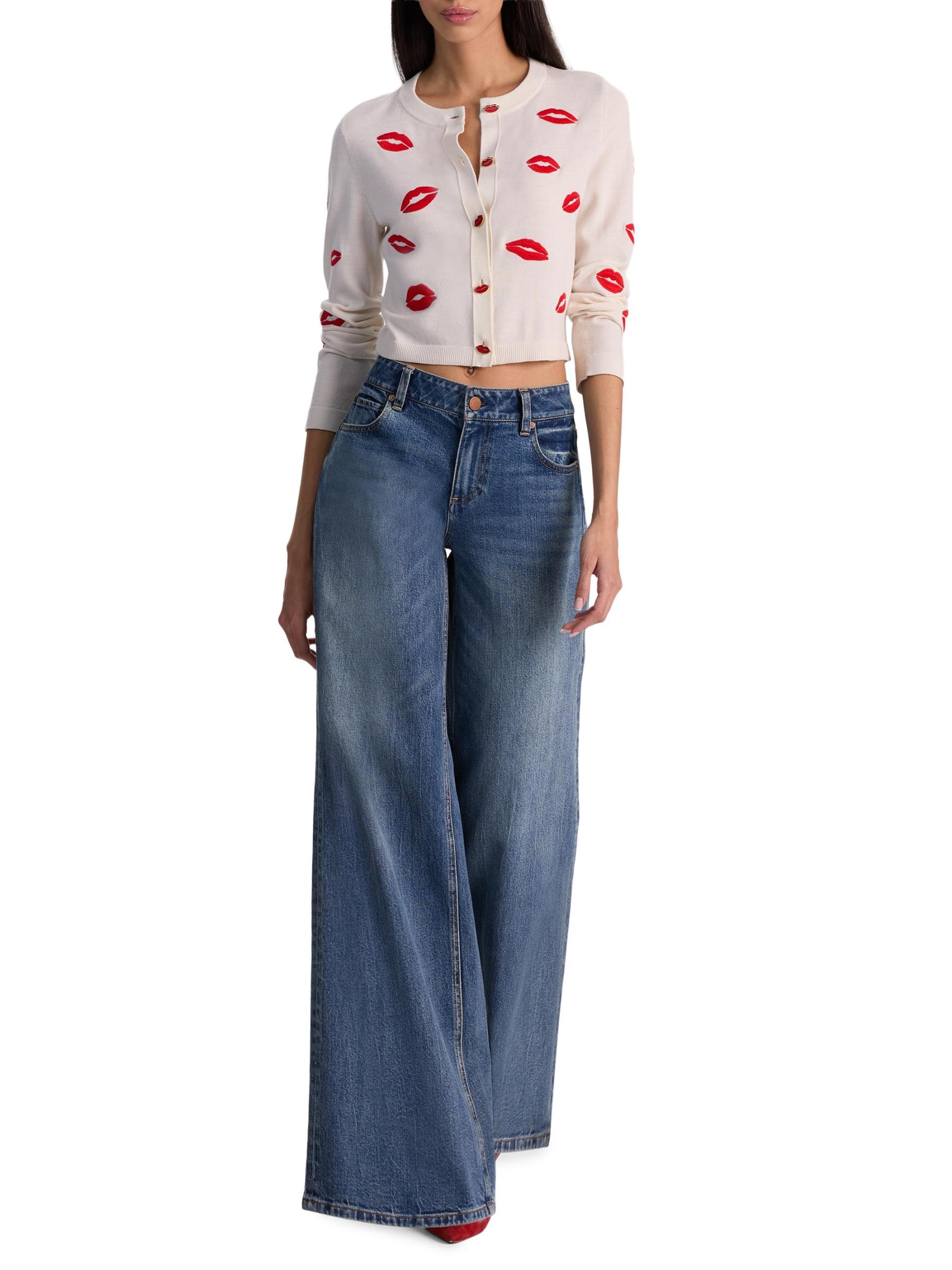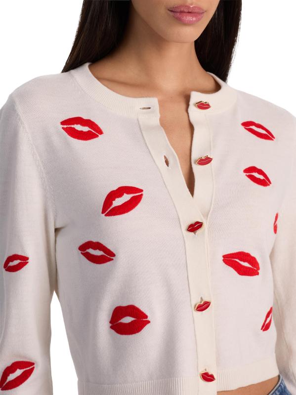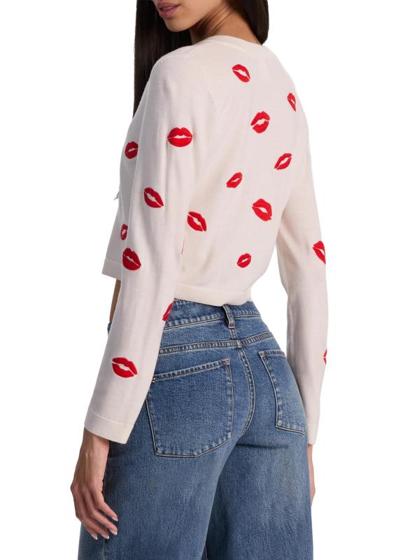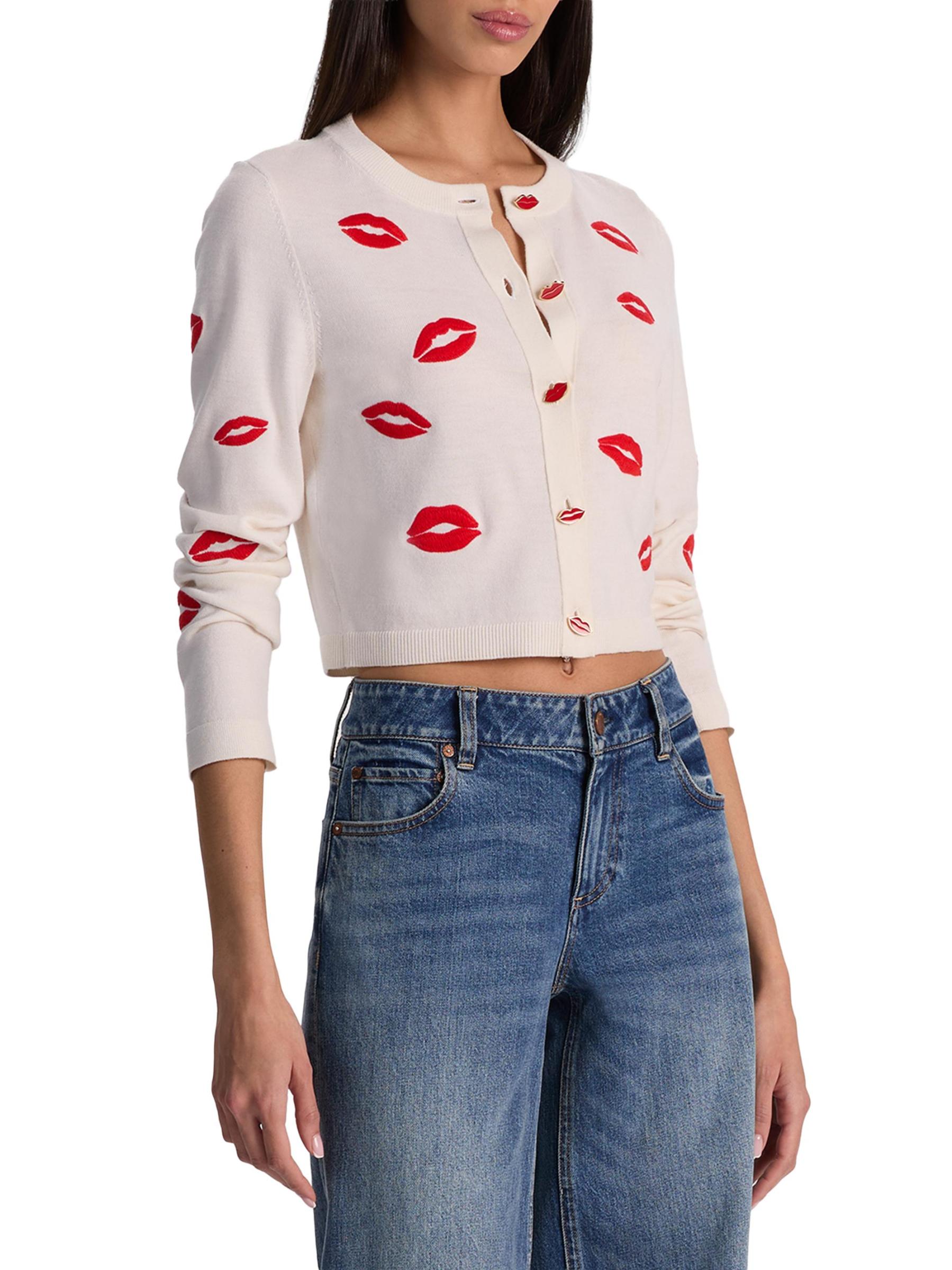 كارديجان دارودا هذا من Alice + Olivia مصنوع من الصوف المرن، وهو مطرّز بأحمر شفاه مرح على شكل قبلة. تُبرز أزرار الشفاه المزخرفة الفتحة الأمامية لهذا الطراز.