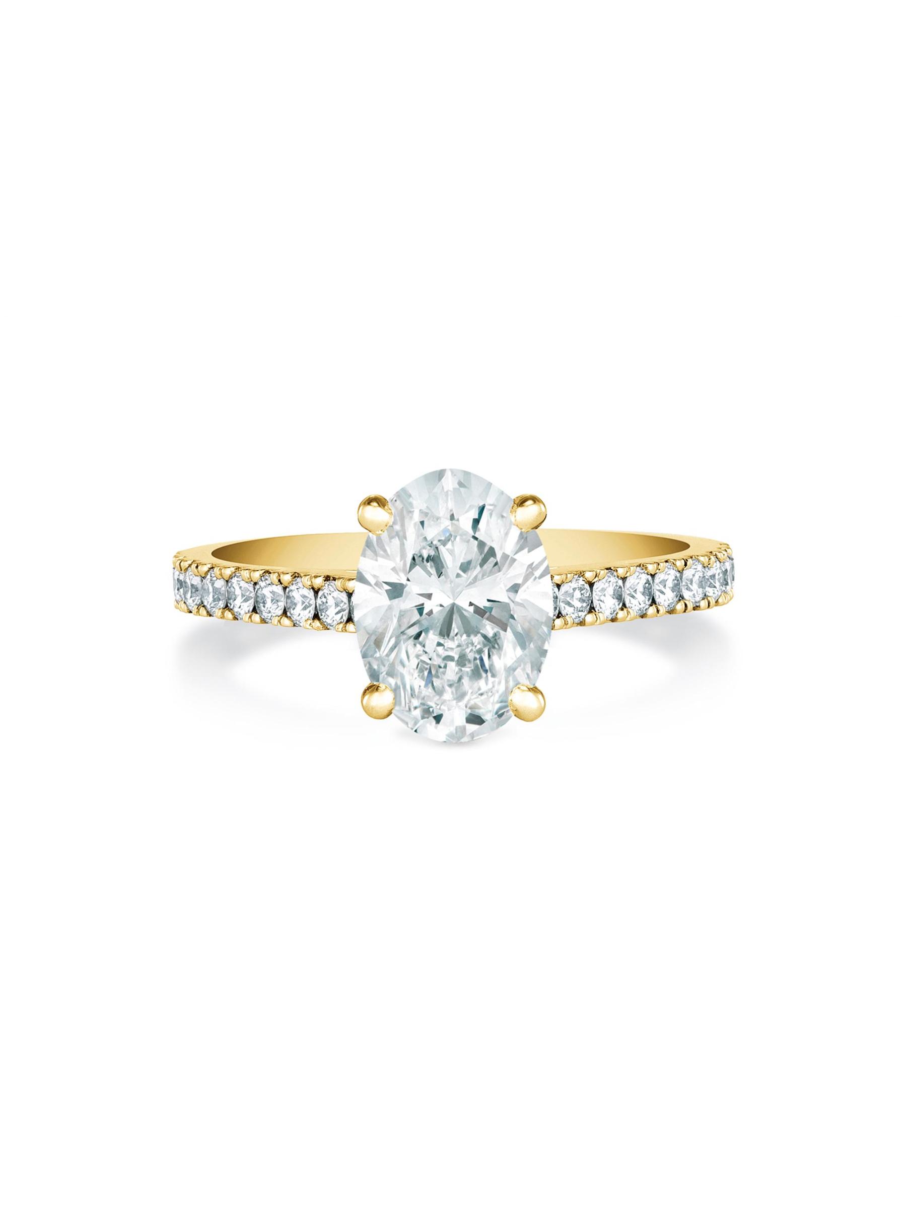 من مجموعة DB الكلاسيكية. خاتم De Beers Jewellers مصنوع من الذهب الأصفر عيار 18 قيراطًا، ويتميز بماسة بيضاوية لامعة في المنتصف يحيط بها صف من الألماس المرصوف عند كل كتف.