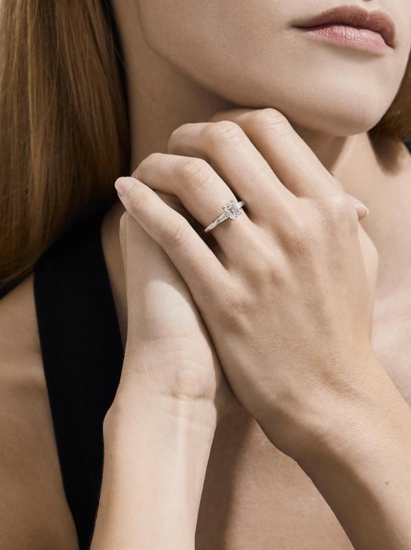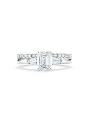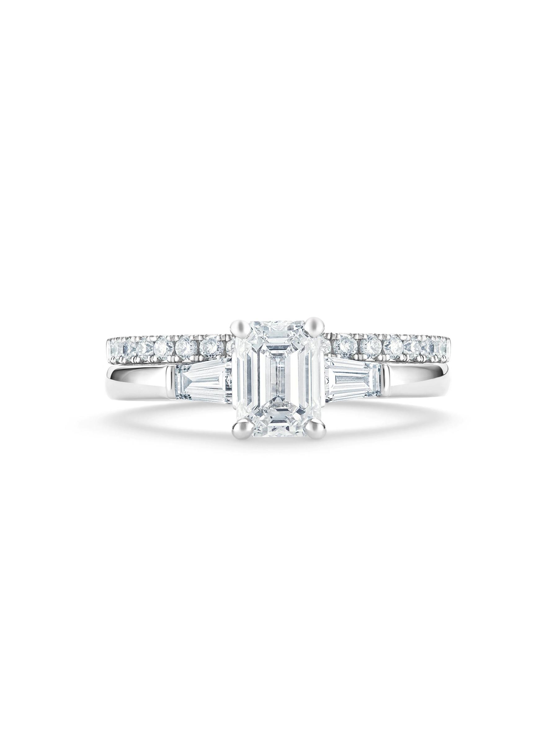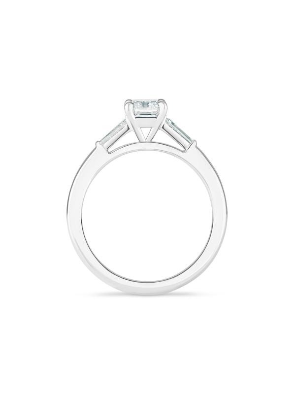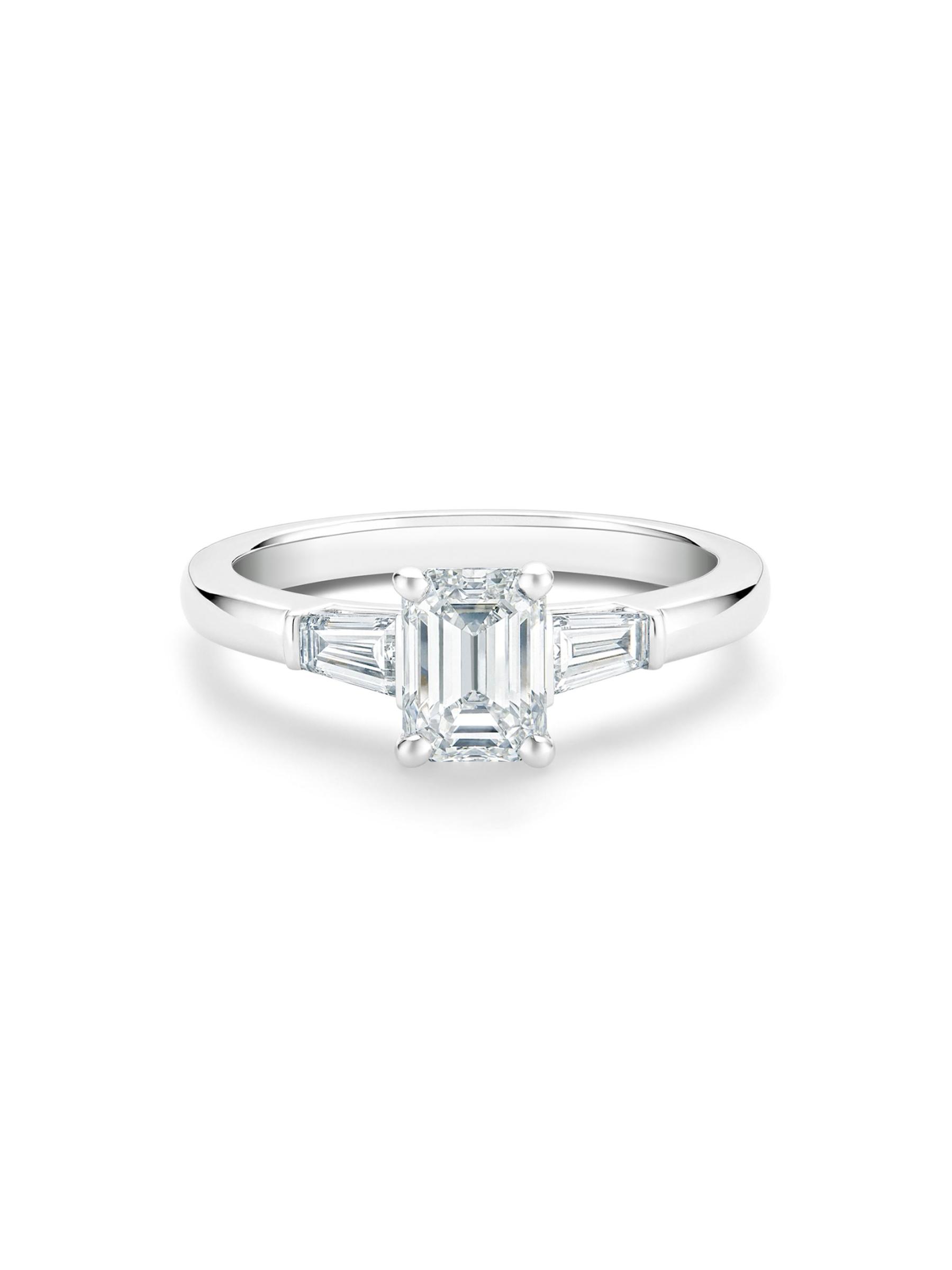 من مجموعة الكلاسيكيات. يتميز خاتم De Beers Jewellers المصنوع من البلاتين المصقول بماسة مذهلة مقطوعة بالزمرد محاطة بماستين مدببة من الباجيت. يتم اختيار كل حجر كريم يدويًا من قبل فريق من الخبراء لنيرانه وحياته وتألقه.