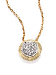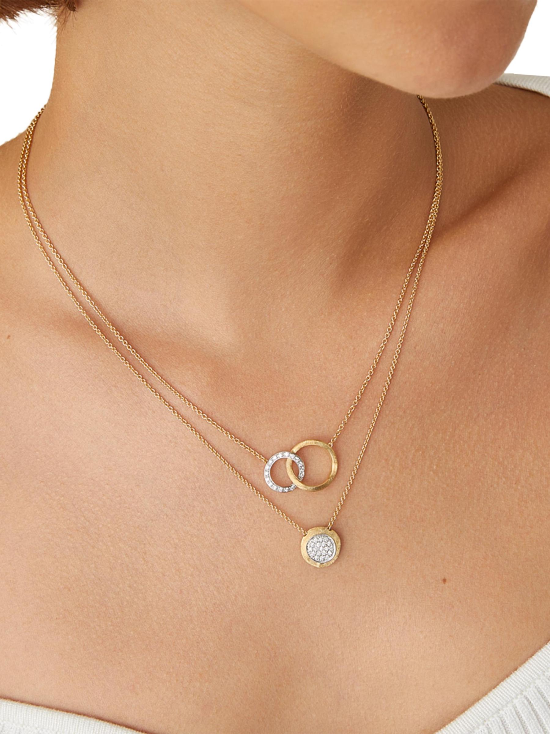من مجموعة ديليكاتي. تُبرز هذه القلادة، وهي مزيج أنيق من القوام والألوان، بريق الماس المرصوف، والتلميع الناعم للذهب الأبيض عيار 18 قيراطًا، وبريق الذهب الأصفر المميز لماركو بيسيغو المنقوش يدويًا عيار 18 قيراطًا.