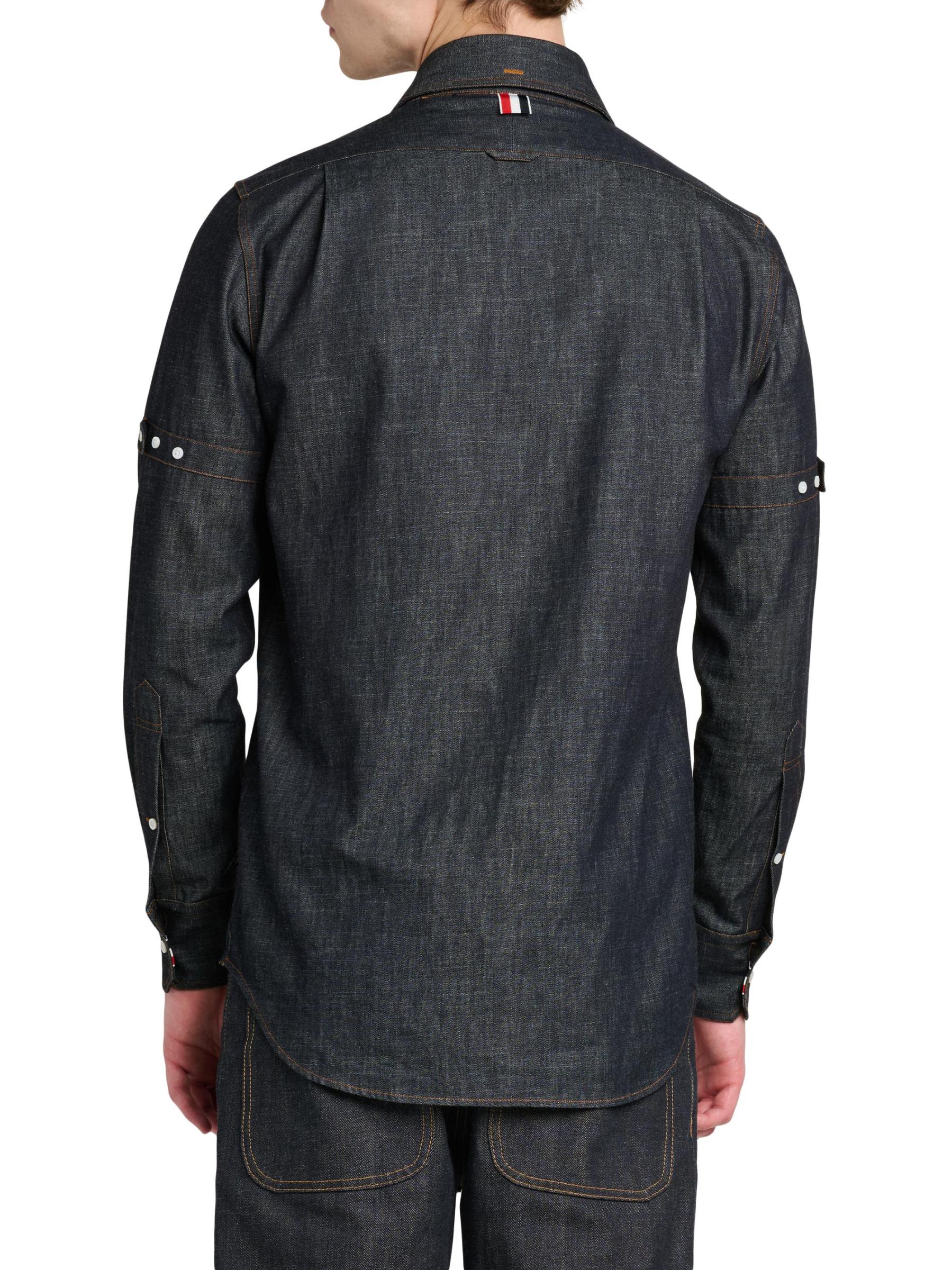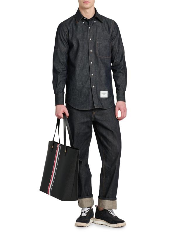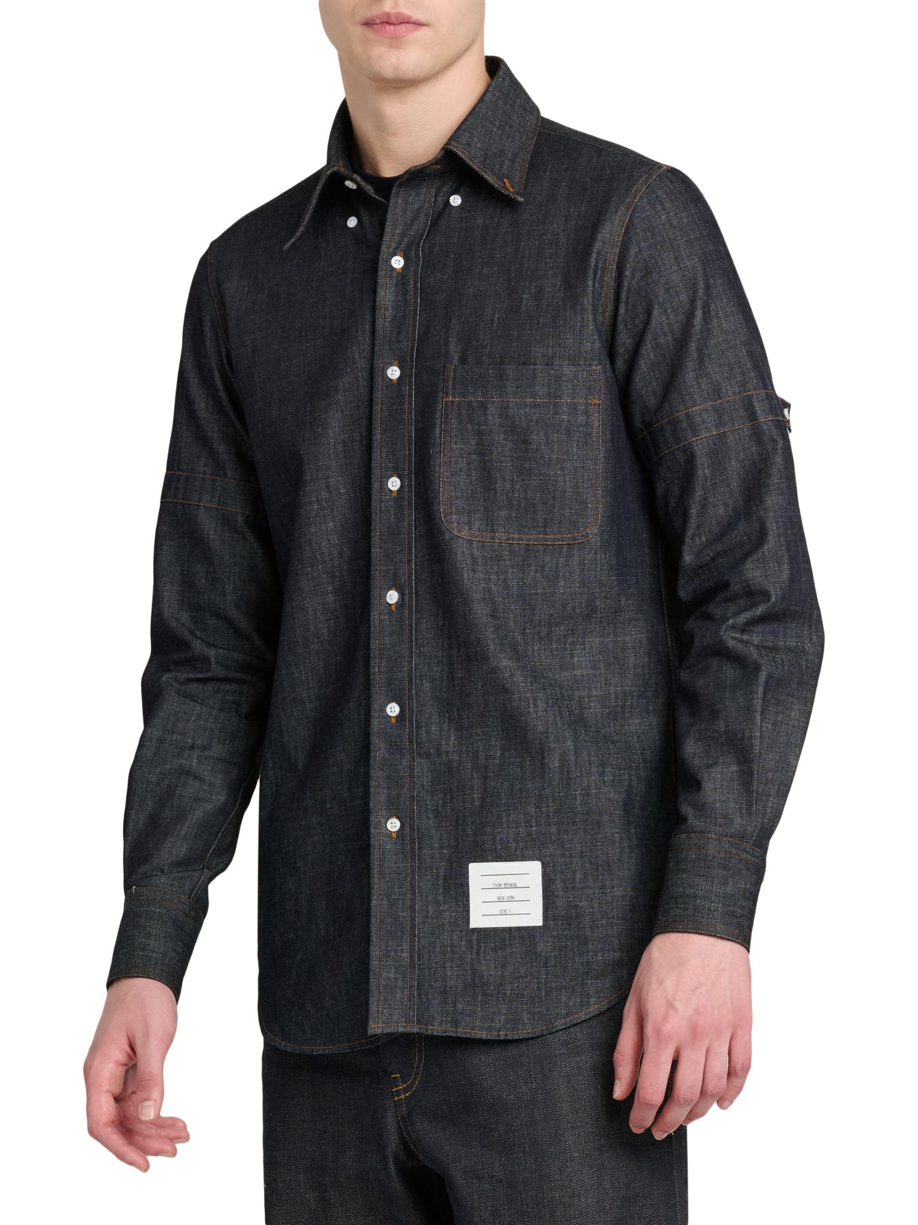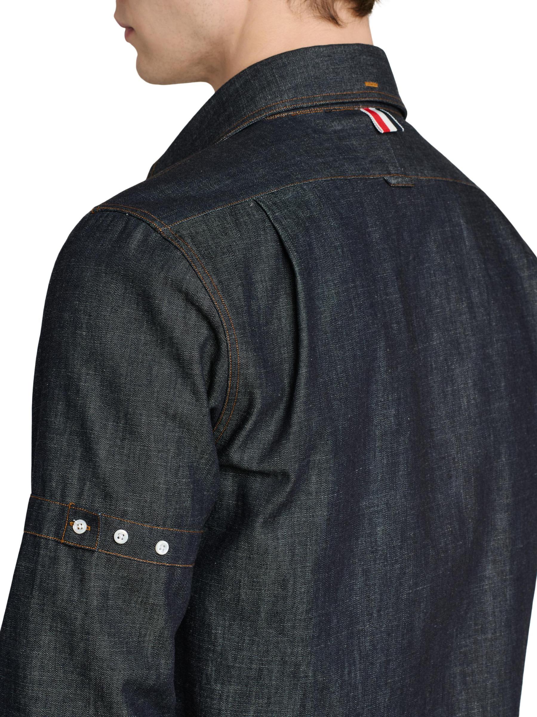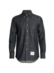 يتميز قميص Thom Browne المصنوع من الدنيم بياقة بأزرار وأكمام طويلة وحافة على شكل ذيل القميص. هذه القطعة كاملة بجيب على الصدر وشعار في الأمام.