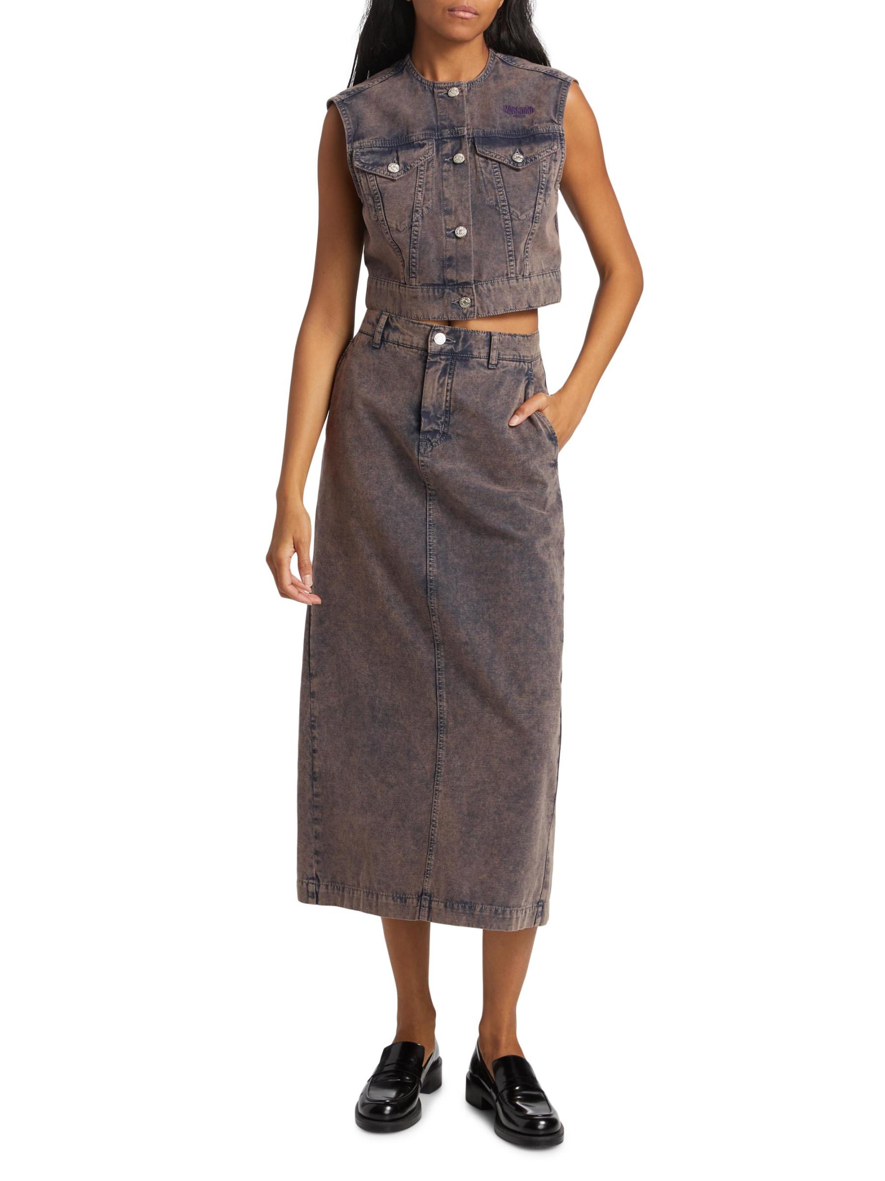 تتميّز تنورة موسكينو جينز المصنوعة من القطن بطول متوسط وقصّة مستقيمة. تم تصميم هذه القطعة بجيوب جانبية منزلقة تتجمع في الخلف وسحّاب لإطلالة كلاسيكية.