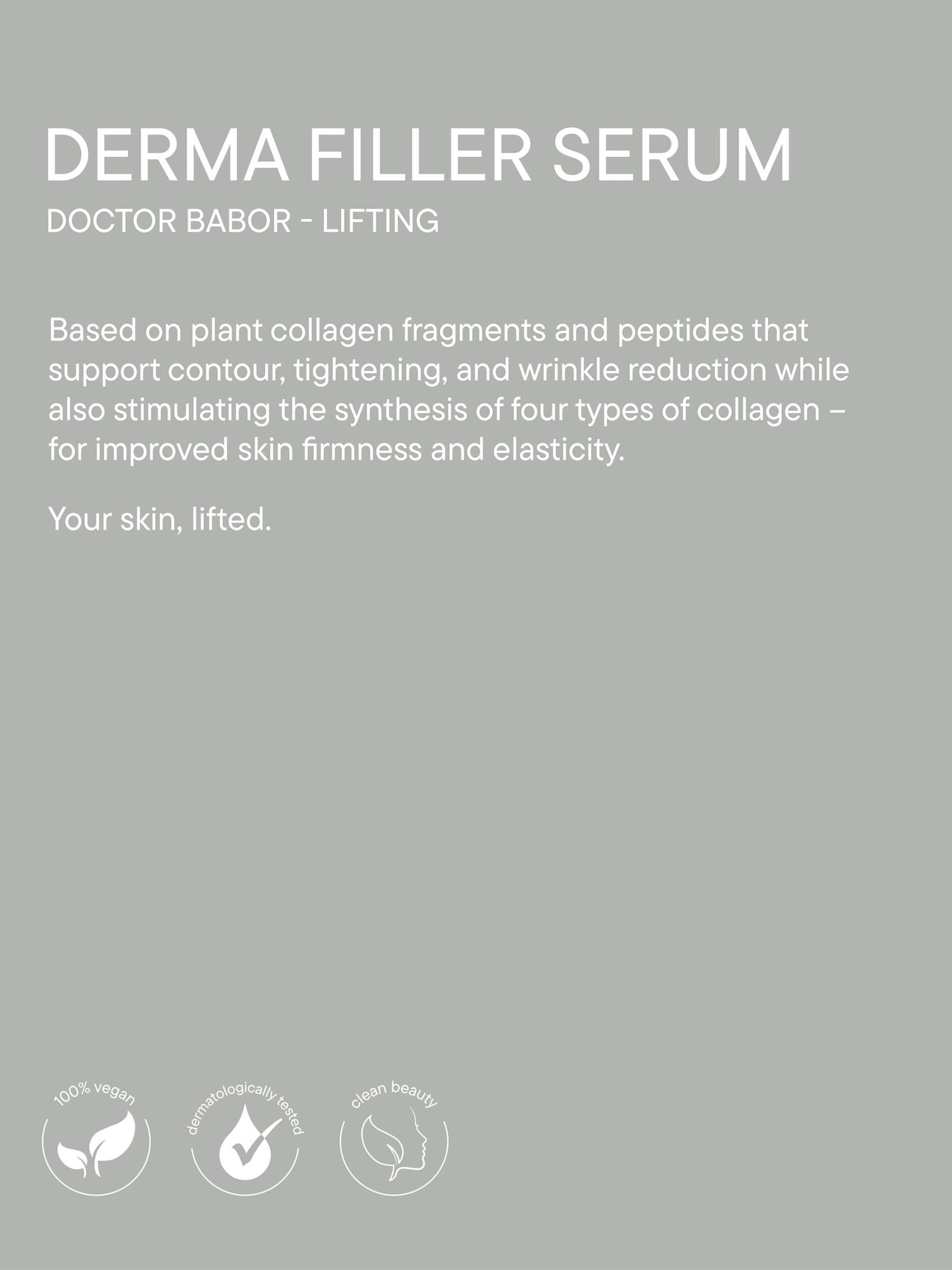 يتميز مصل Babor's Derma Filler بحمض الهيالورونيك منخفض الجزيئات، ويقوي الحاجز الواقي للبشرة، ويزيد من توازن رطوبة البشرة، ويقلل من فقدان الماء عبر الجلد لتقليل التجاعيد وتحسين ملمس البشرة. غني بمستخلص BIOGEN PLANT EXTRACT الحصري، الذي يُعد تتويجًا لأبحاث بابور، يتم تحفيز عمليات الجلد وبالتالي تعزيز رشاقة البشرة الشبابية. 1 أونصة مصنوعة في ألمانيا.