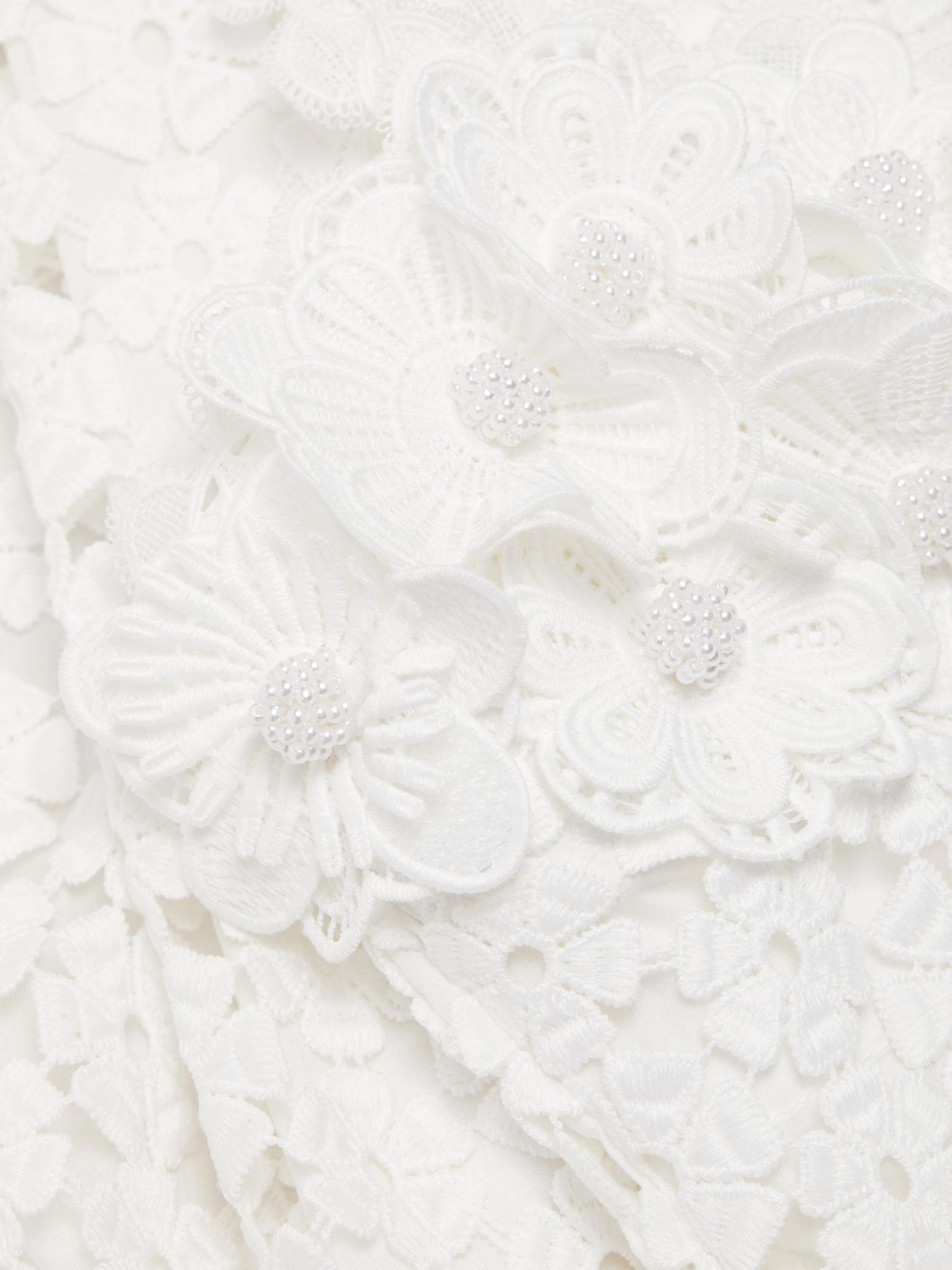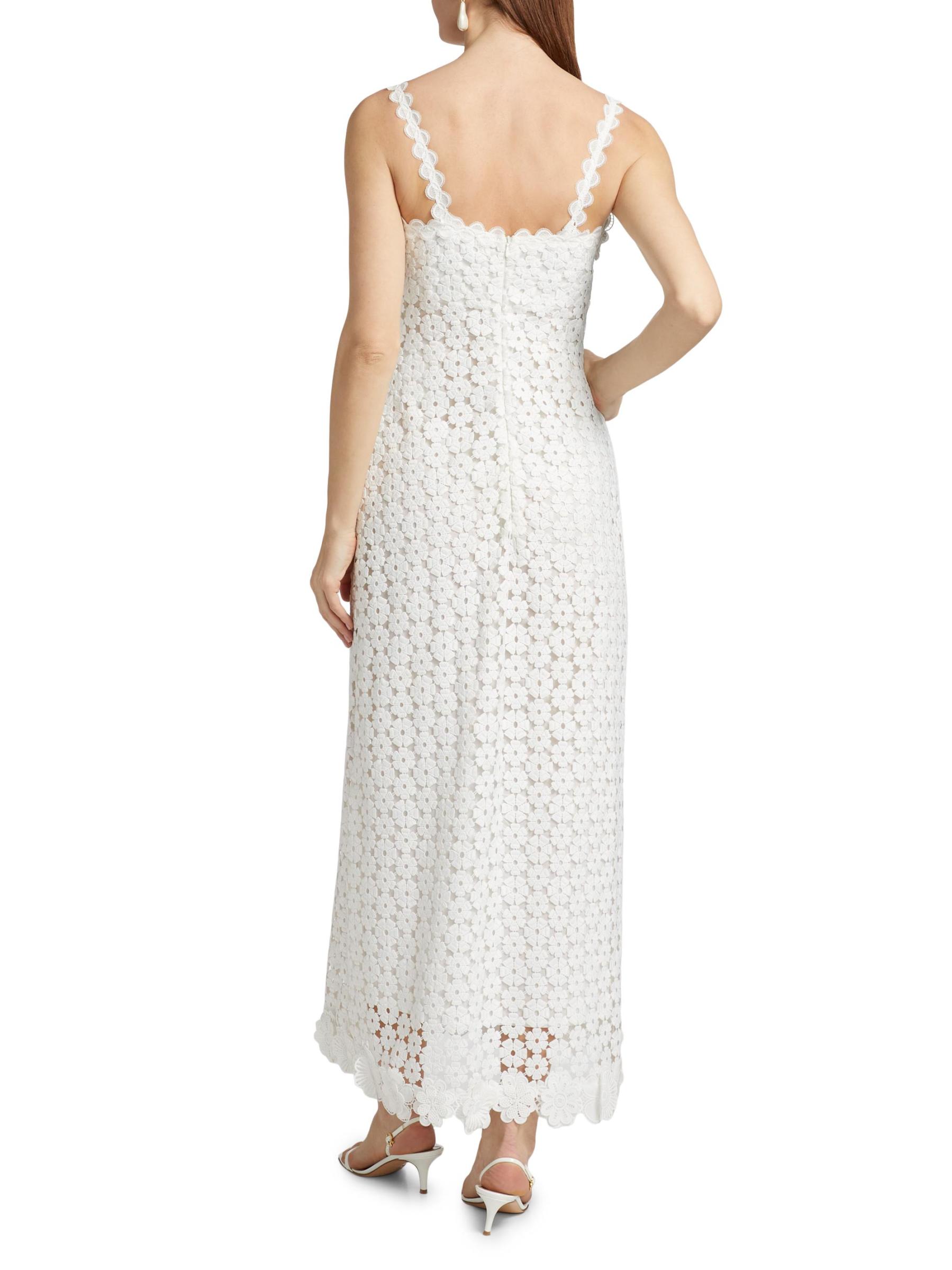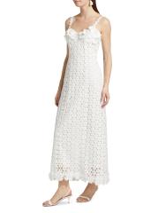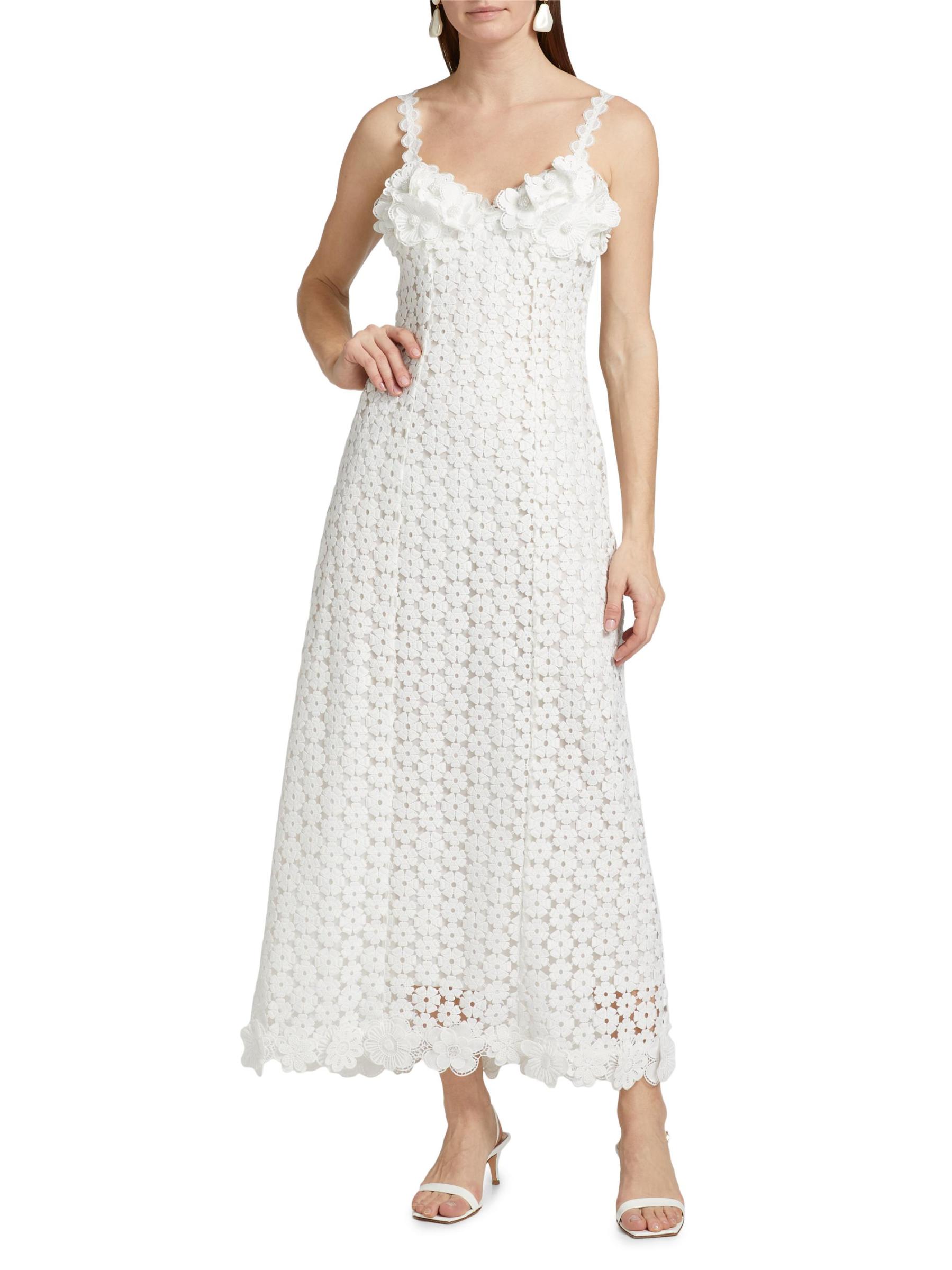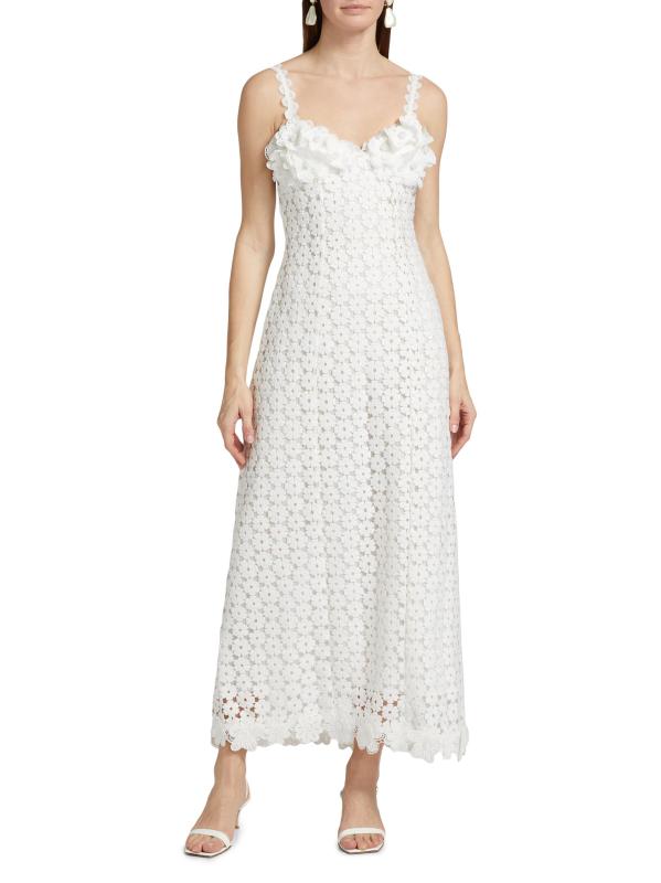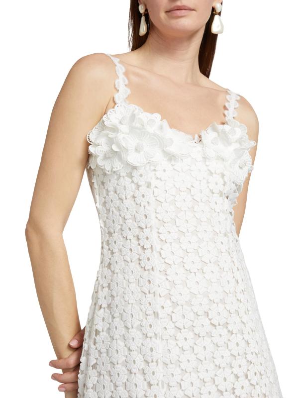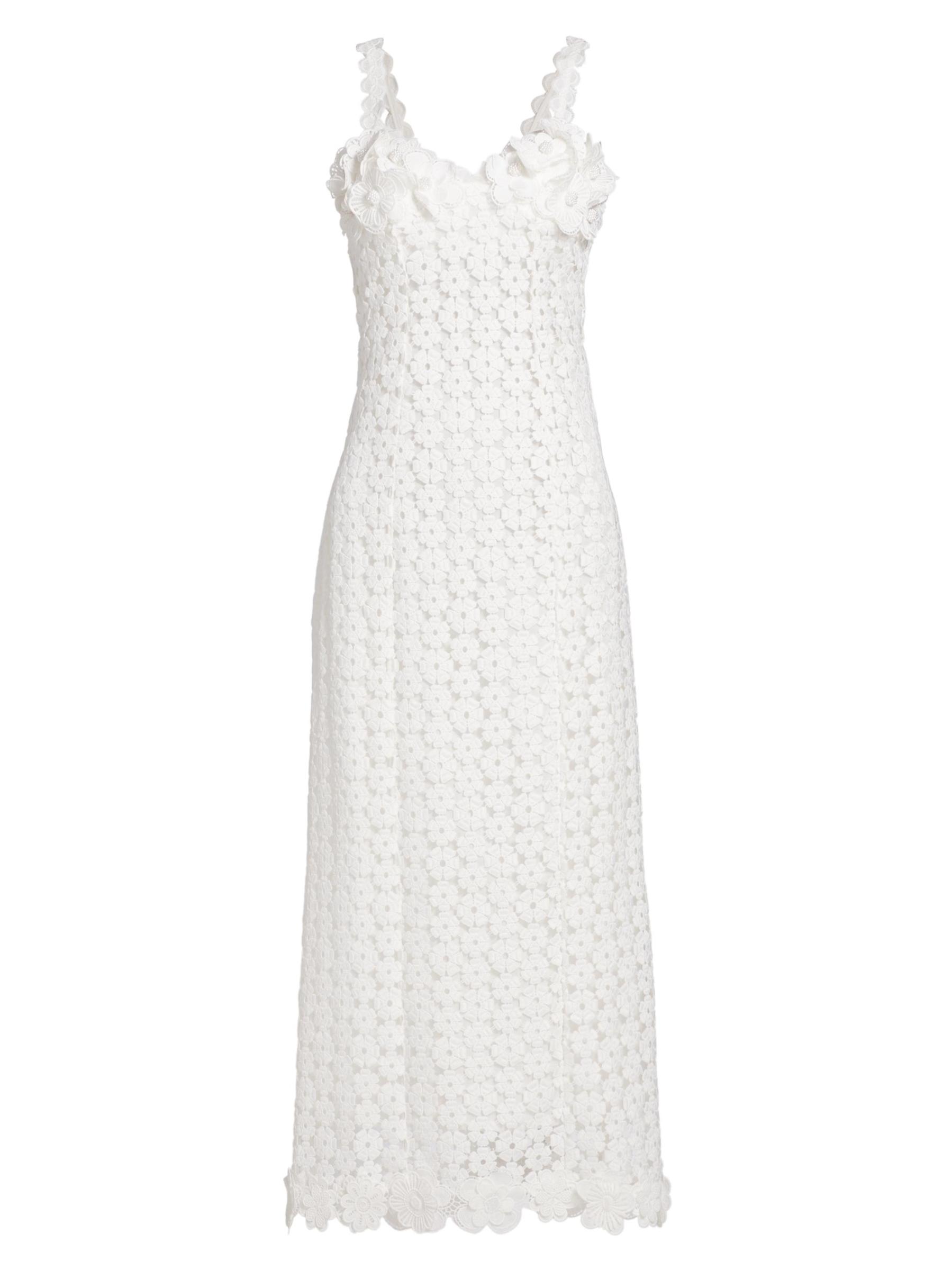 من مجموعة فلور ديل فينتو. يتميّز فستان «ديستين» الطويل الذي يغطي شكل قلب من Waimari بأحزمة من الدانتيل وتصميم مستقيم. هذه القطعة المزينة بالزهور المطرزة يدويًا تكملها زخارف مستديرة مصنوعة يدويًا من الخرز على أكواب الصدر والحاشية.