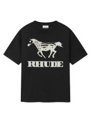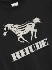تيشيرت Dinero ذو الرقبة المستديرة مصنوع من قطن الجيرسي ويتميز بشعار R H U D E مع رسم حصان بالعلم الأمريكي.