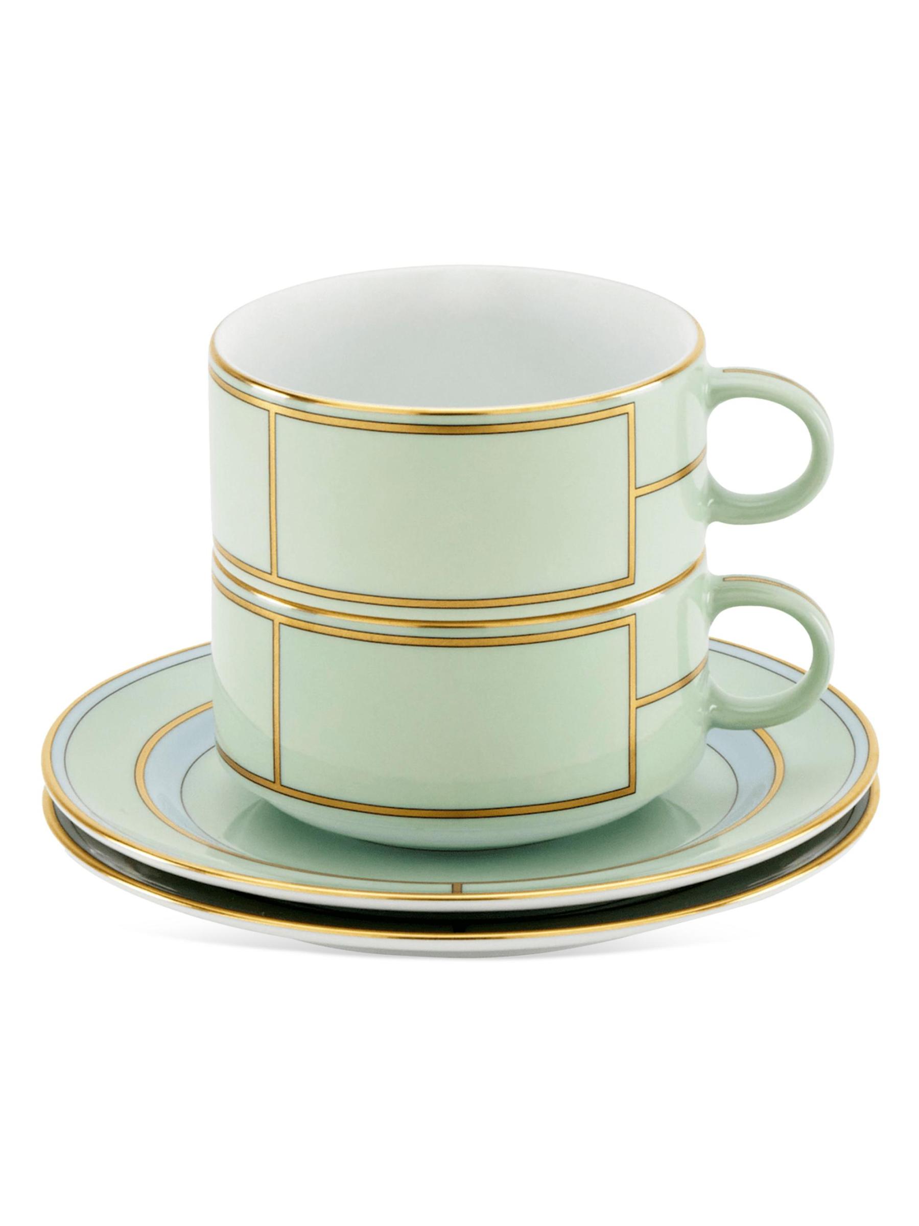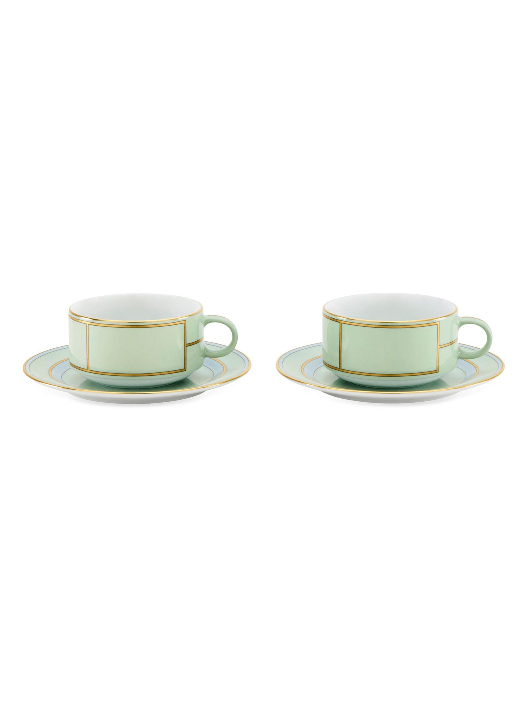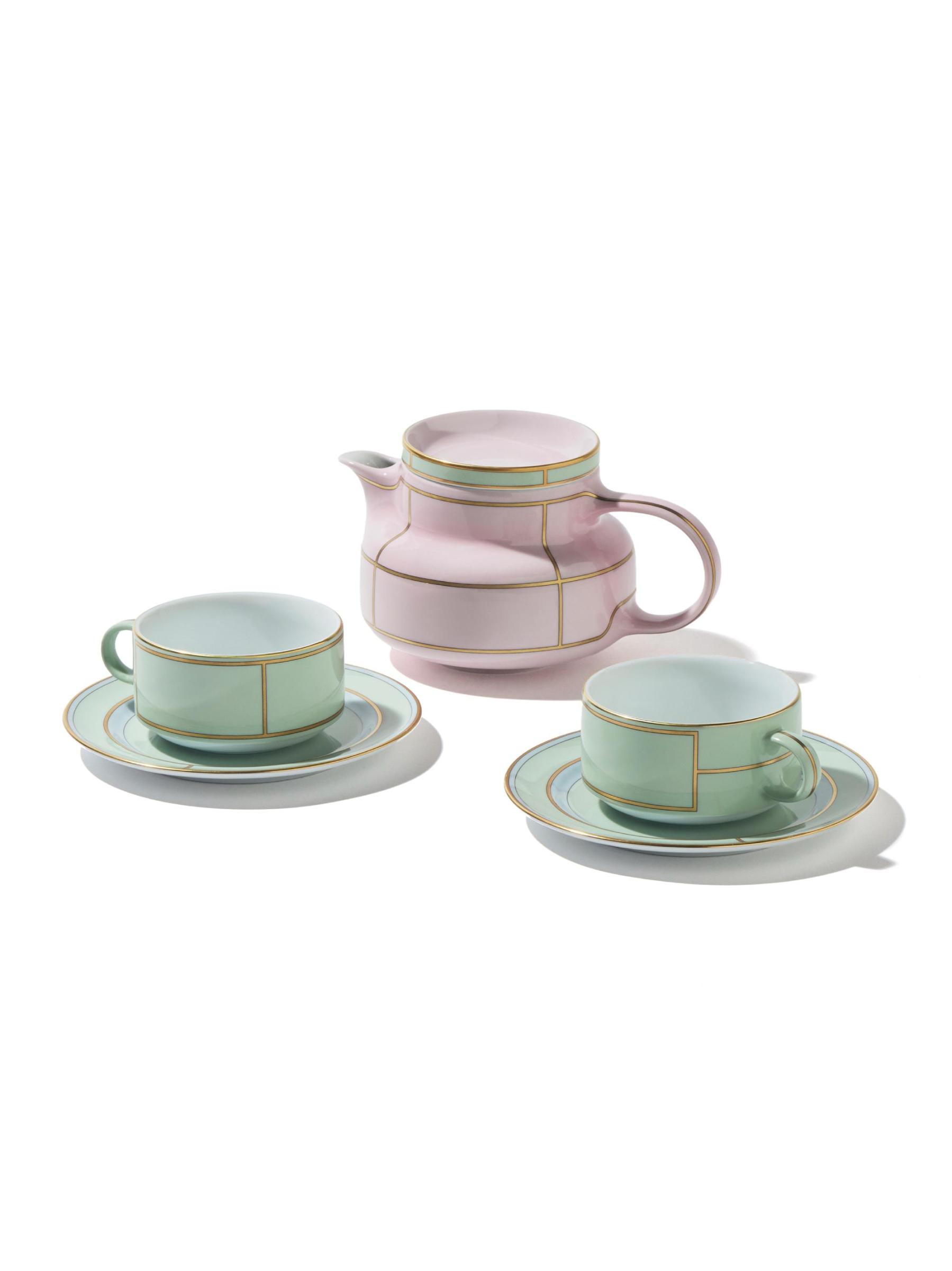 من مجموعة Diva. تشتمل مجموعة شاي Ginori 1735 على كوبين وصحون من البورسلين يتميزان بزخارف الباستيل المزخرفة بخيوط ذهبية معقدة، والتي تجسد شكل الكولونا الأيقوني من تصميم جيوفاني غاريبولدي المعروف بأناقته العملية منذ منتصف القرن العشرين.