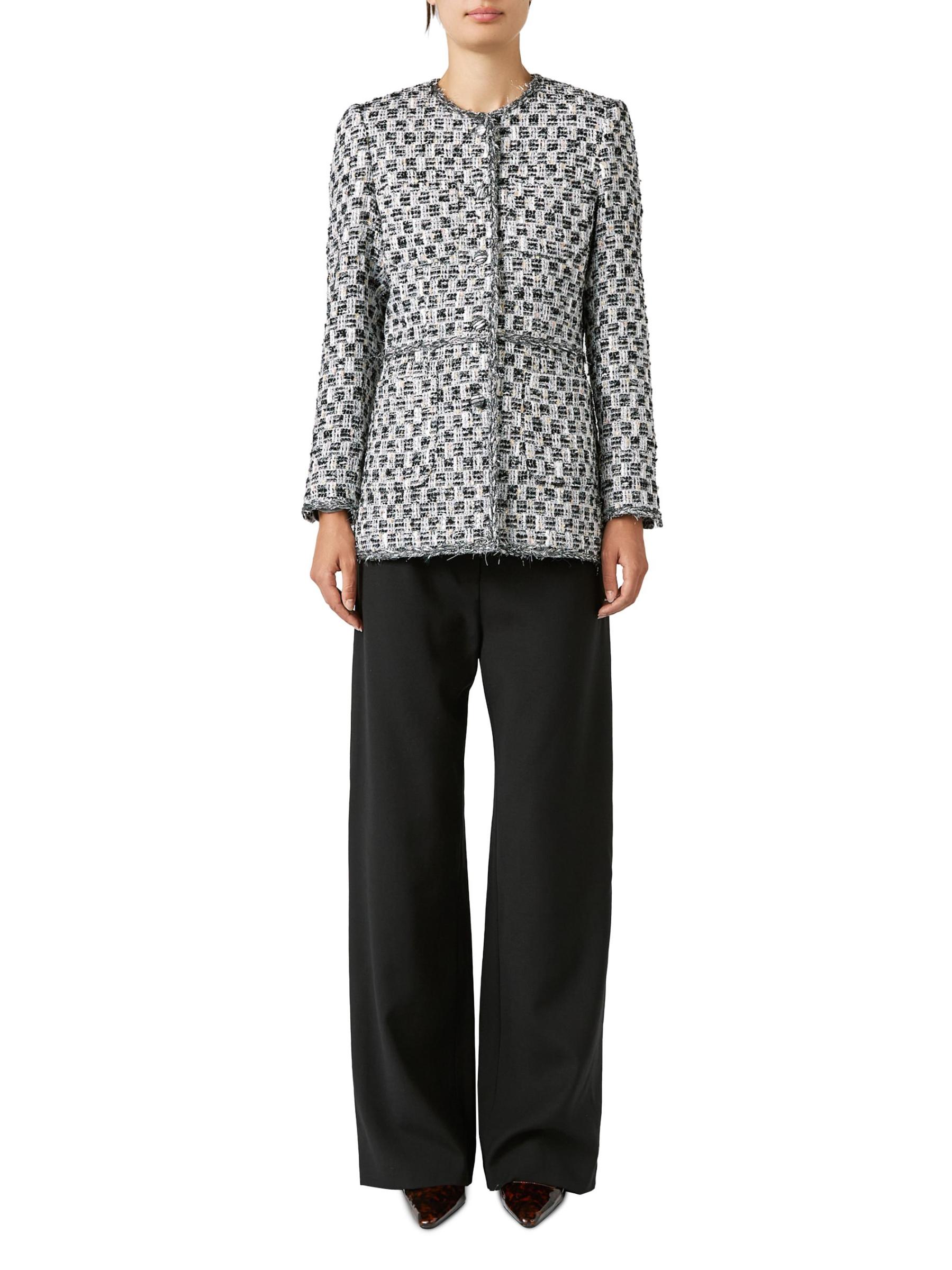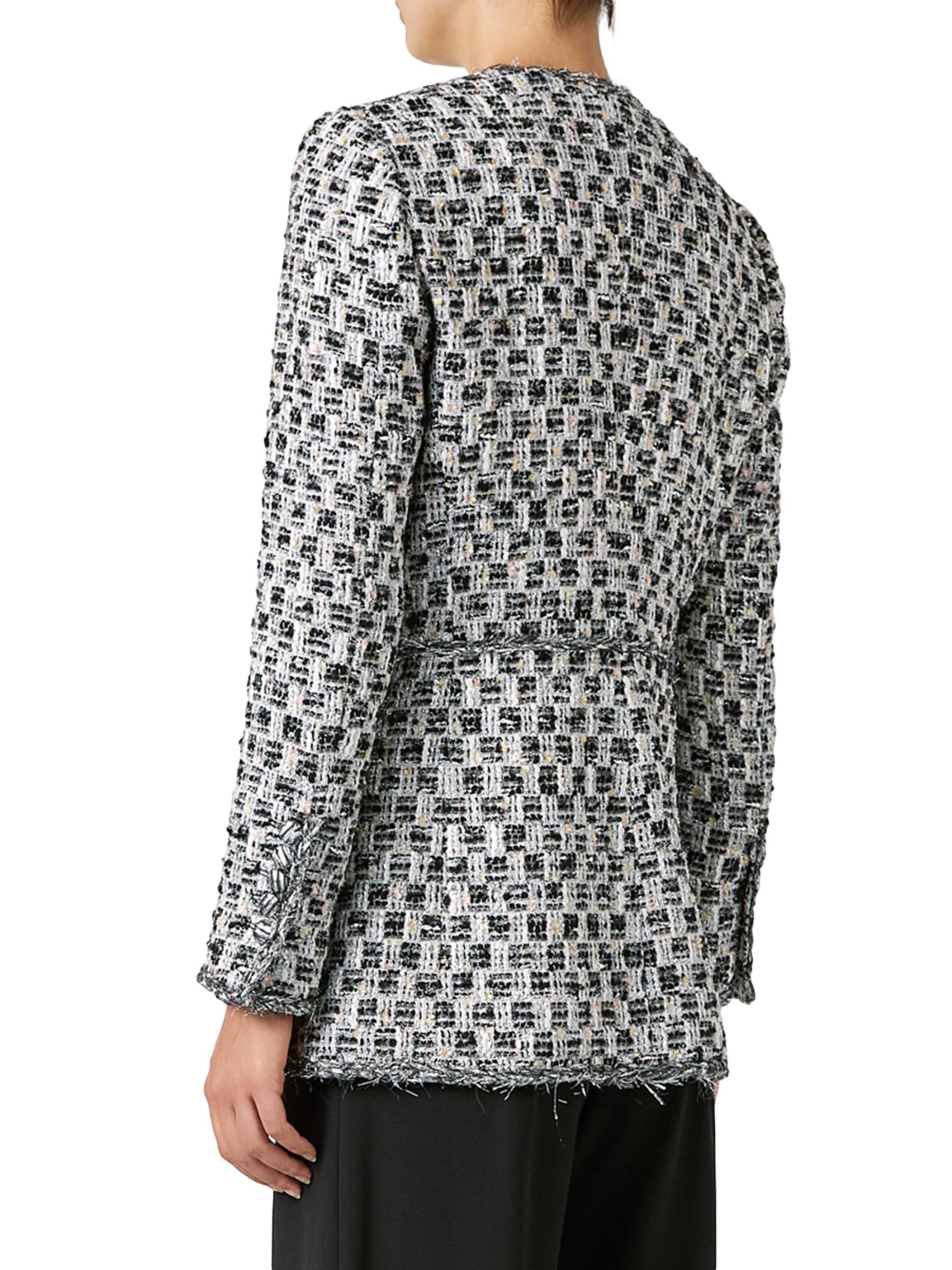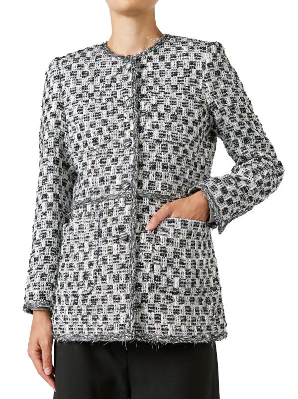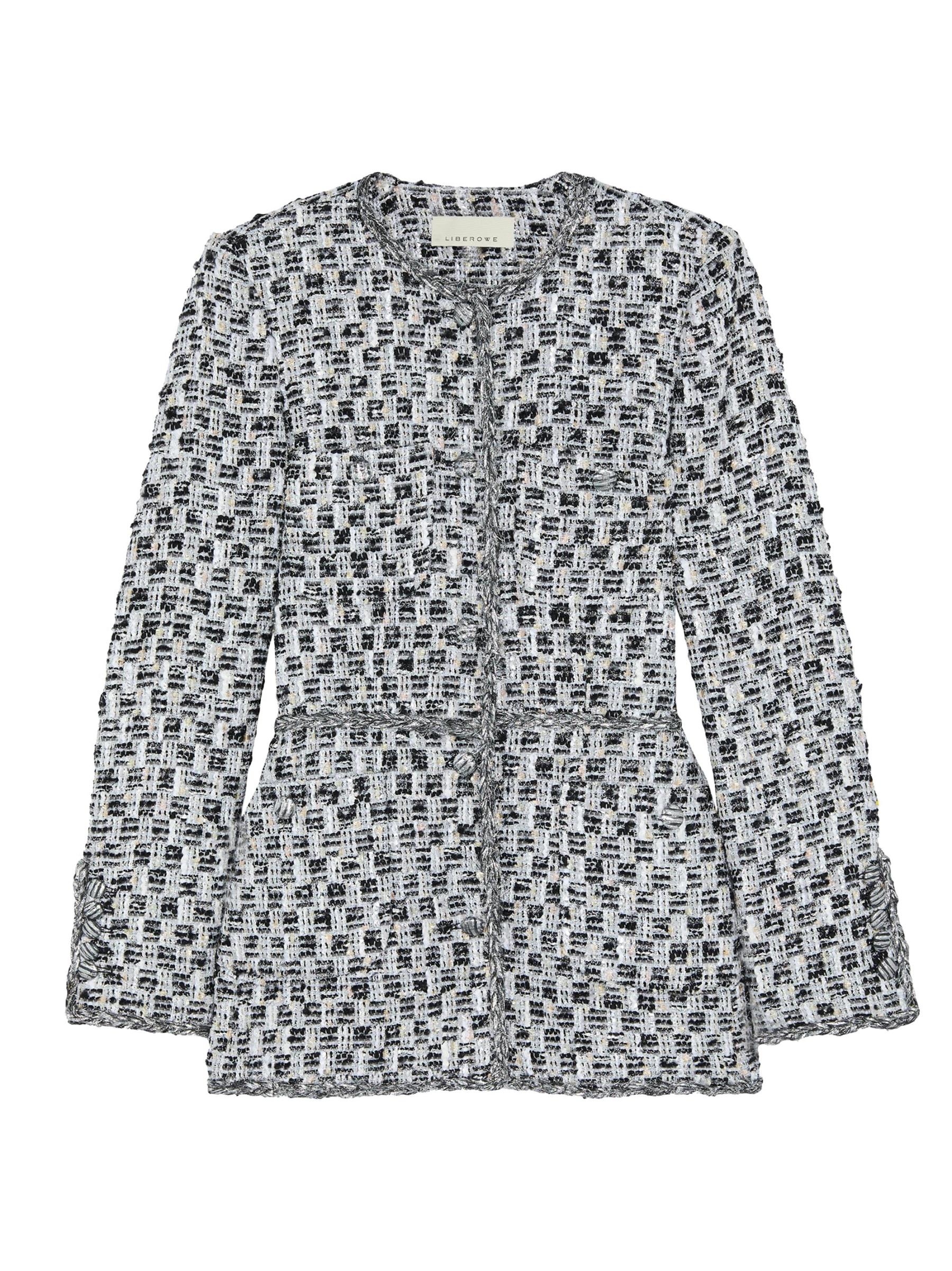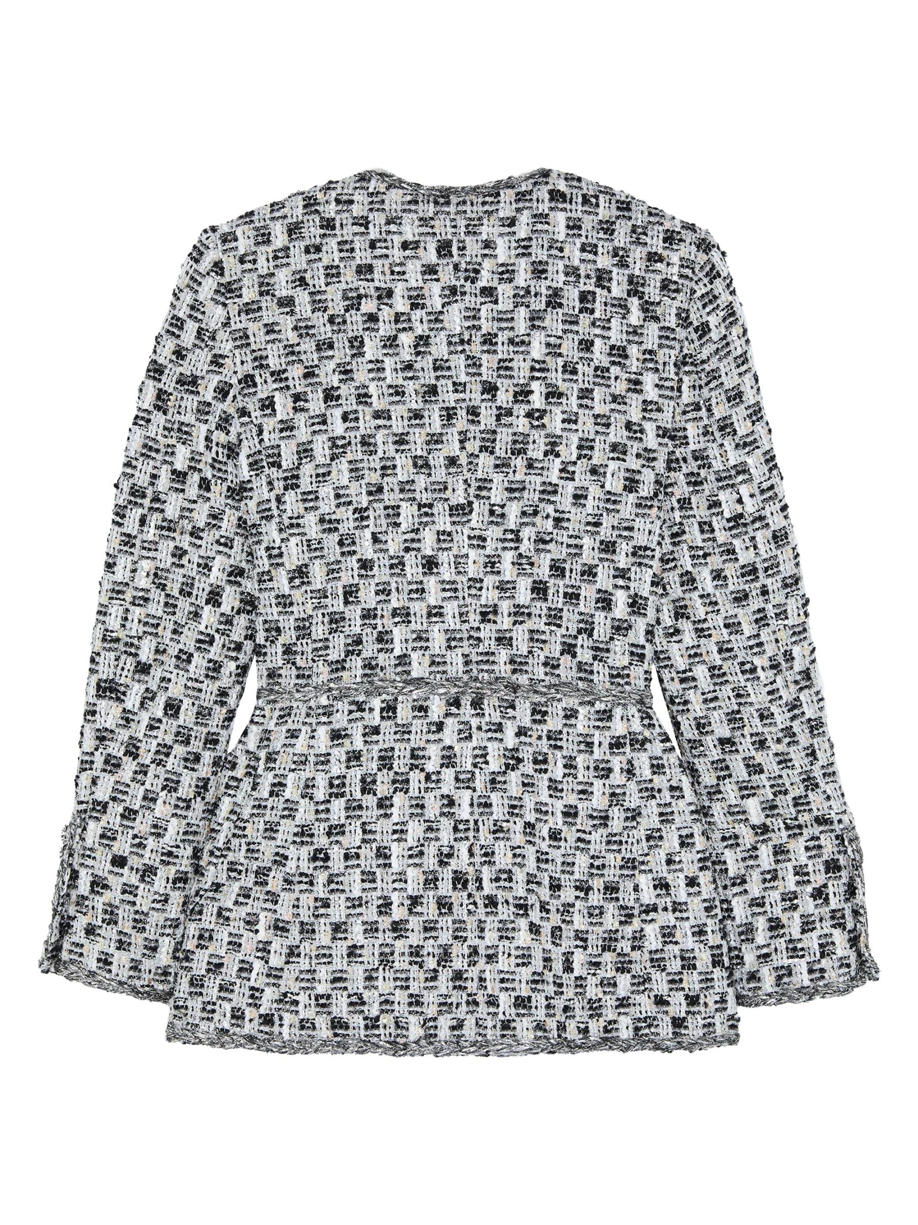 صُمّمت سترة Diya هذه من Liberowe من قماش التويد بتصميم هندسي منسوج لتمنحك مظهرًا أنيقًا. تتميز الزخرفة المضفرة برقبة الجواهر، والخصر الطبيعي، والأزرار الأمامية للإغلاق، والأساور، والحاشية.