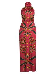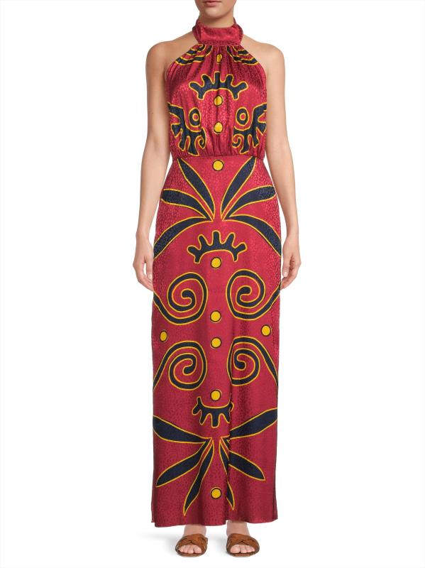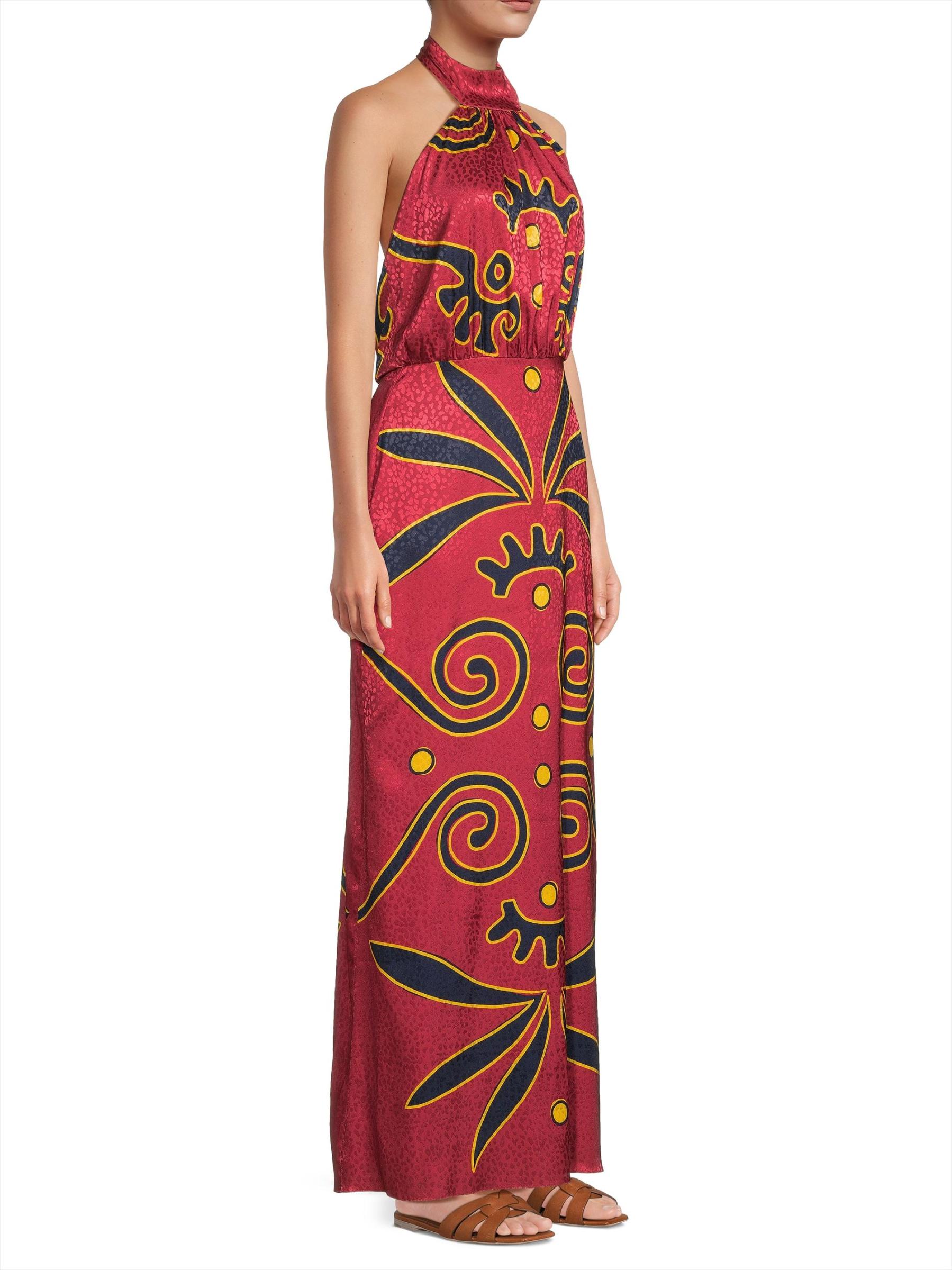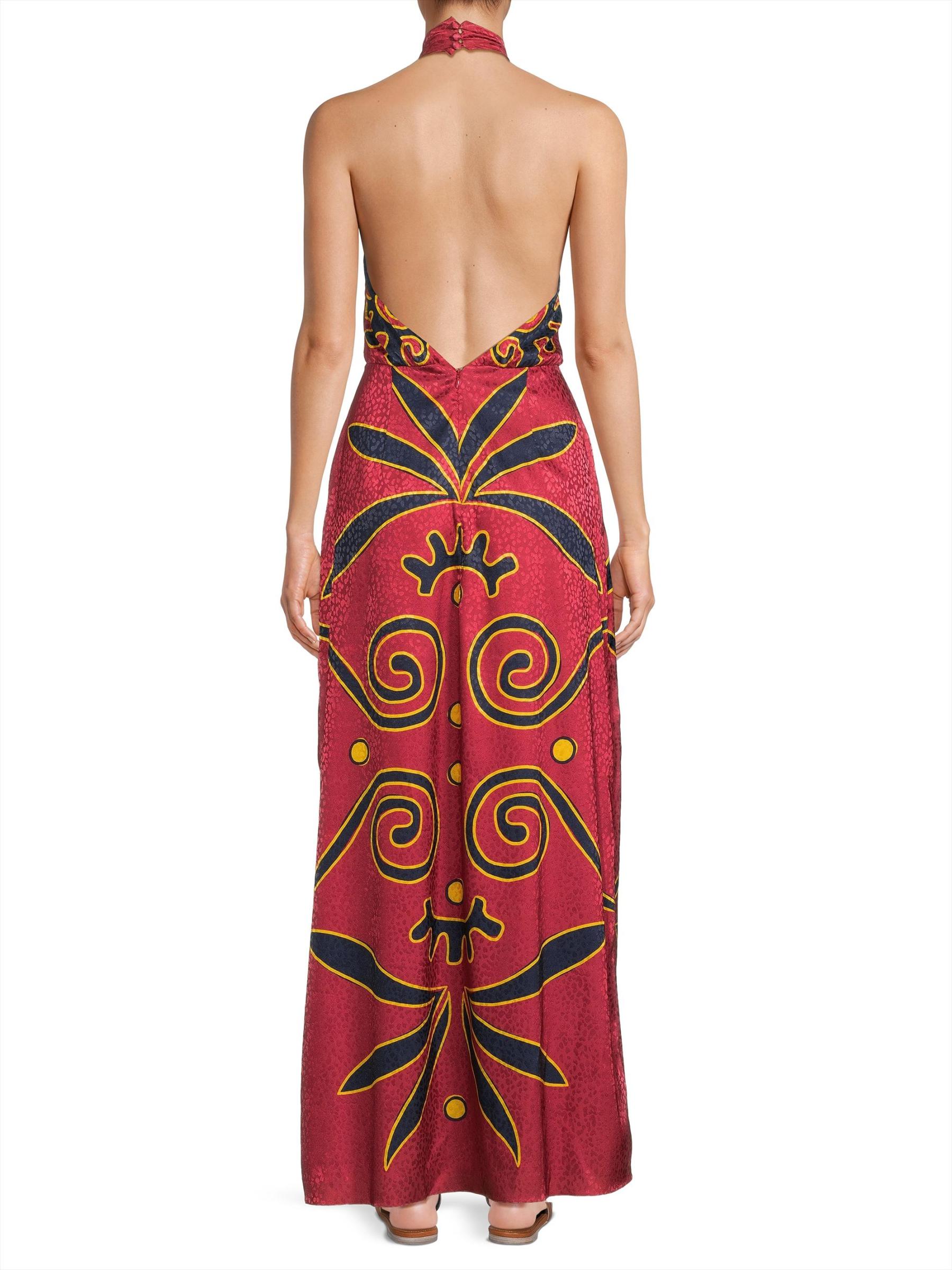 يتميز فستان Domenica maxi من Cala de la Cruz برقبة رسن وطبعة تجريدية جريئة وظهر مفتوح.