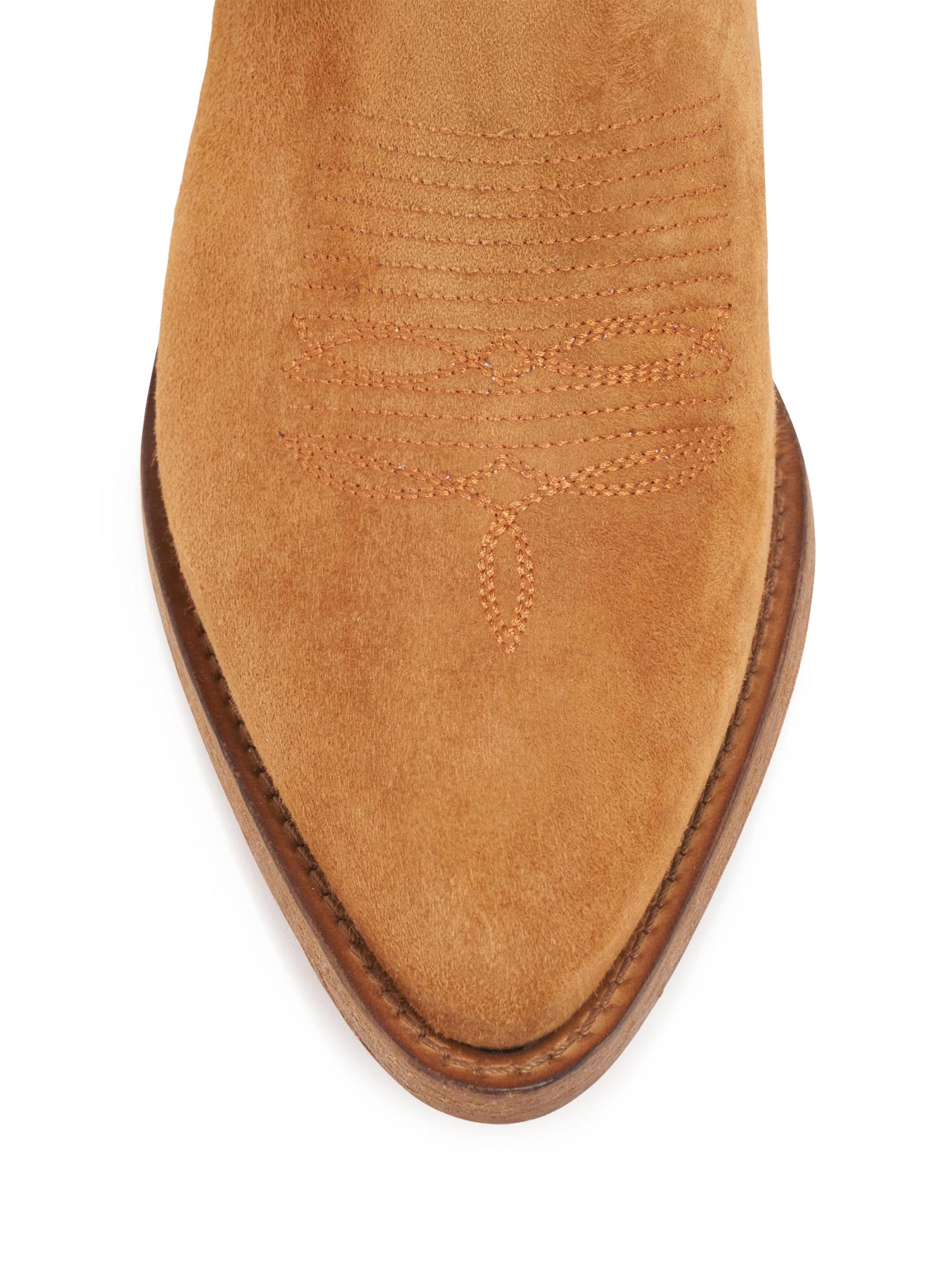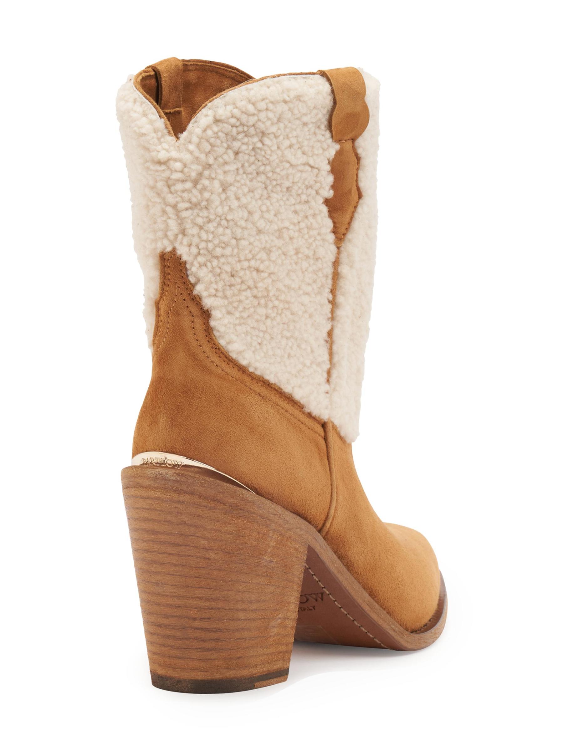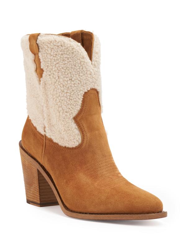 حذاء Donna Western-Style للكاحل من Partlow مصنوع من الجلد المدبوغ الناعم مع ألواح من قماش الشيرلينغ المخملي.