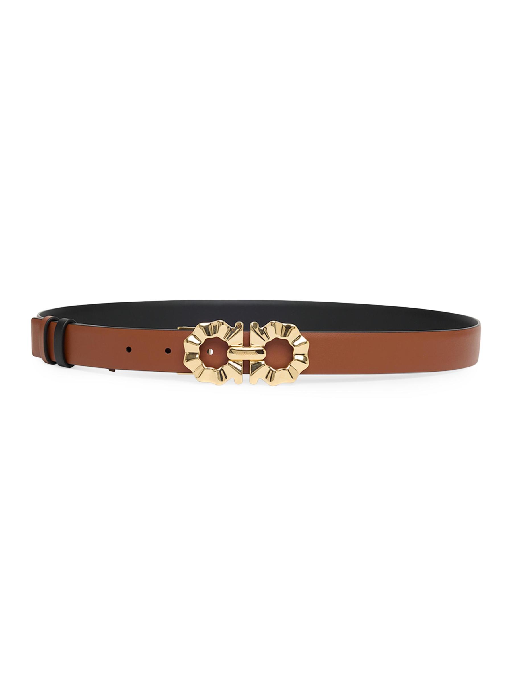 حزام Donna هذا من FERRAGAMO، المصنوع من الجلد، ينعكس من البني إلى الأسود ويتميز بإبزيم Gancini مزدوج باللون الذهبي.