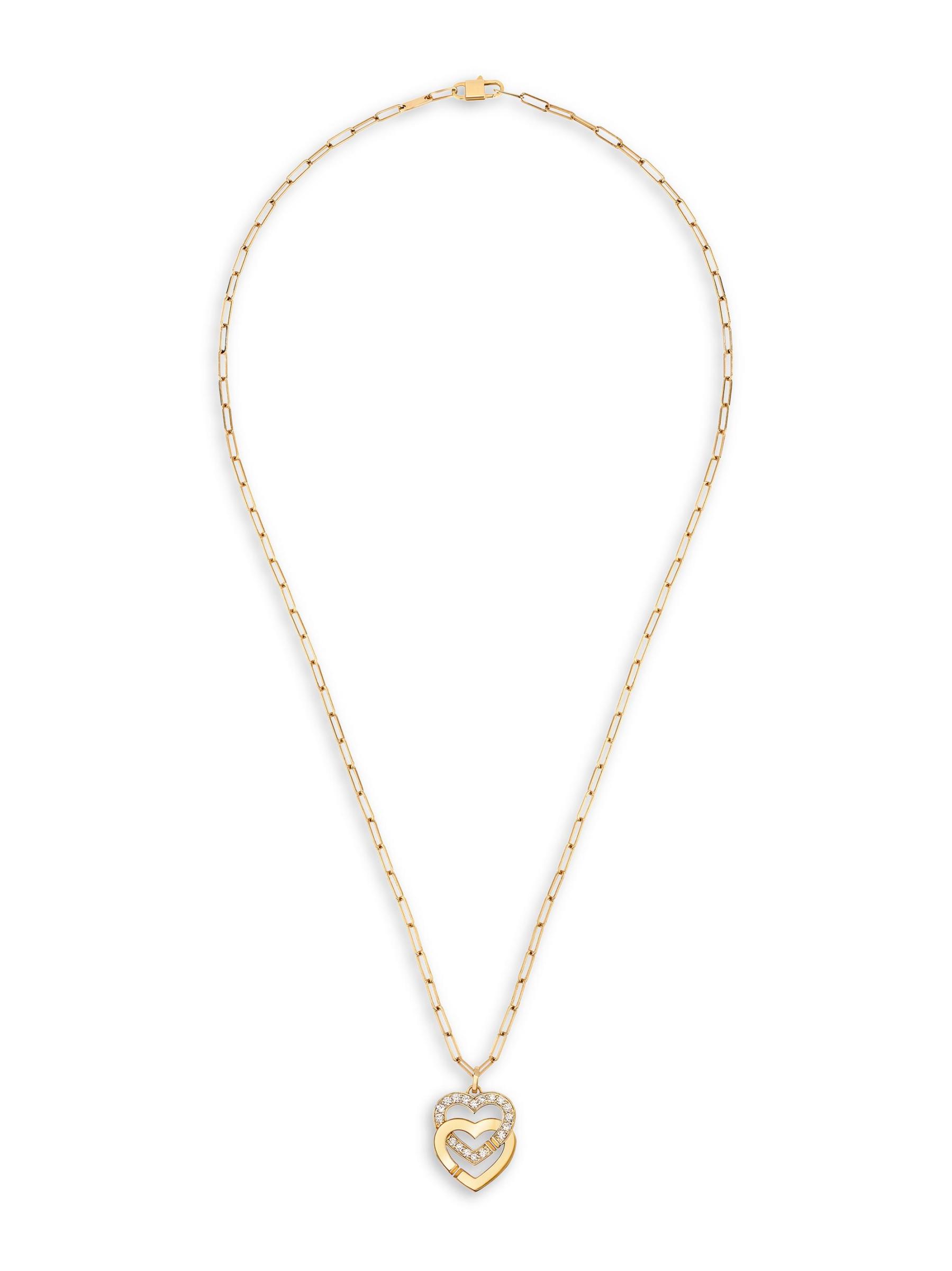من مجموعة دبل كورس. تتميز قلادة Double Couers المصنوعة من الذهب الأصفر عيار 18 قيراطًا من Dinh Van بدلاقتين متشابكين على شكل قلب معلقتين من سلسلة مشبك ورقي رفيع. مستوحاة من روابط الحب والصداقة، تم ترصيع هذه التعويذات الرومانسية بأحجار الماس البيضاء المتلألئة للحصول على تأثير مبهر.