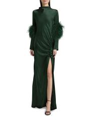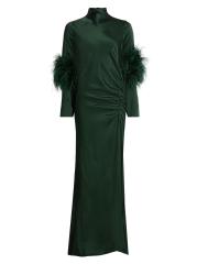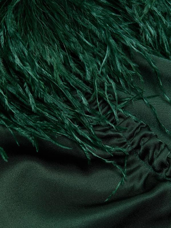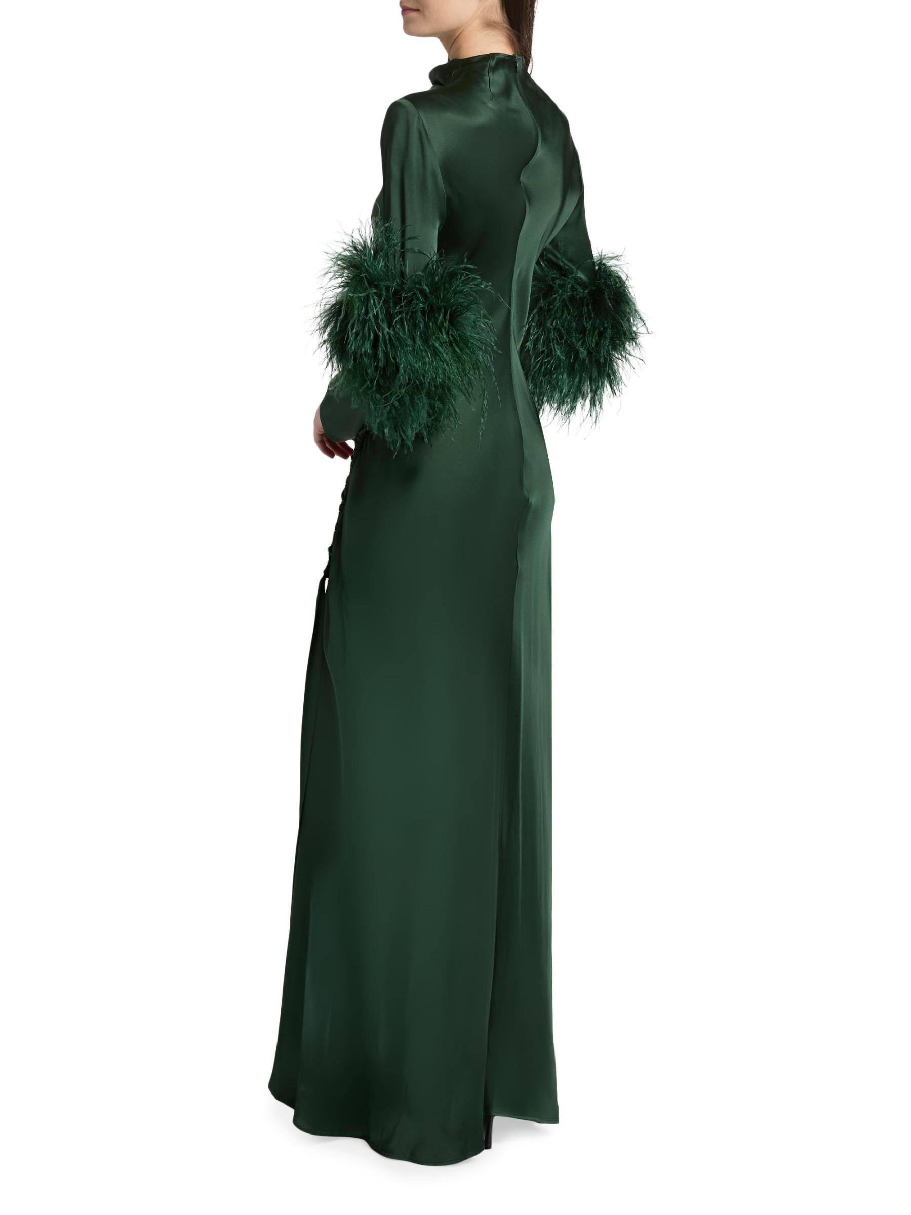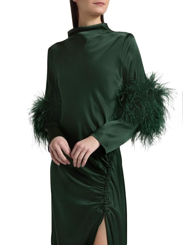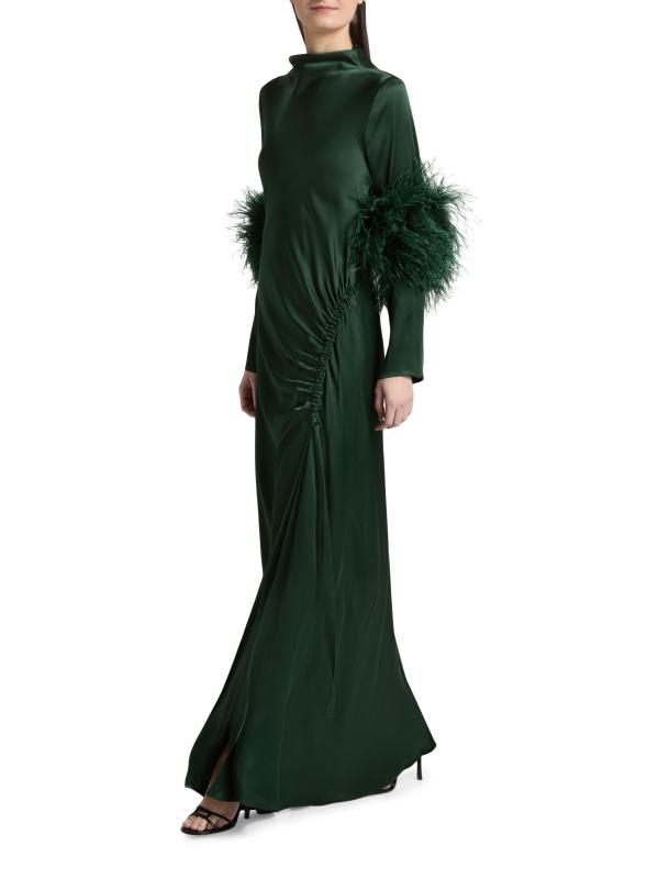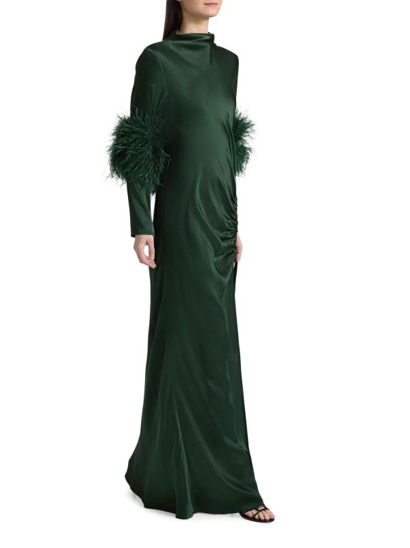 يُبرز هذا الفستان المزركش من لابوينت، المصنوع من الساتان ذو الوجهين، الأكواع بأعمدة من ريش النعام المتناسق.