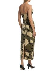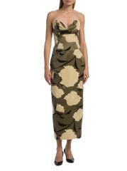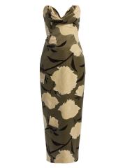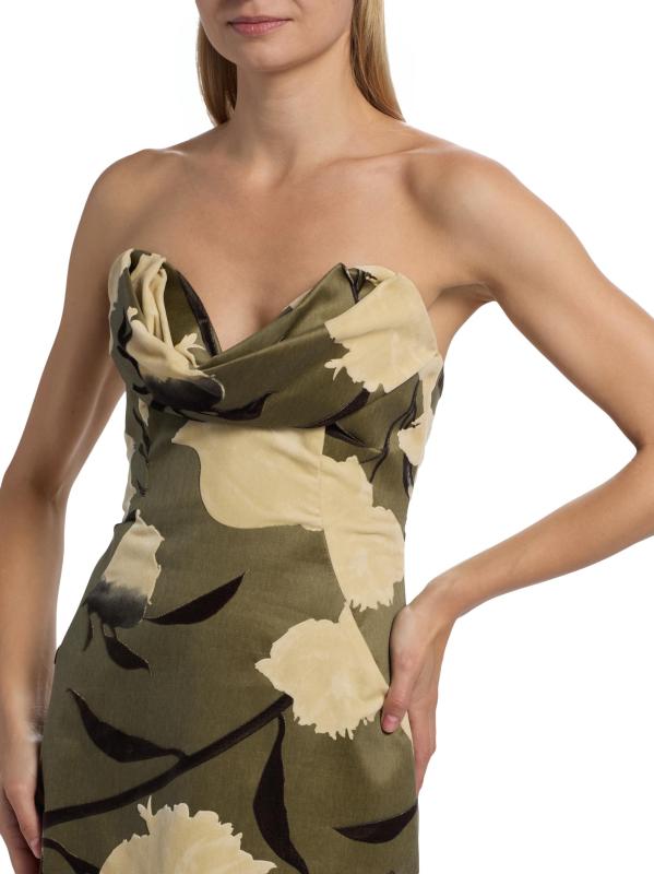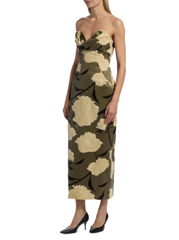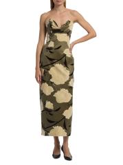 يتميز فستان الكوكتيل الغمد من Lela Rose المصنوع من القطن الخفيف بتقويرة رومنسية منسدلة وتصميم بدون حمالات وشق خلفي.