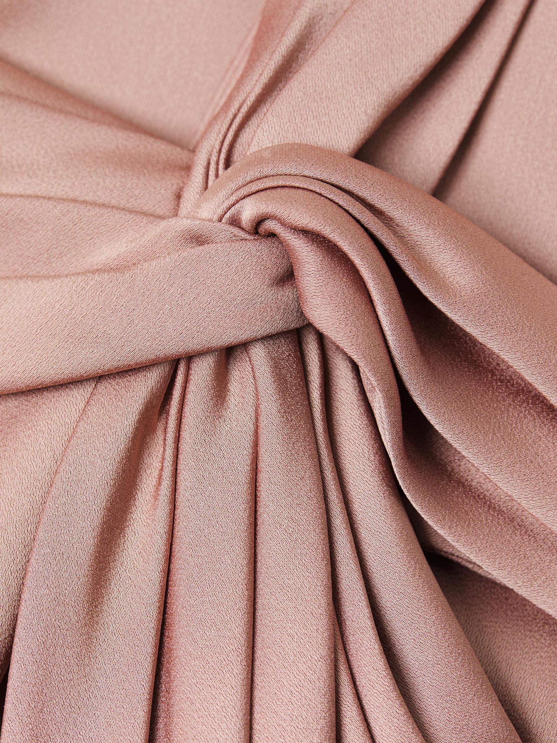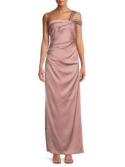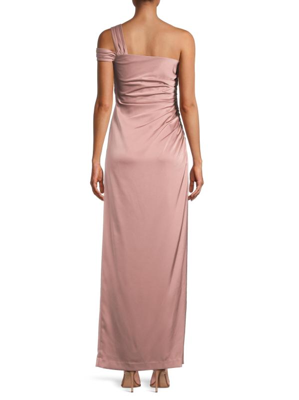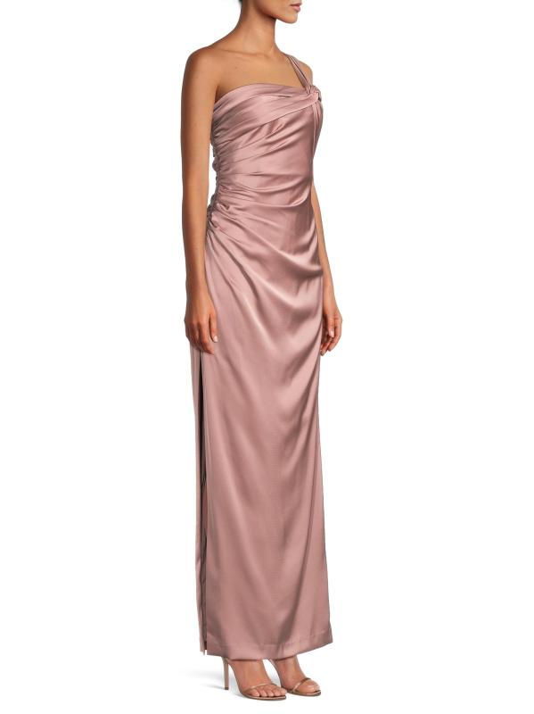 يُضفي فستان Aidan Mattox العمودي المصنوع من الساتان المدعم بالكريب مزيدًا من الأناقة على التصميم من خلال تقويرة رومانسية بكتف واحد وتفاصيل ثنيات.