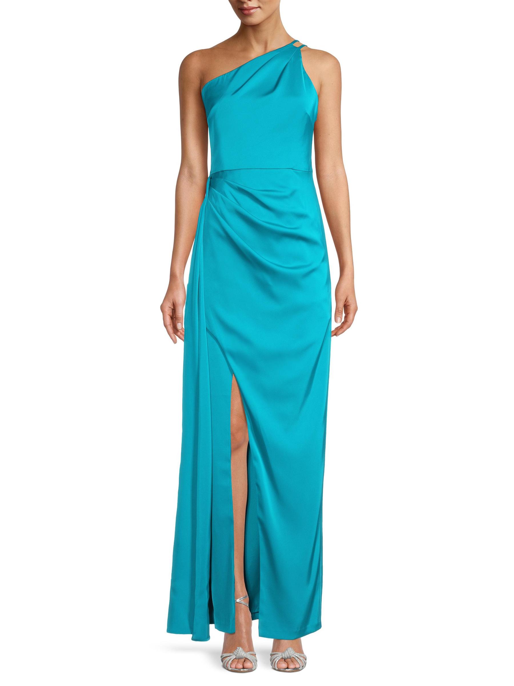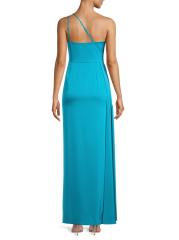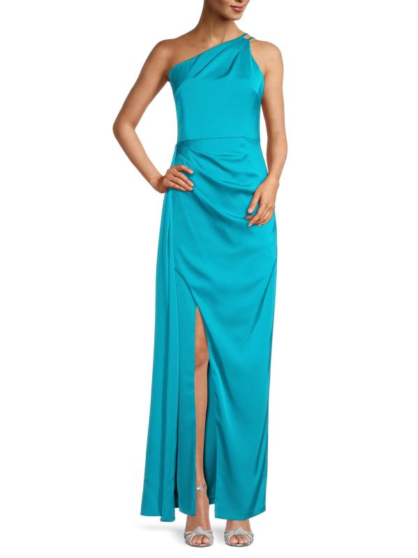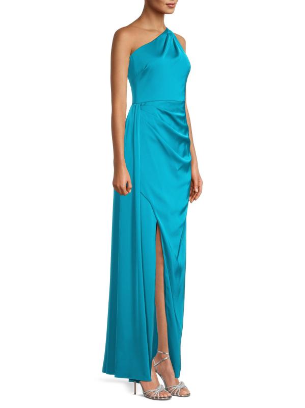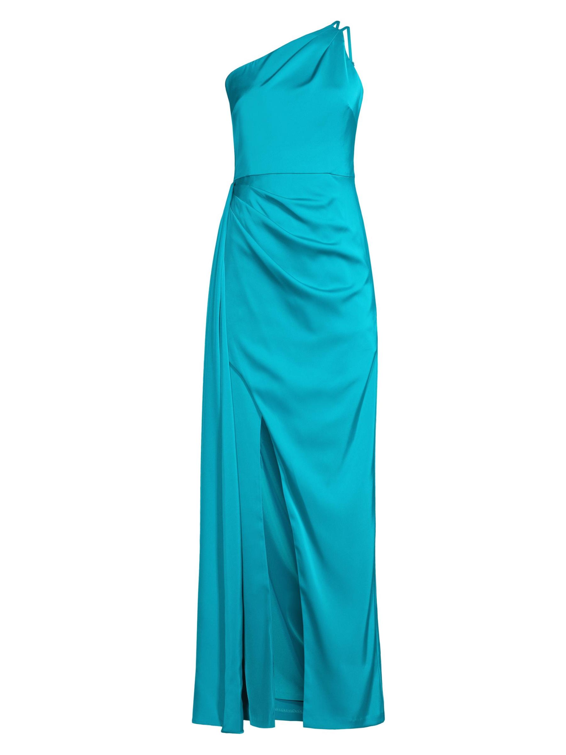 يشكل اللف المدروس شكل هذا الفستان الأنيق ذو الكتف الواحد.
