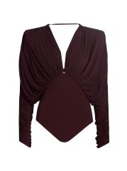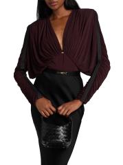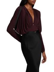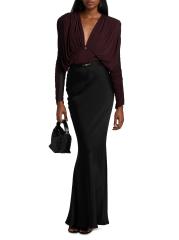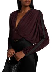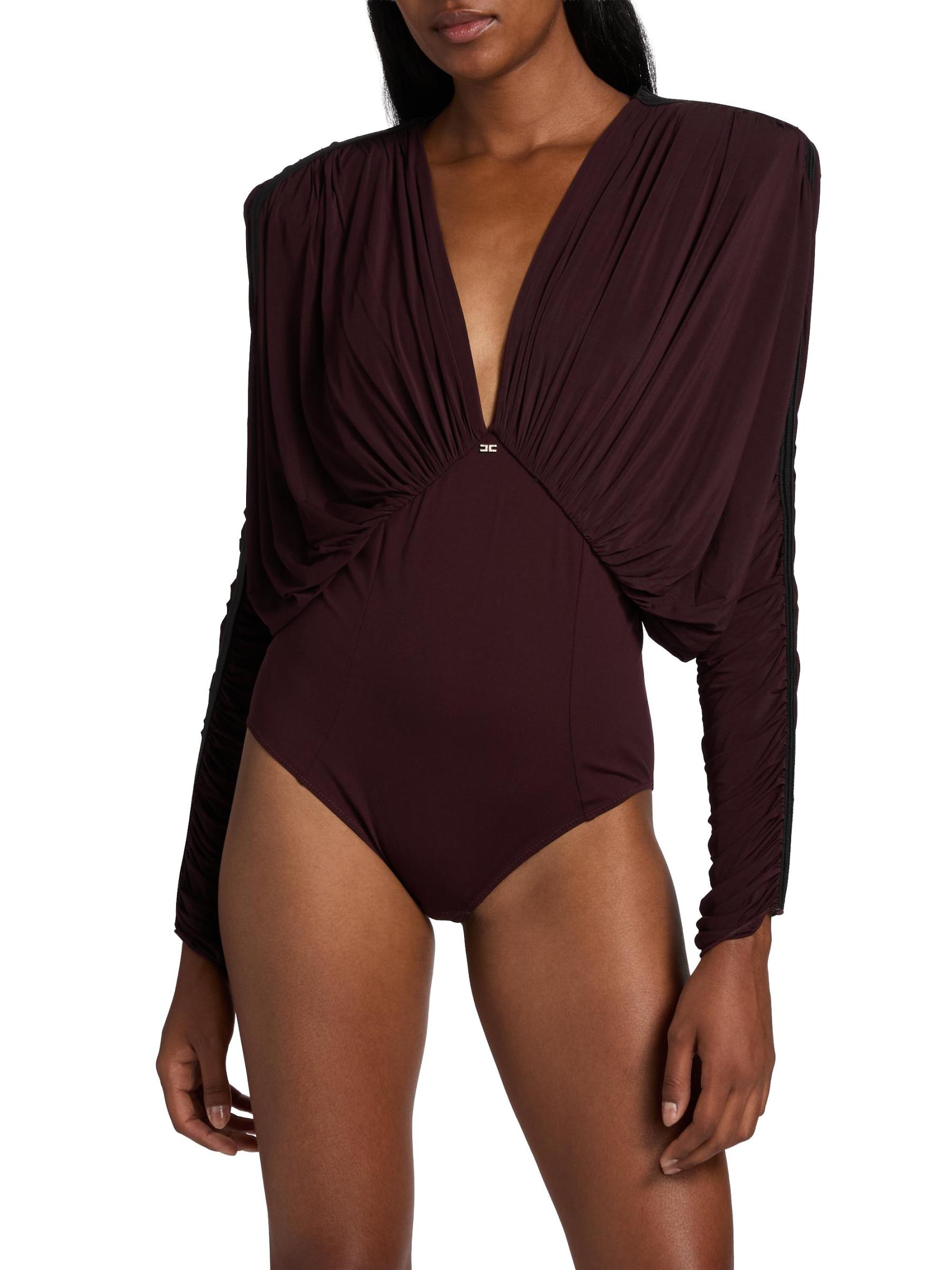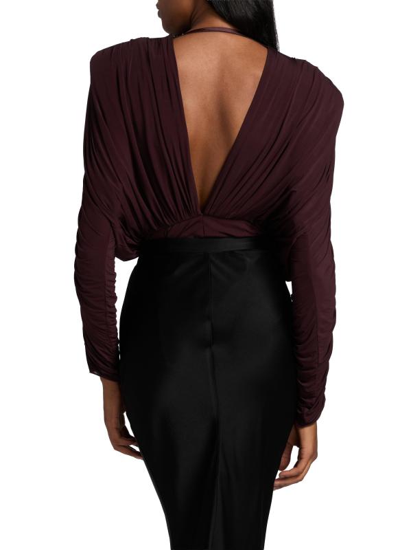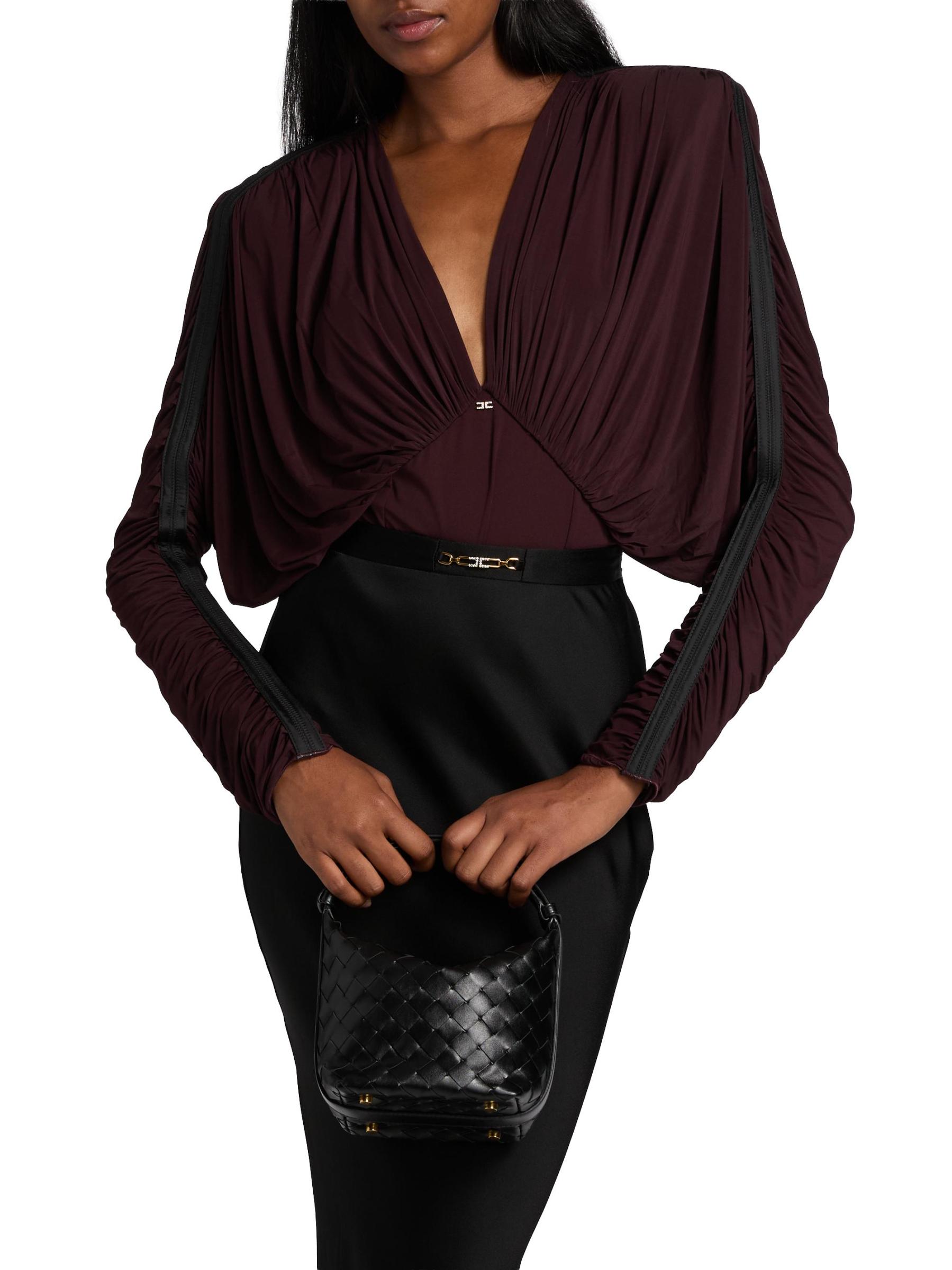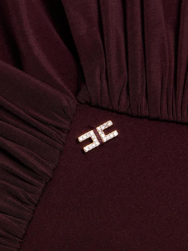 تتميّز بدلة Elisabetta Franchi الضيقة المصنوعة من الجيرسيه الإيطالي المرن بأكتاف مبطّنة منظّمة تتدفّق في شكل لف ناعم ومتقن. تم تحديد قاعدة الثوب بشرائط بخياطة مستوحاة من الكورسيت وتفاصيل الشعار المرصع بأحجار الراين.