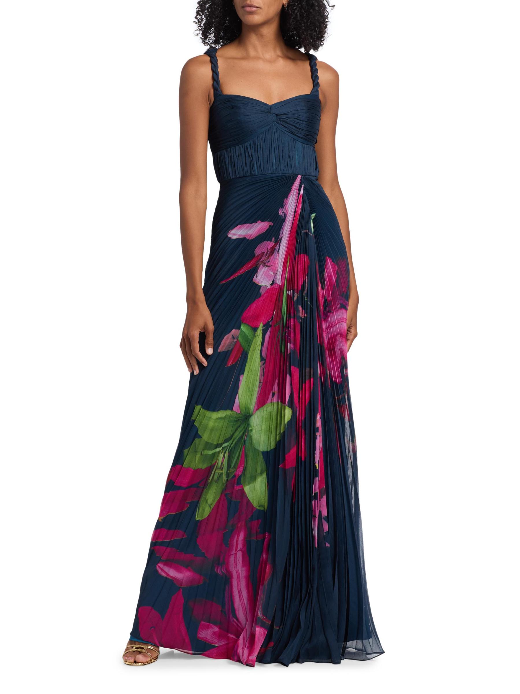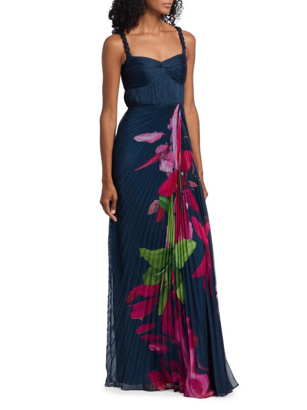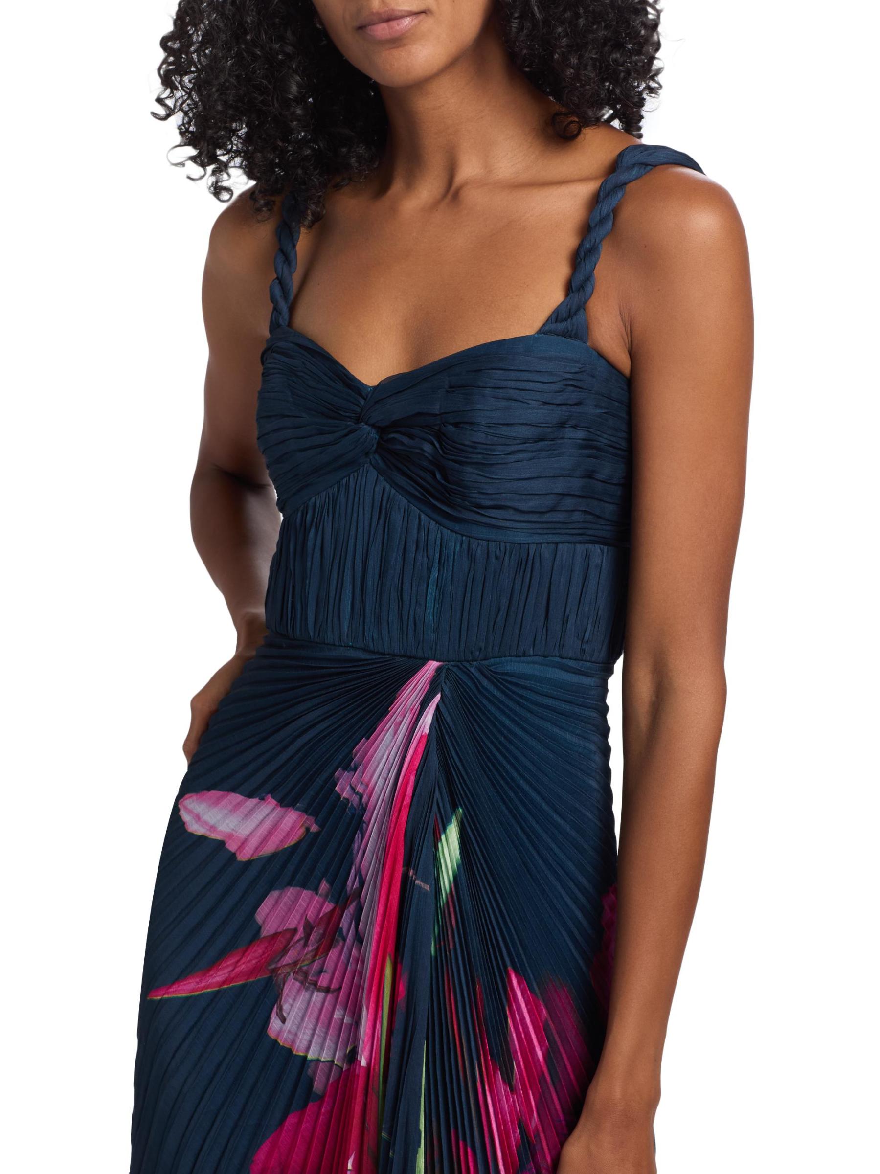 يتميز فستان Drea من Amur بزخارف نباتية نابضة بالحياة، ويتميز بأحزمة مضفرة، وصدر وصدر متجمعين، وتنورة ذات ثنيات أكورديون.
