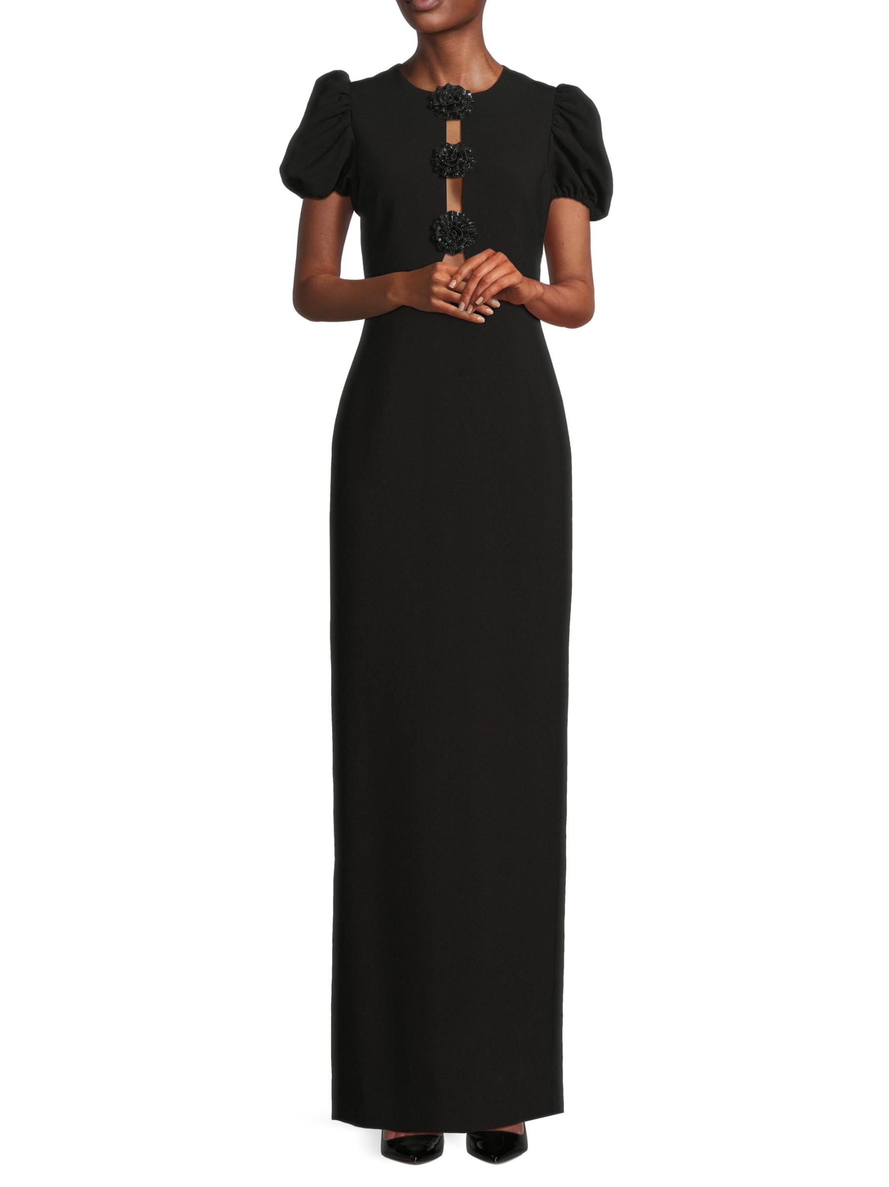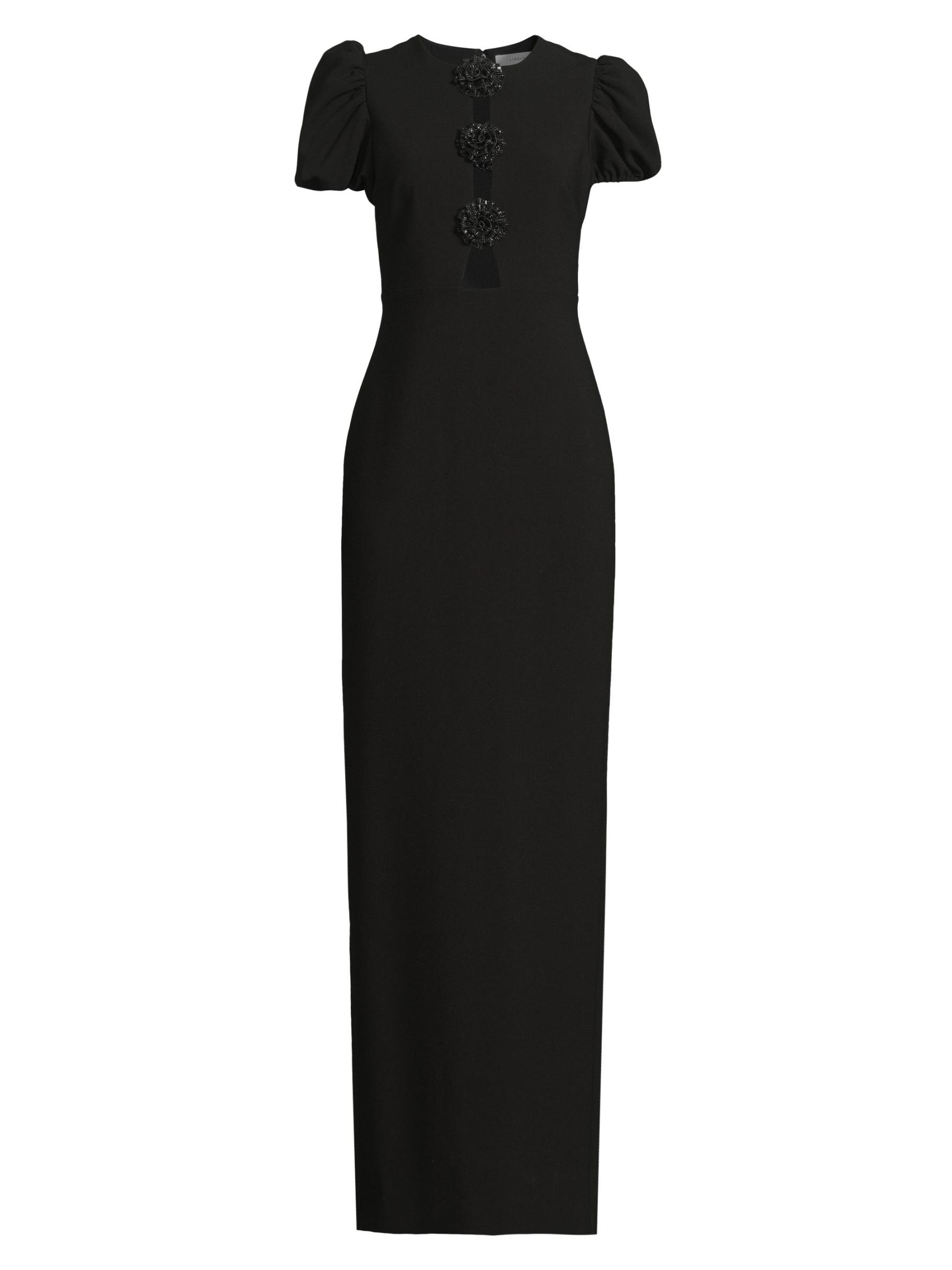 من مجموعة دروب 11. يتميّز فستان Griffen بأكمام منفوخة من Lilkely، المصنوع من مزيج قابل للتمدد، بوريدات مزيّنة بالكريستال في الأمام.