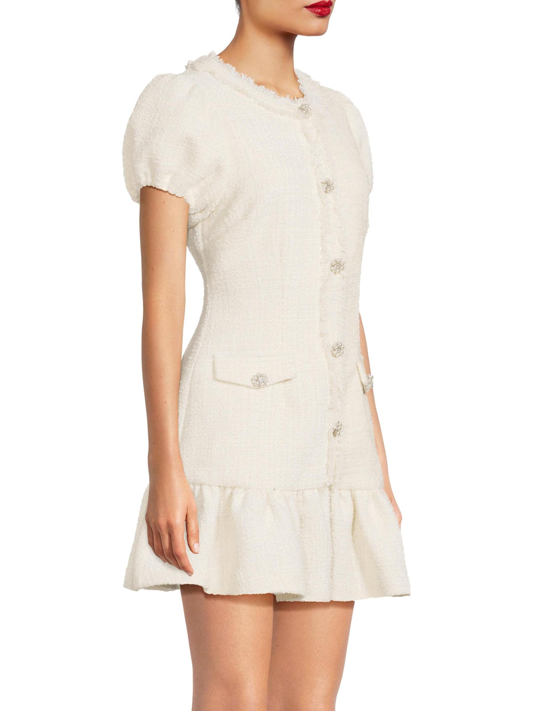 من مجموعة دروب 11. يتميز فستان سيرافين تويد الصغير من ليكي بأكمام قصيرة منفوخة وأزرار لؤلؤية مُزيّنة بالكريستال وحاشية منسدلة.