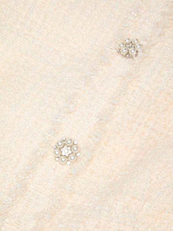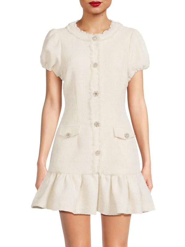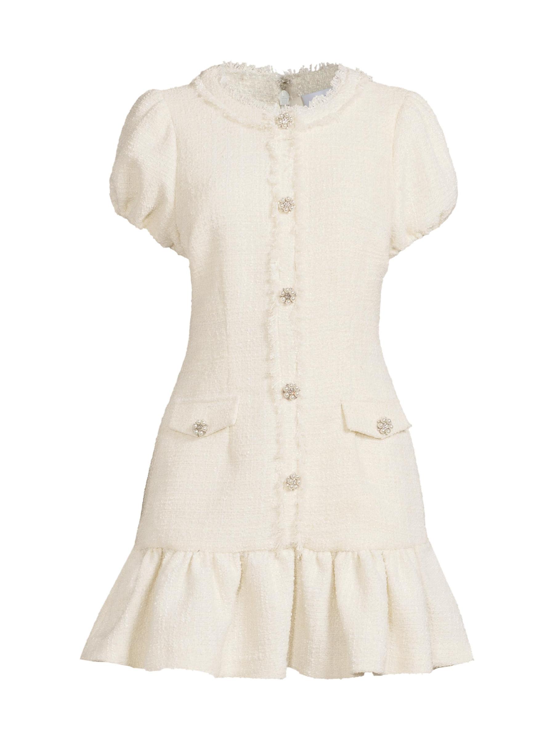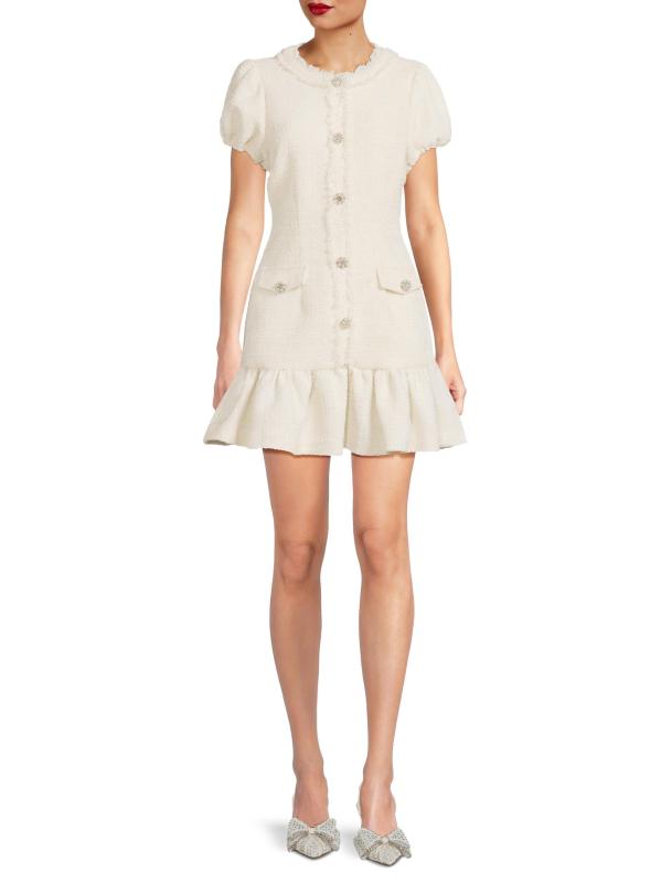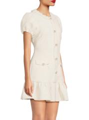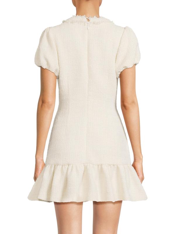 من مجموعة دروب 11. يتميز فستان سيرافين تويد الصغير من ليكي بأكمام قصيرة منفوخة وأزرار لؤلؤية مُزيّنة بالكريستال وحاشية منسدلة.رقبة مستديرة أكمام منفوخة حافة منفوشة إغلاق بسحّاب خلفي 90% بوليستر/ 10% صوف تنظيف جاف مستوردة