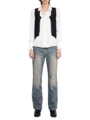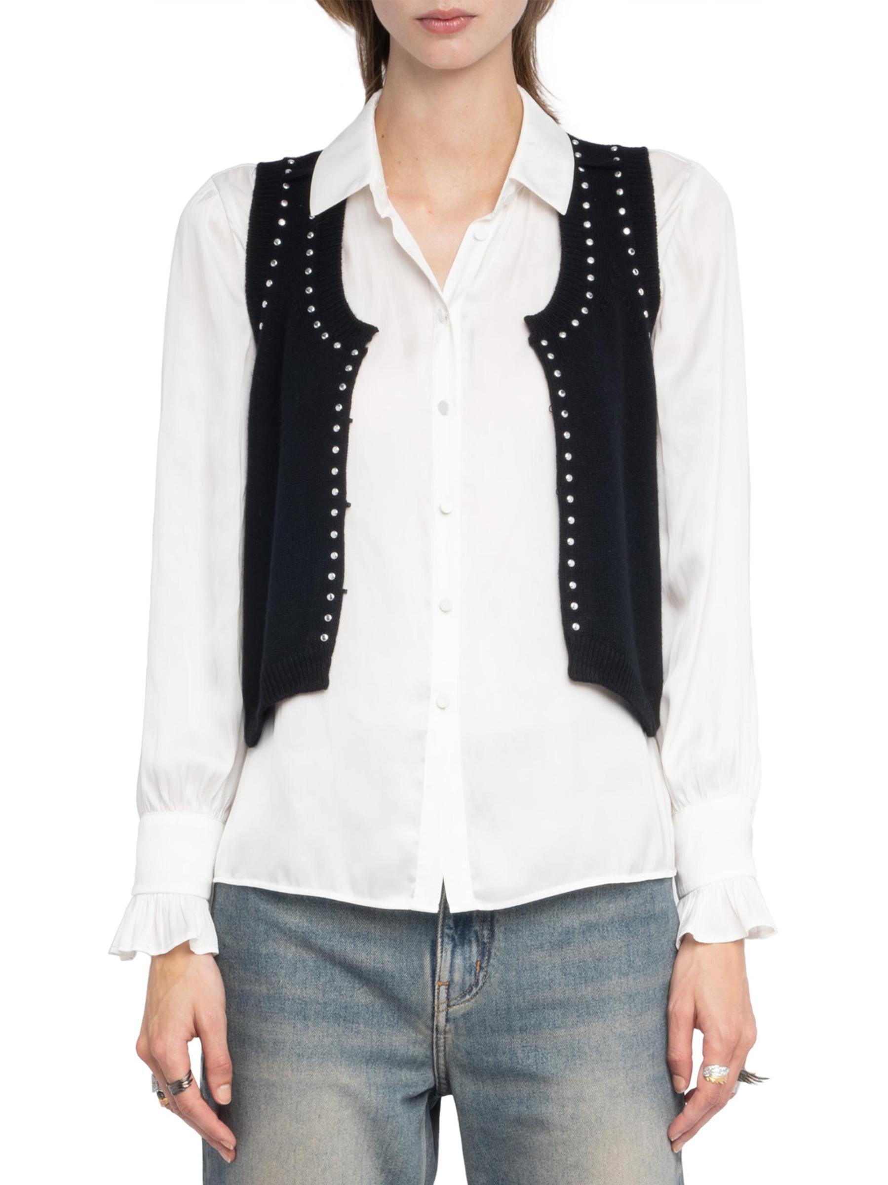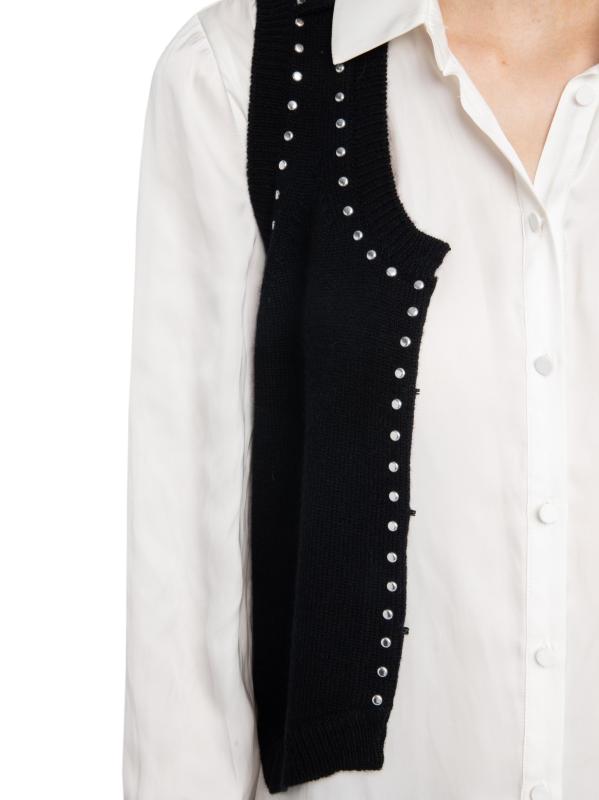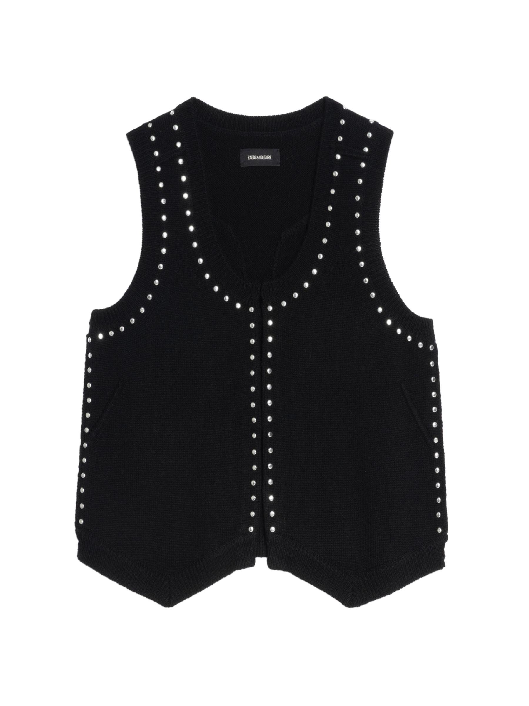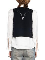 Voltaire من مزيج الصوف والكشمير، وتتميز بتفاصيل مرصعة.سكوبنك بدون أكمام إغلاق أمامي بخطاف وعروة 90% صوف/ 10% كاشمير يُغسل في الغسالة مستوردة