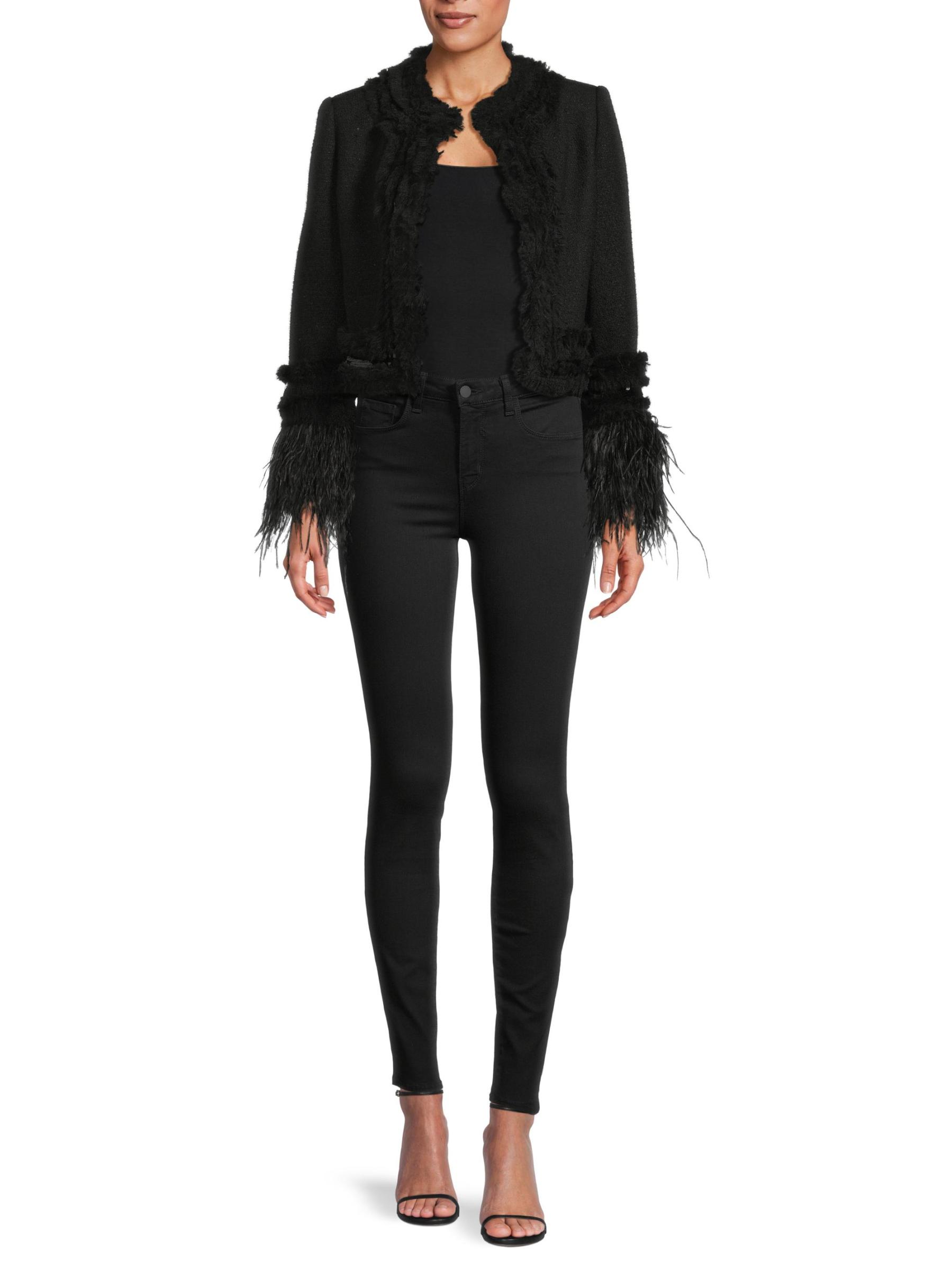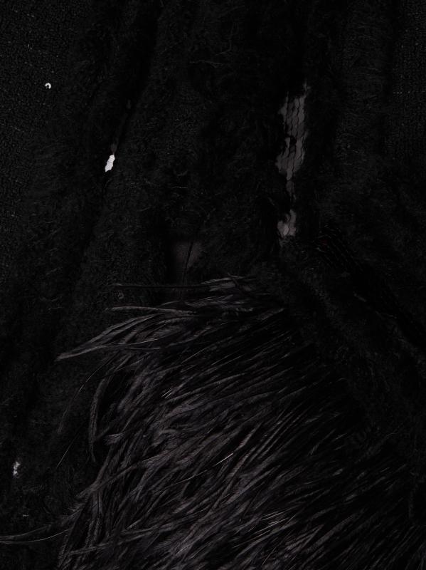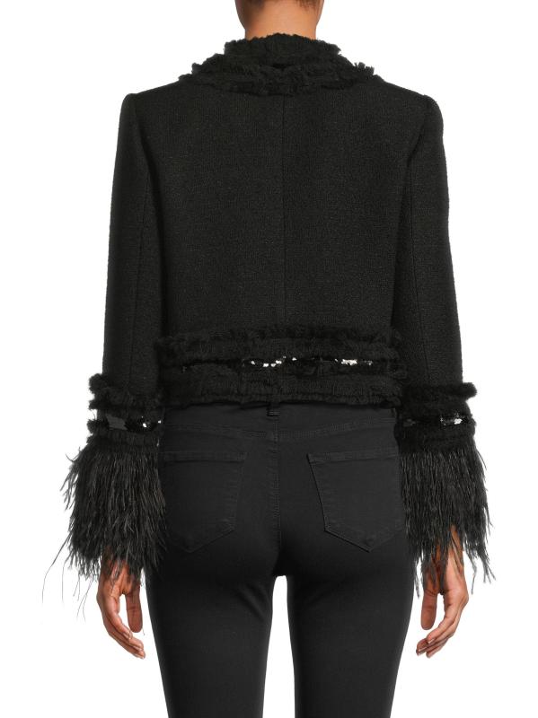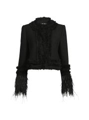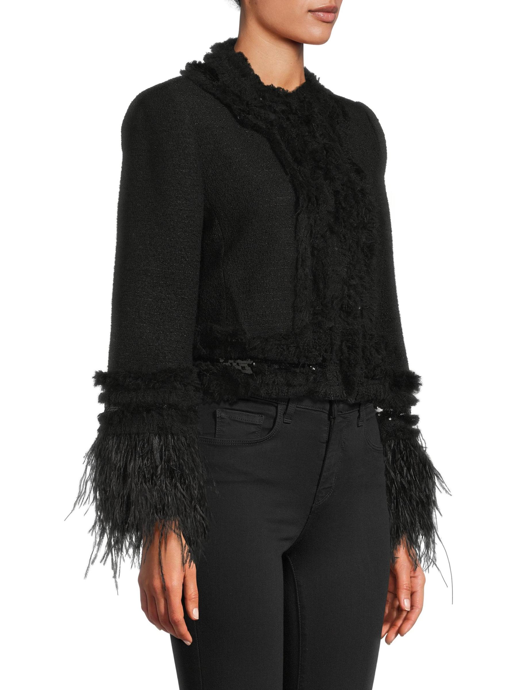 تتميّز سترة Dune القصيرة من Ungaro المصنوعة من التويد المطرّز بزخرفة من الدانتيل وأساور من الريش.