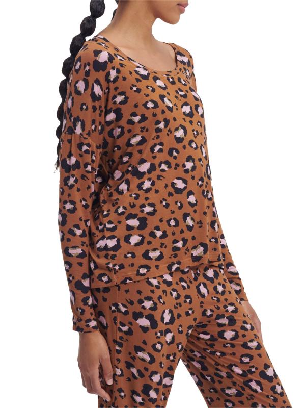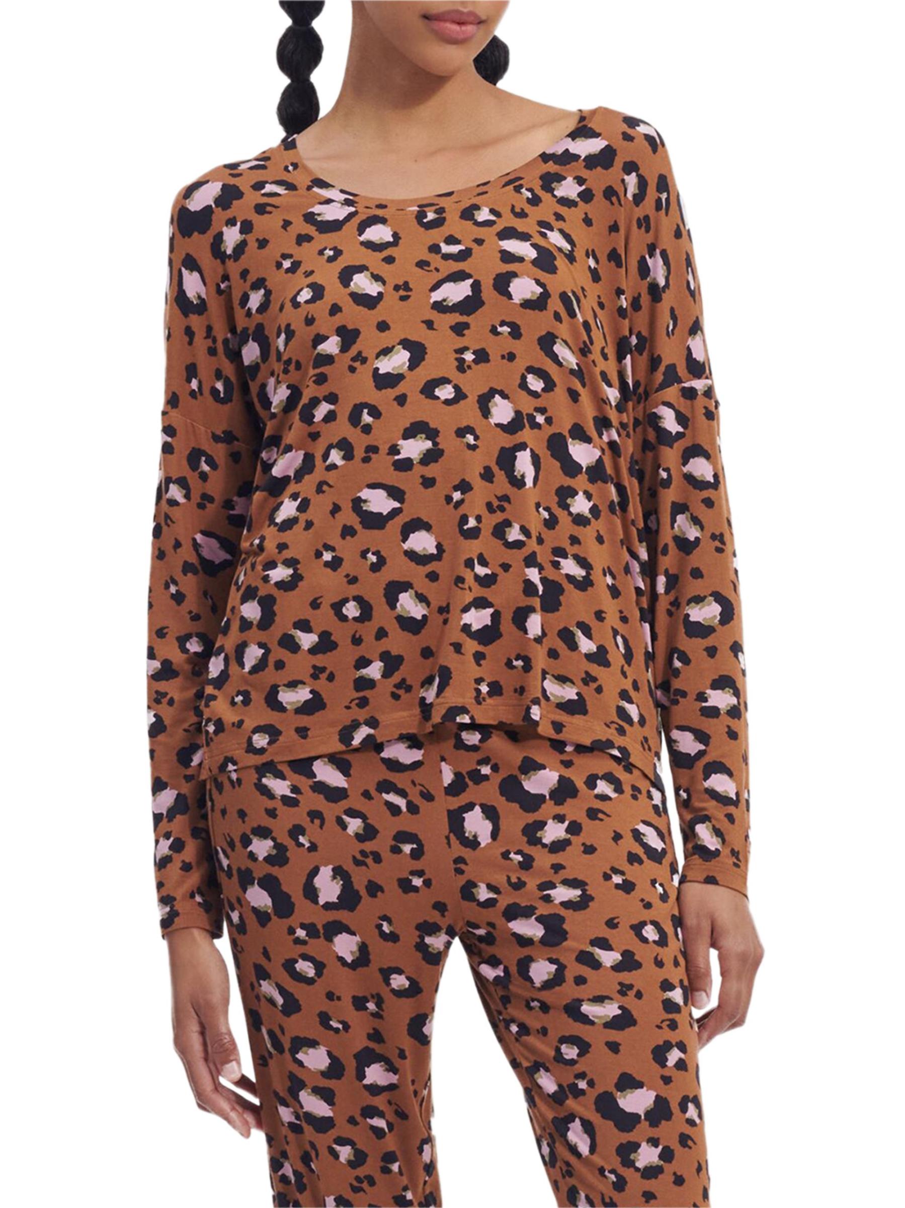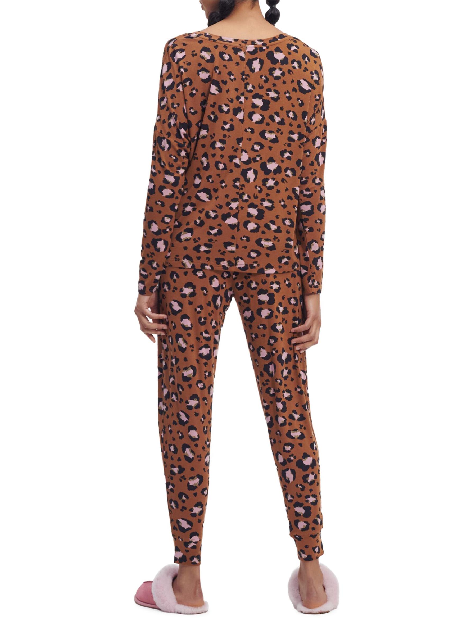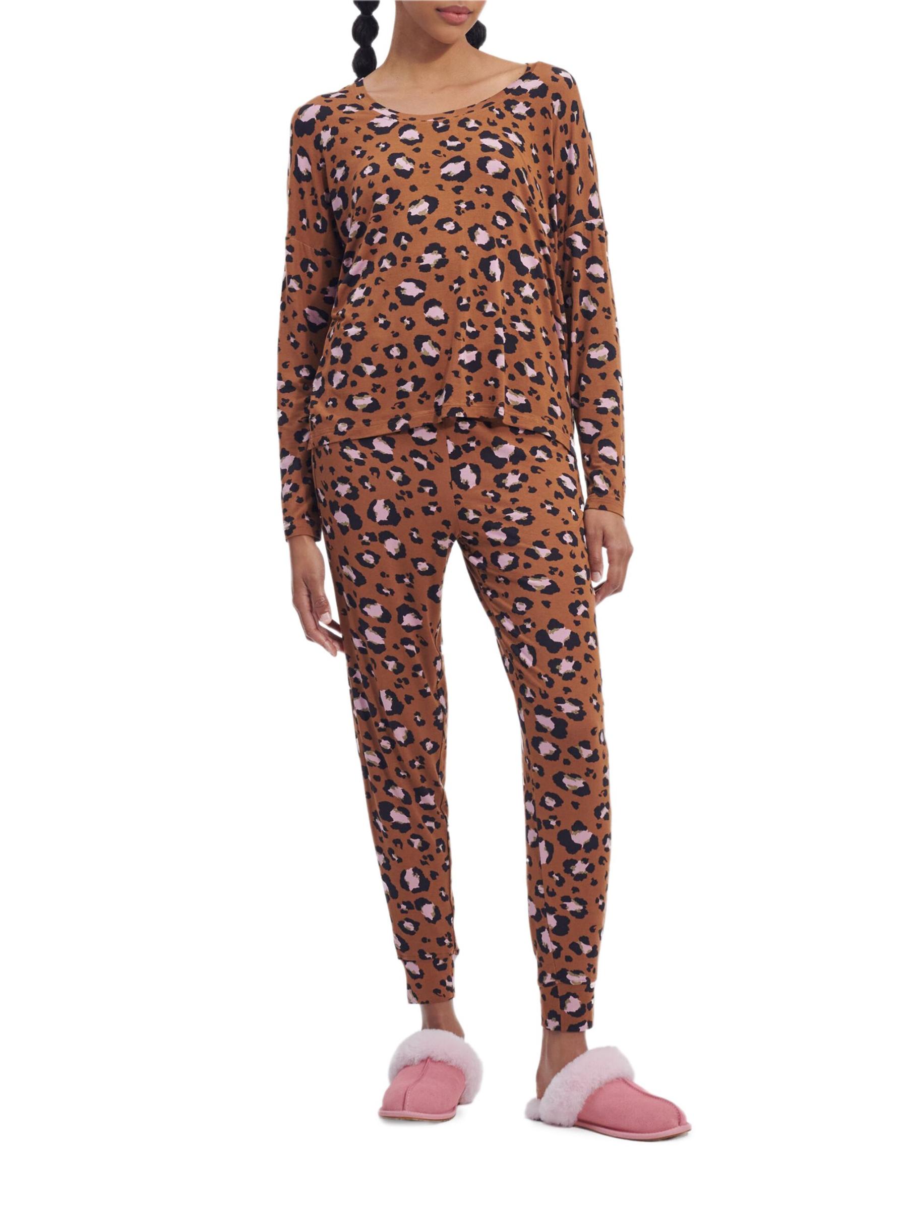 من مجموعة قمصان Ecovero™. طقم اللاونج المطبوع هذا من UGG مصنوع من ألياف الفسكوز Lenzing™ ecovero™ ويتميز بقميص برقبة دائرية وأكمام طويلة وبنطال بخصر برباط. 95% قطن/ 5% إيلاستين. يُغسل في الغسالة. مستوردة.